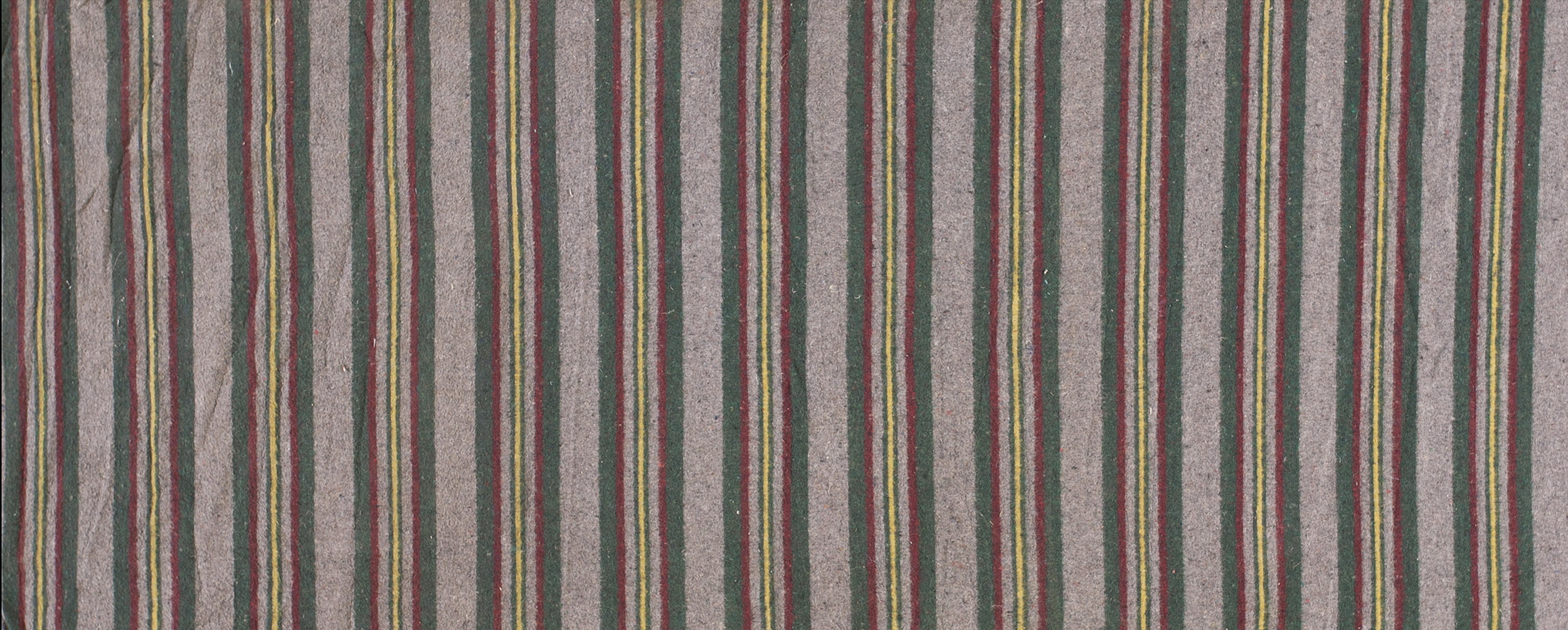 The design is characterized by a strong vertical stripe pattern, offering a sophisticated linearity suitable for both modern and traditional interiors. The dominant field is a soft, heathered taupe, providing a neutral backdrop for the alternating bands of color. These accents—deep forest green, muted crimson, and fine yellow pinstripes—create a subtle, yet rich, palette, classifying it among multicolor jewel tone rugs.