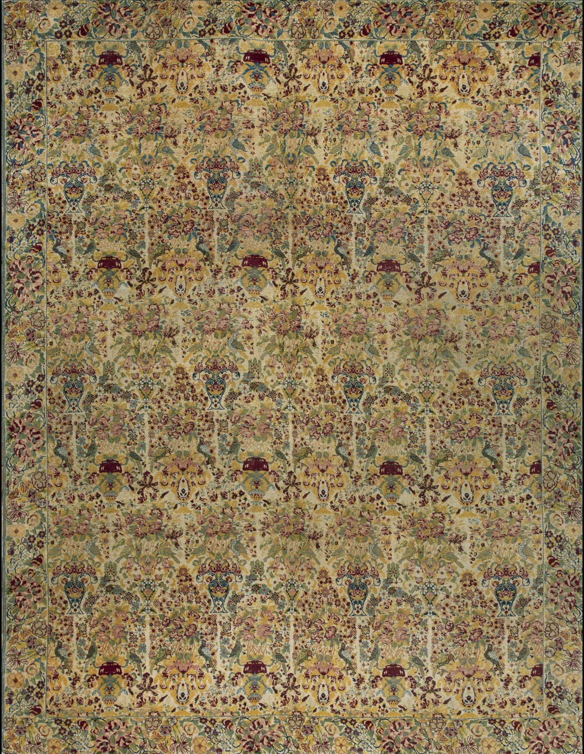 The field is rendered in a luminous, softly aged ivory and cream palette, providing a delicate canvas for the profusion of botanical detail. This subtle ground color ensures the rug retains a light, airy presence despite the inherent density of the overall pattern, softening the visual impact of the complex motifs.