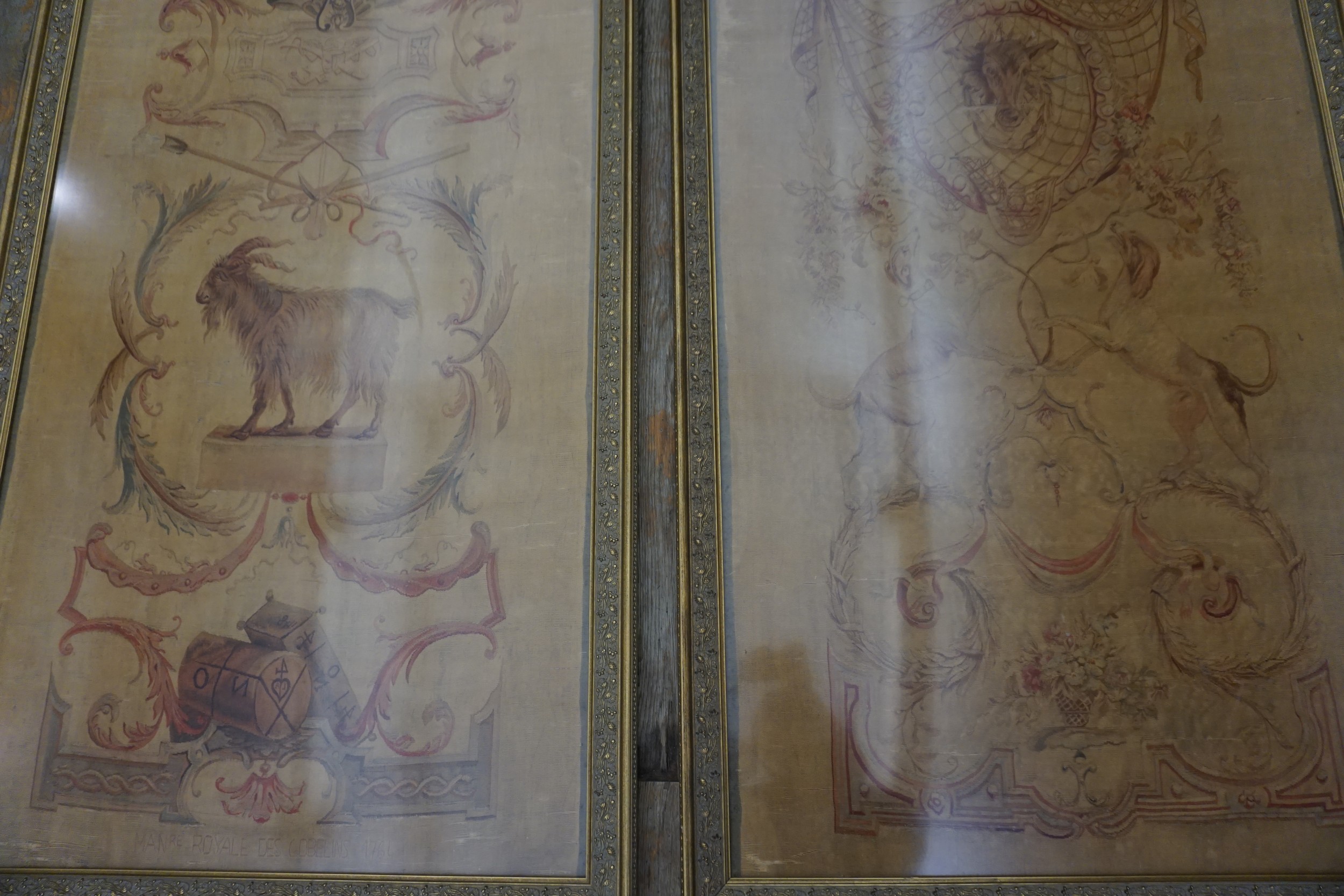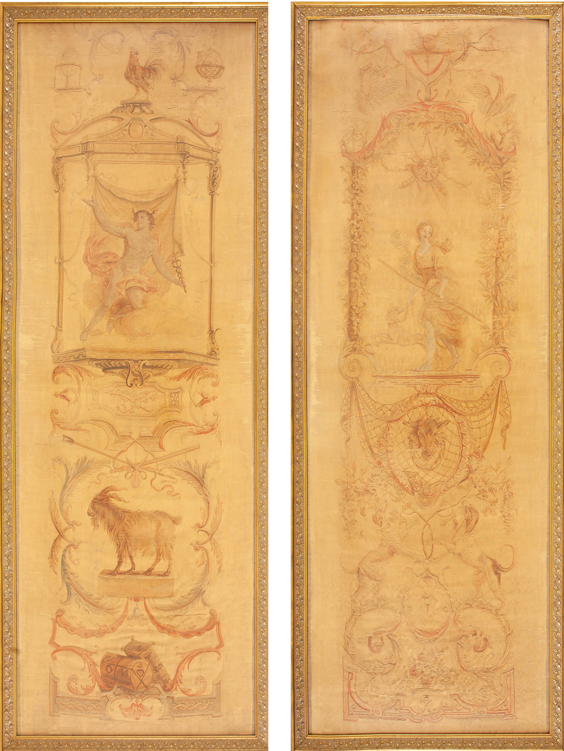 The design centers on a naturalistic depiction of a long-haired goat or ibex, standing upon a classical plinth. This central medallion is framed by highly detailed scrolling acanthus leaves, ribbons, and elaborate drapery swags, executed with a painterly precision typical of the finest French court workshops. The composition is masterfully balanced, creating a sense of theatrical grandeur despite the textile’s intimate scale.