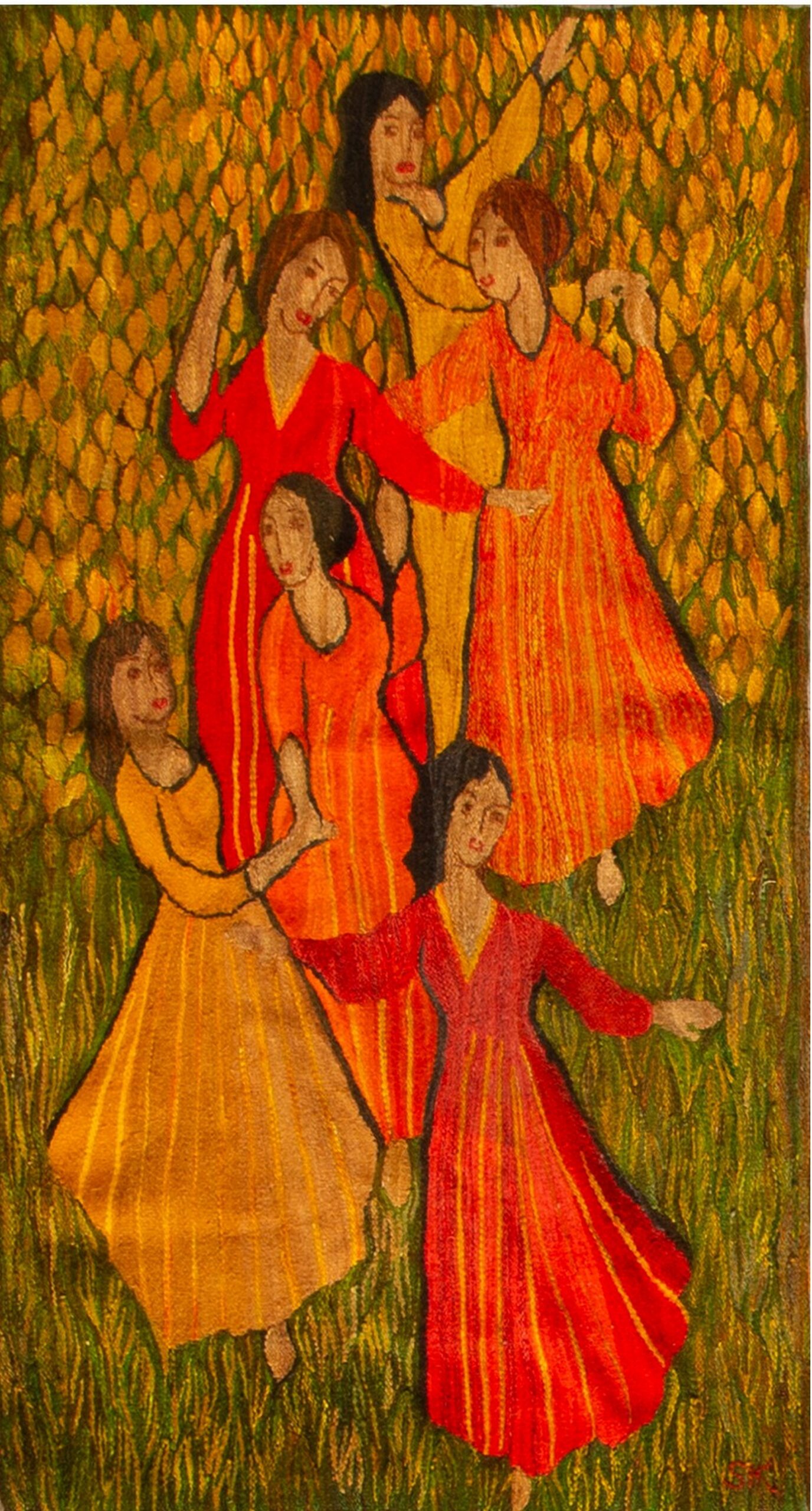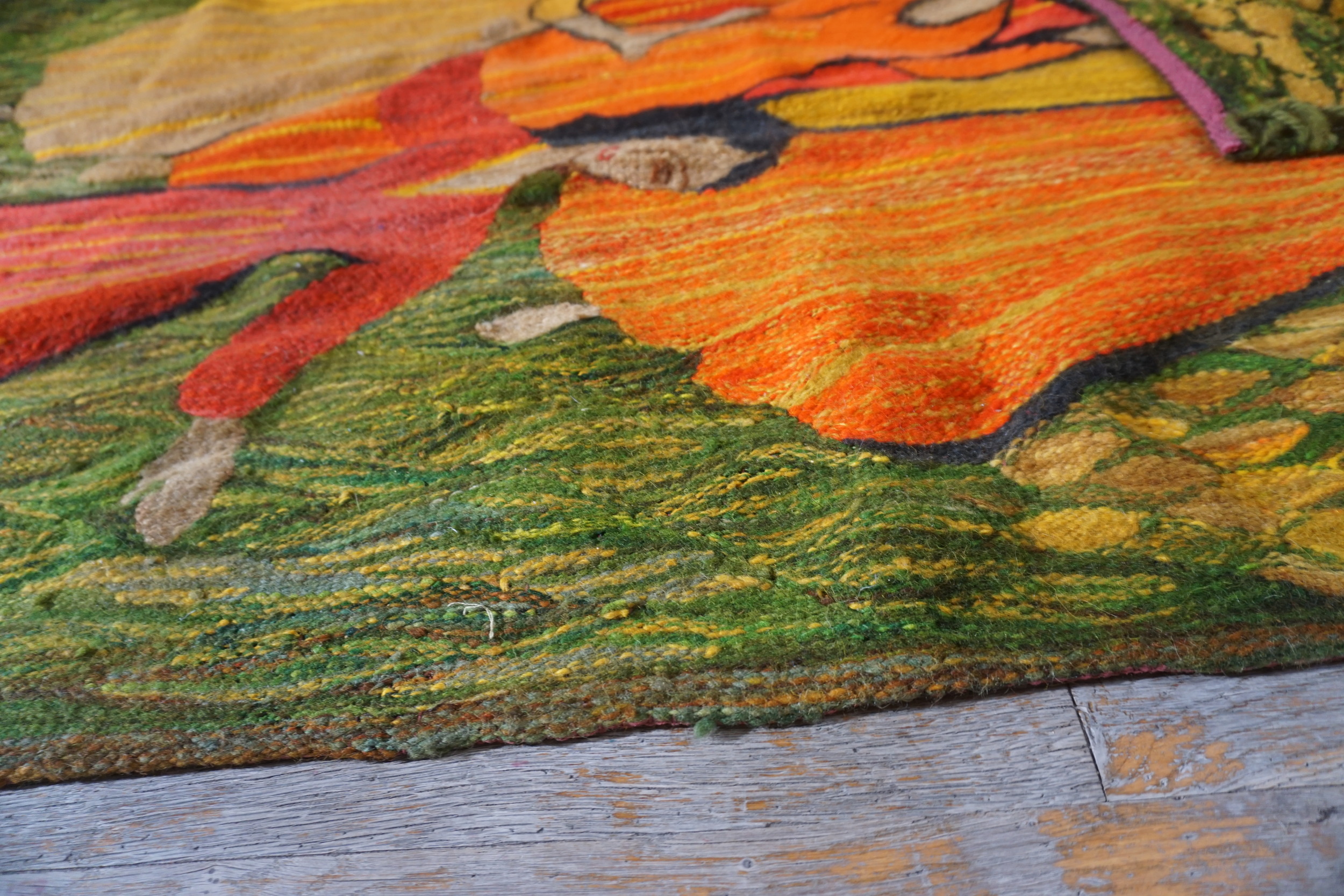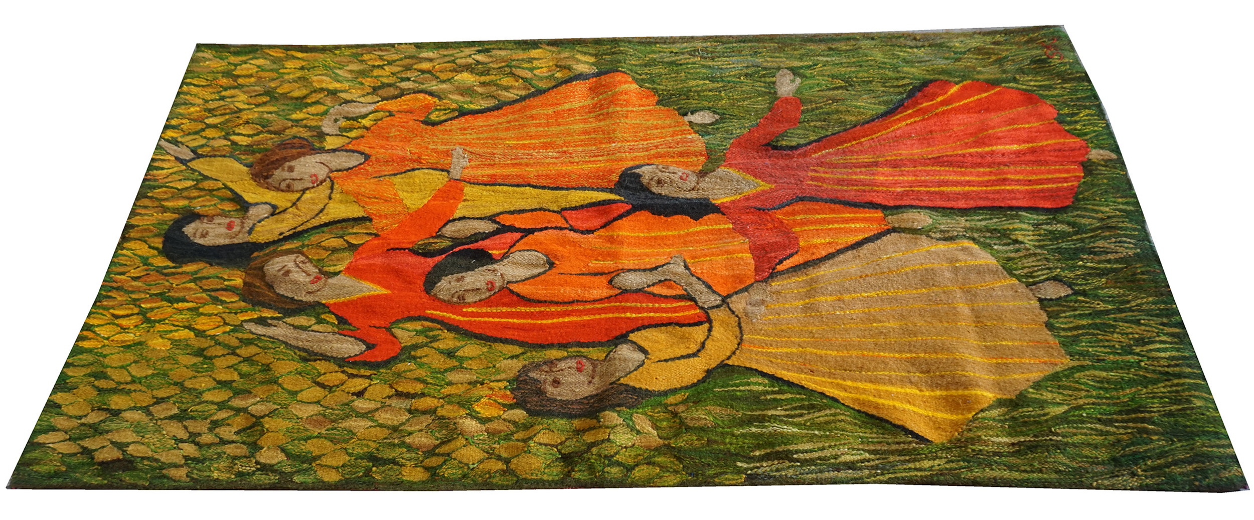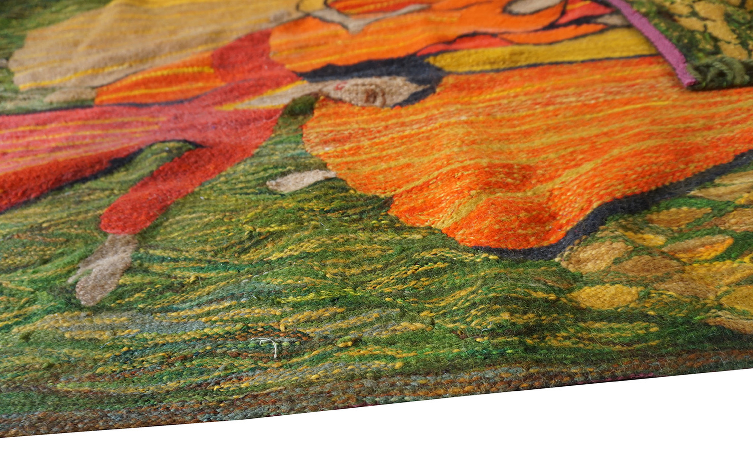 The palette is dominated by rich, earthy tones, featuring figures rendered in brilliant vermillion and ochre, set against a highly textured field of foliage. The inclusion of deep moss and chartreuse provides a grounding contrast, making this a compelling piece for collectors seeking green color rugs with significant artistic depth.