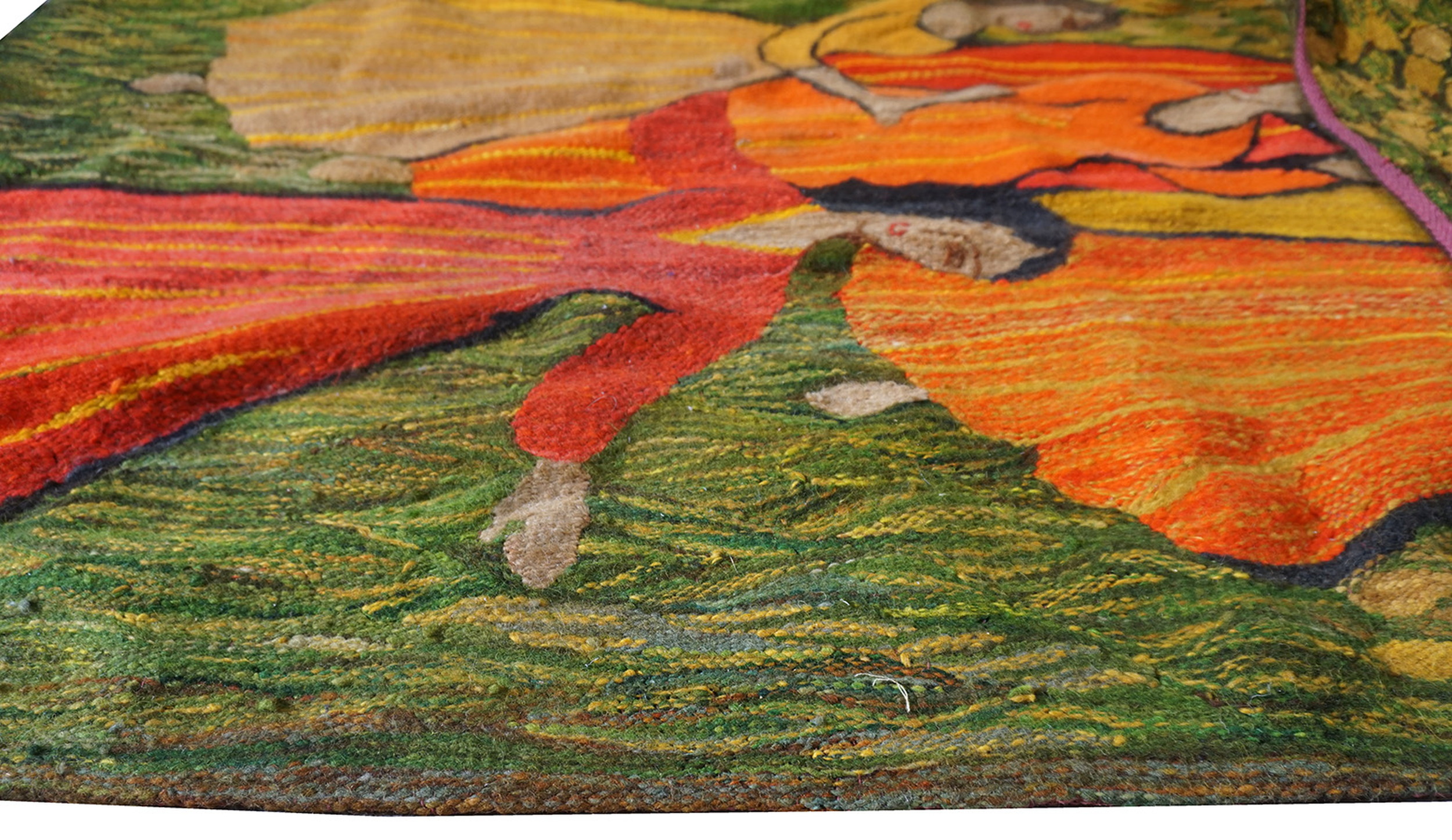 Unlike traditional medallion formats, the composition utilizes an expressive, almost painterly technique where the figures and the surrounding environment fill the entire frame. This dynamic presentation creates a captivating allover rugs effect, suggesting movement and celebration captured permanently in woven form.