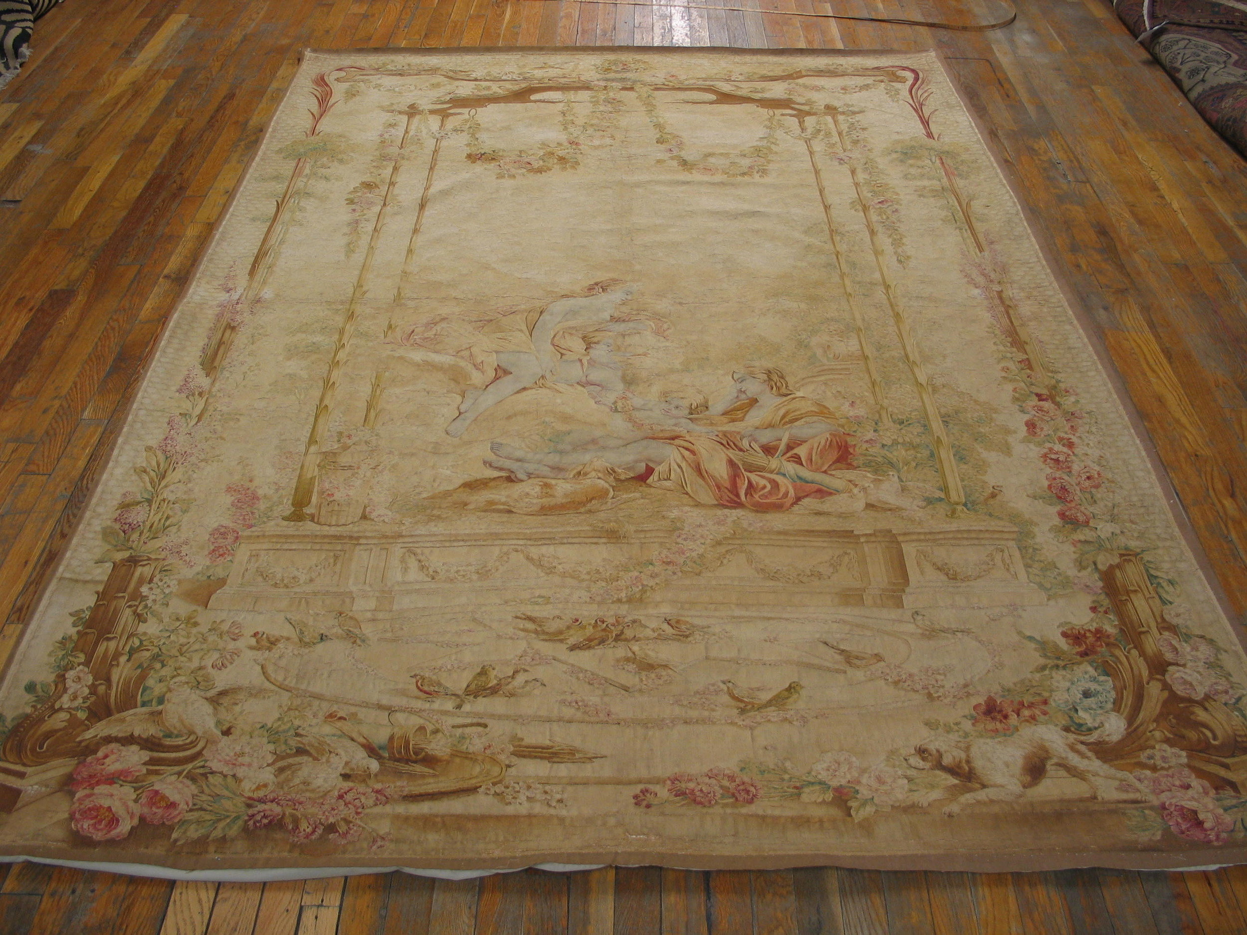 Antique Tapestry French Ivory 1750s Rug, Circa Date: 1750s. This exceptional tapestry exemplifies the height of Rococo artistry during the reign of Louis XV. Woven in France, likely for a noble residence, it transcends the definition of floor covering, presenting instead a monumental, woven painting.