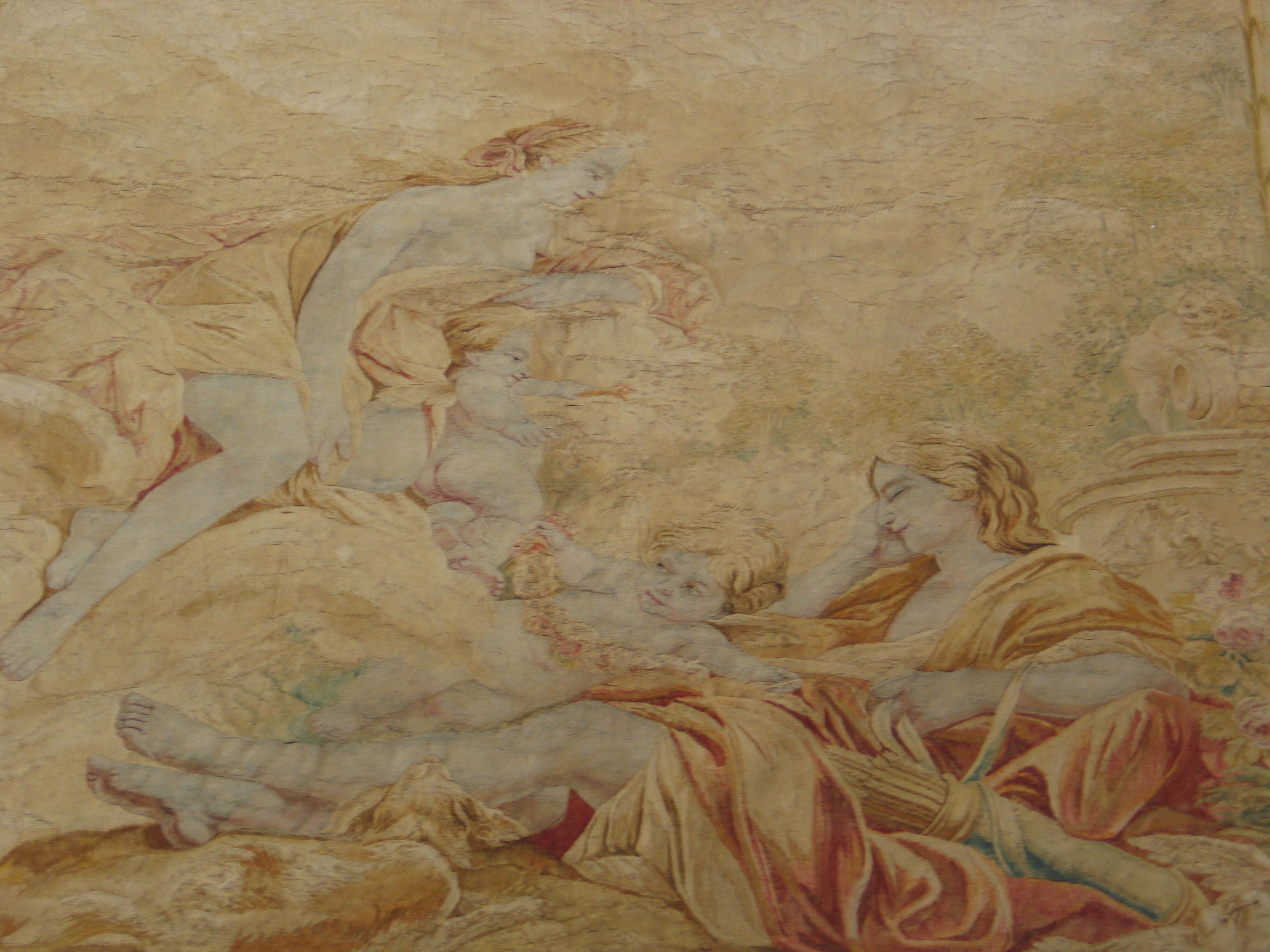 The composition features a mythological or pastoral scene rendered in remarkably fine detail, framed by an architectural trellis draped with garlands. The gentle, faded hues are anchored by a soft ivory ground, lending the piece an ethereal quality characteristic of mid-18th century French design.