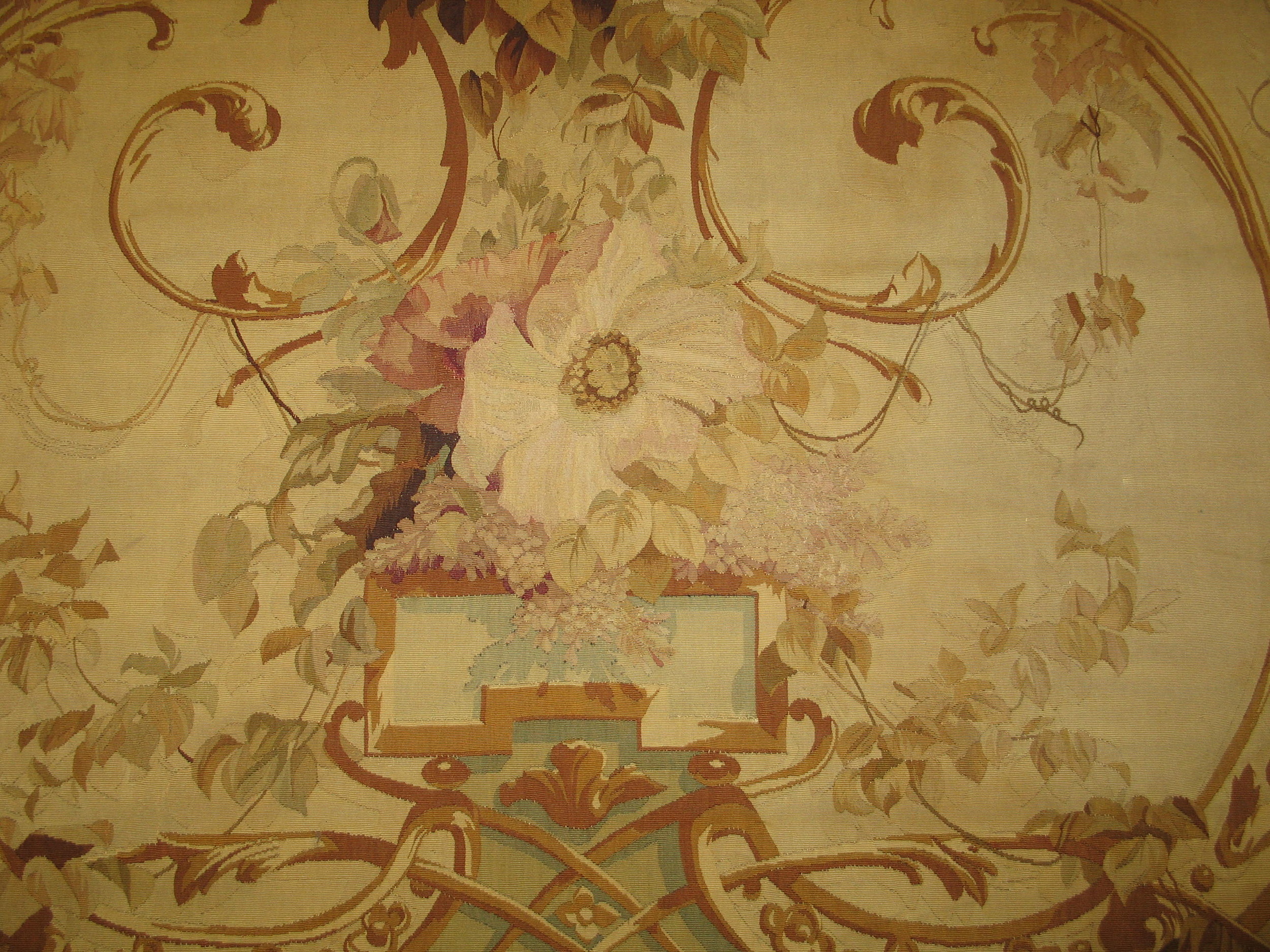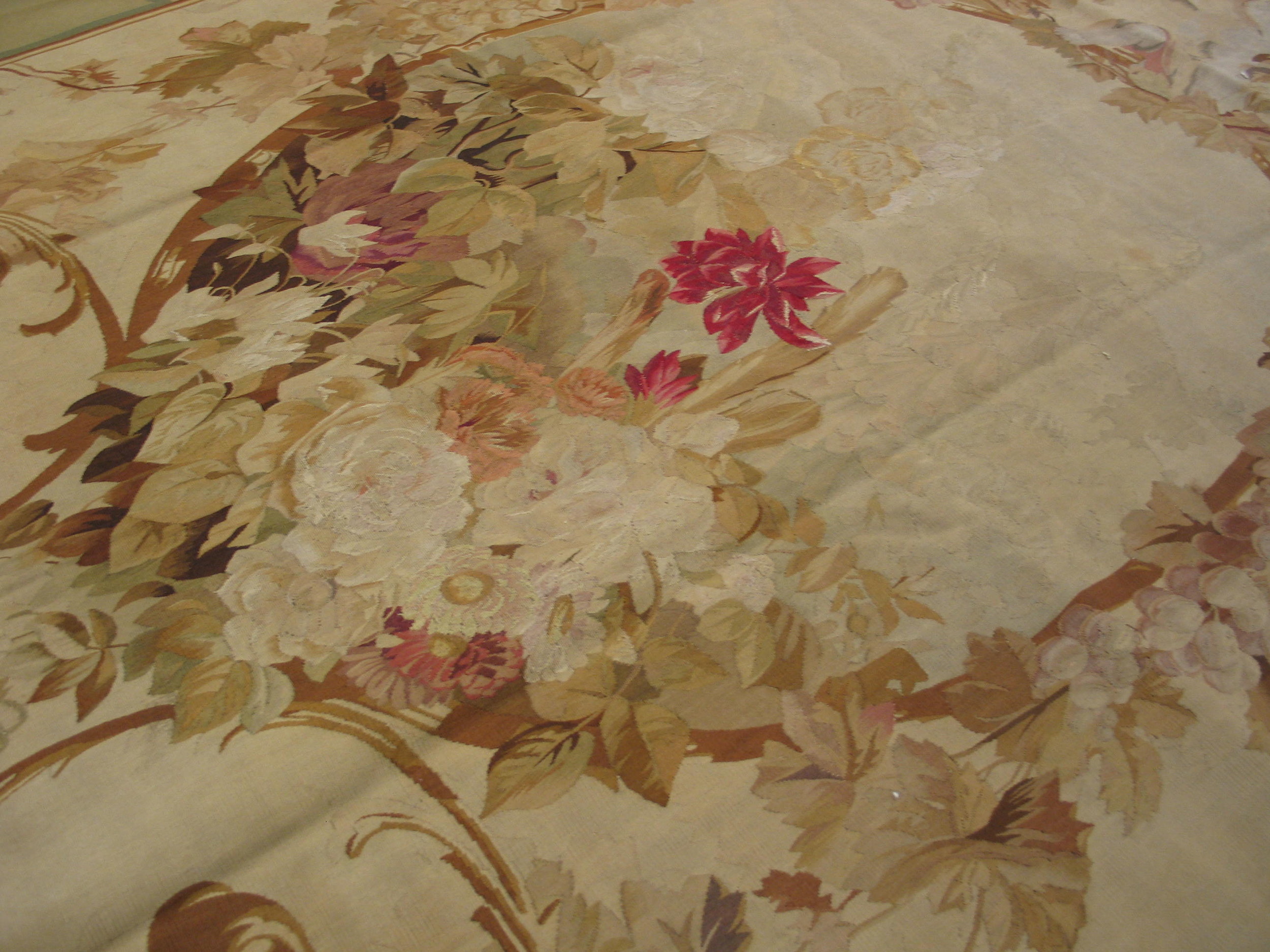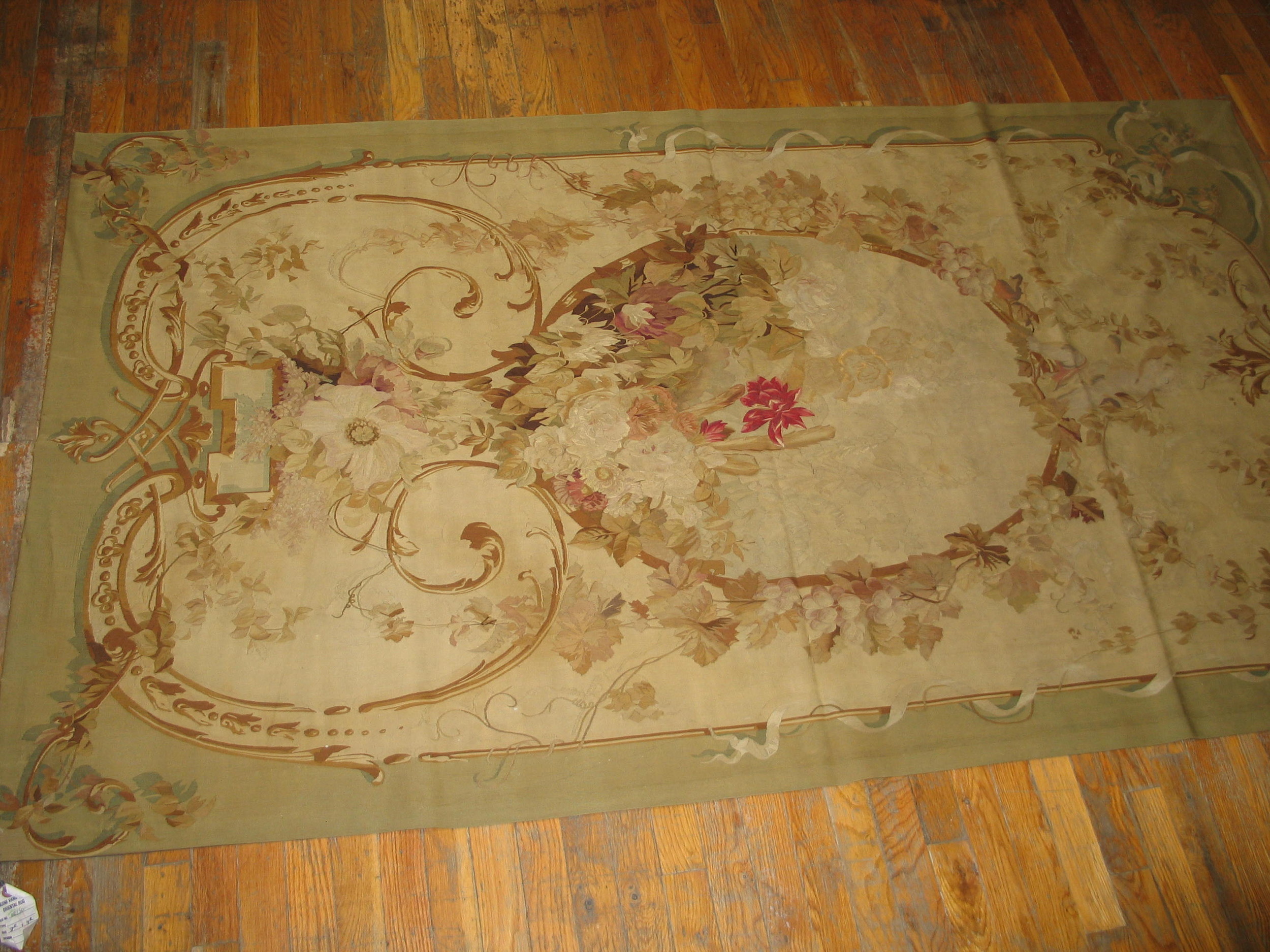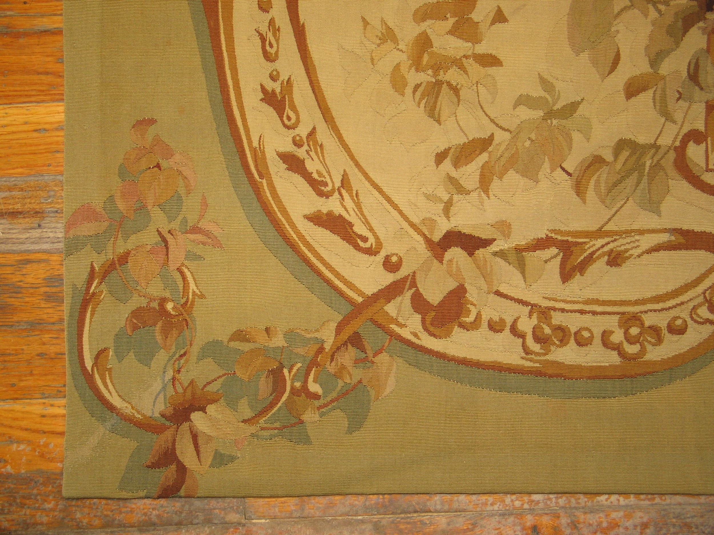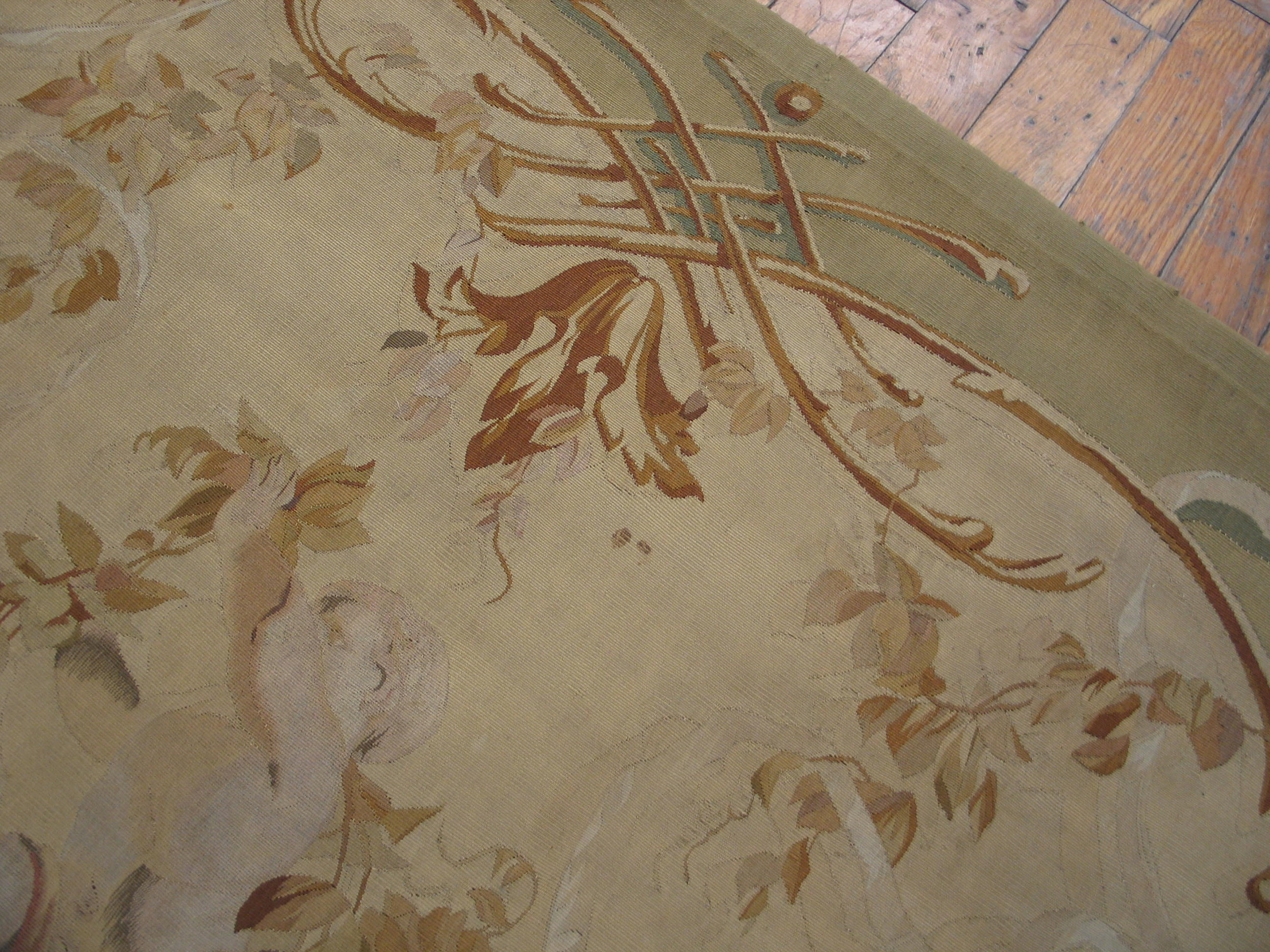 Antique Tapestry French Knotted Rug, Country of Origin: France, Circa Date: 1900s. This exceptional piece exemplifies the elegance inherent in early 20th-century French rugs. It is executed with the meticulous detail of a woven tapestry, yet retains the luxurious pile and handle of a finely knotted carpet, offering a sophisticated aesthetic suitable for a variety of placements.