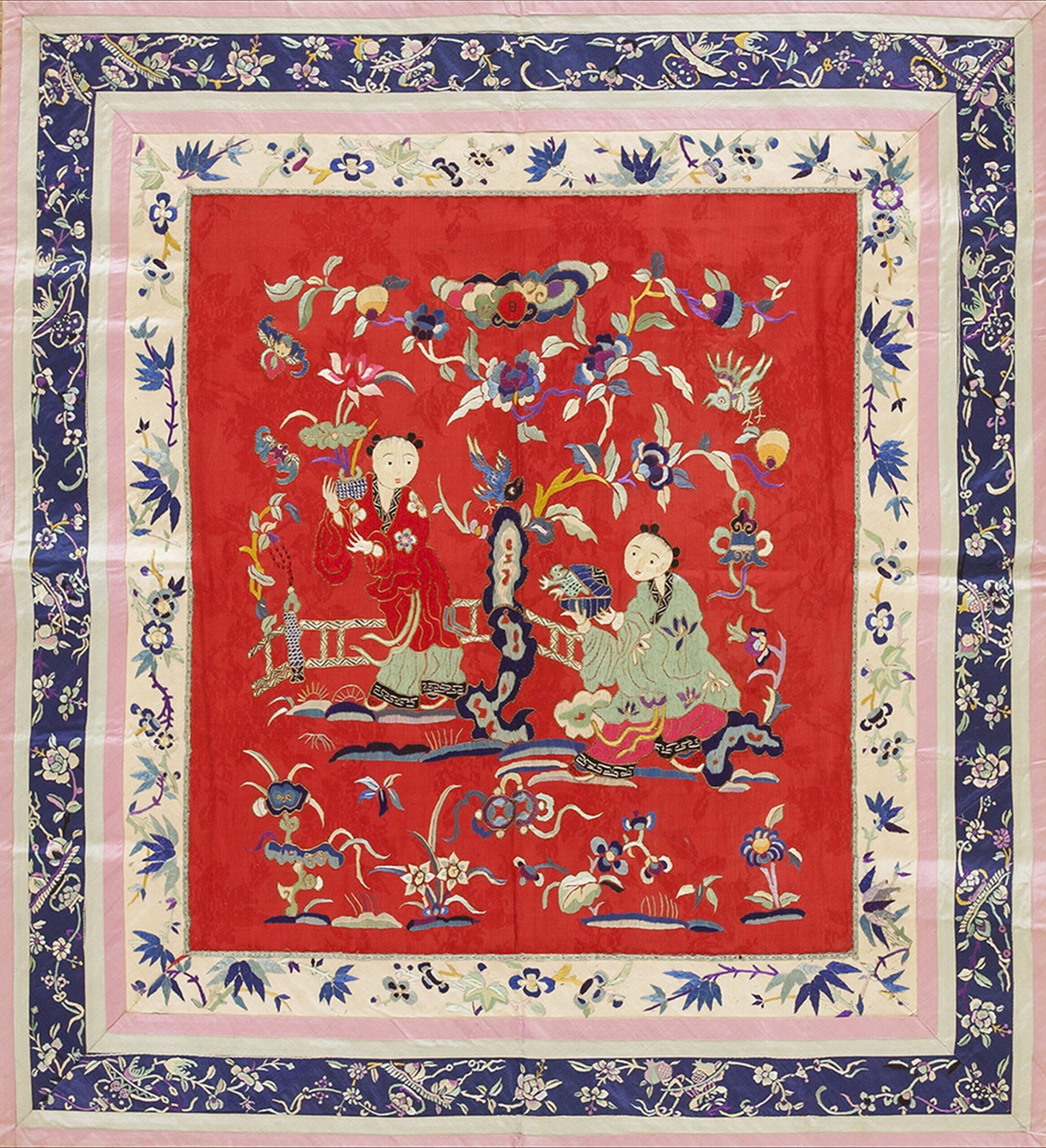 The central composition is defined by a saturated, rich red field that serves as a dramatic backdrop for the intricate needlework. Two figures, possibly women or children, are depicted amidst an abundance of auspicious flowers, birds, and stylized clouds, rendered in delicate shades of pale blue, sage green, and ivory, suggesting a scene of prosperity and tranquility.