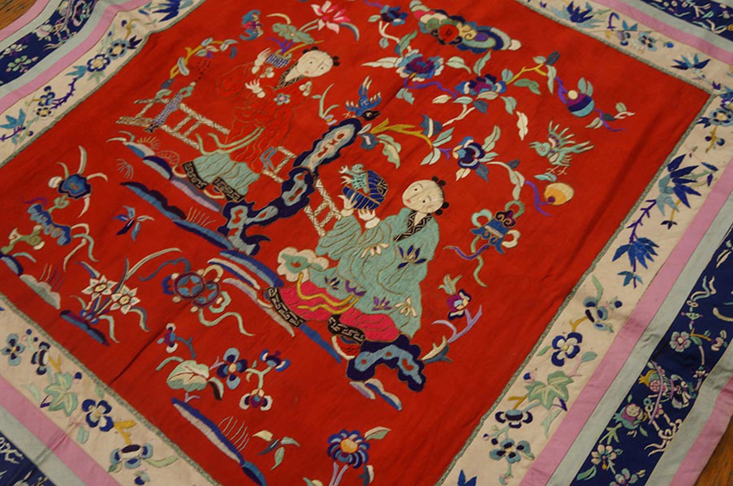 Vintage Textile Chinese Allover Floral Red 1950s Rug, Circa Date: 1950s. This exceptional Chinese textile presents a vibrant, pictorial scene executed in fine silk embroidery. Dating to the mid-20th century, it is a striking example of vintage area rugs that capture traditional Chinese decorative motifs with modern vibrancy.