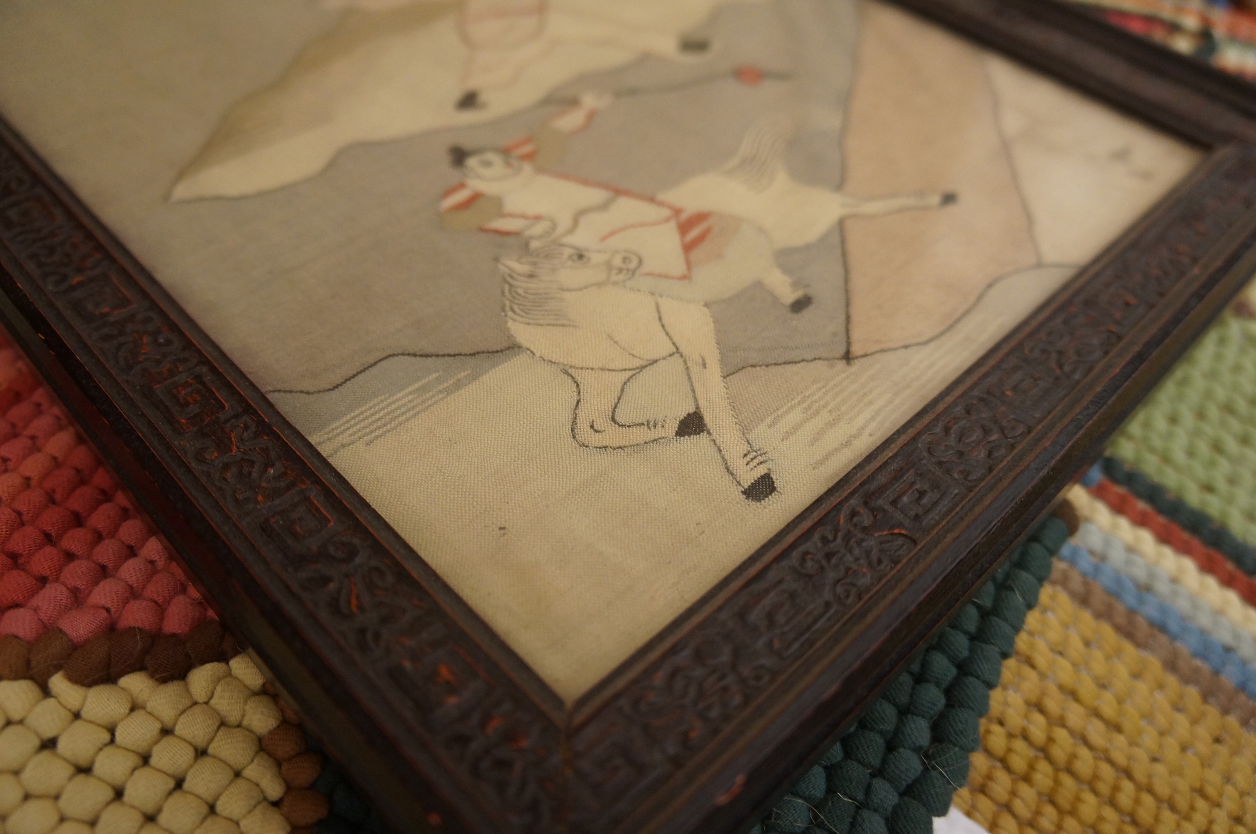 Unlike typical medallion formats, this piece employs an unusual allover rug composition where the figures and abstract landscape elements fill the entire field. The dynamic movement of the two central characters suggests a mythological or historical depiction, captured with a graphic simplicity that foreshadows early 20th-century design trends and the subsequent Art Deco influence on Asian textiles.