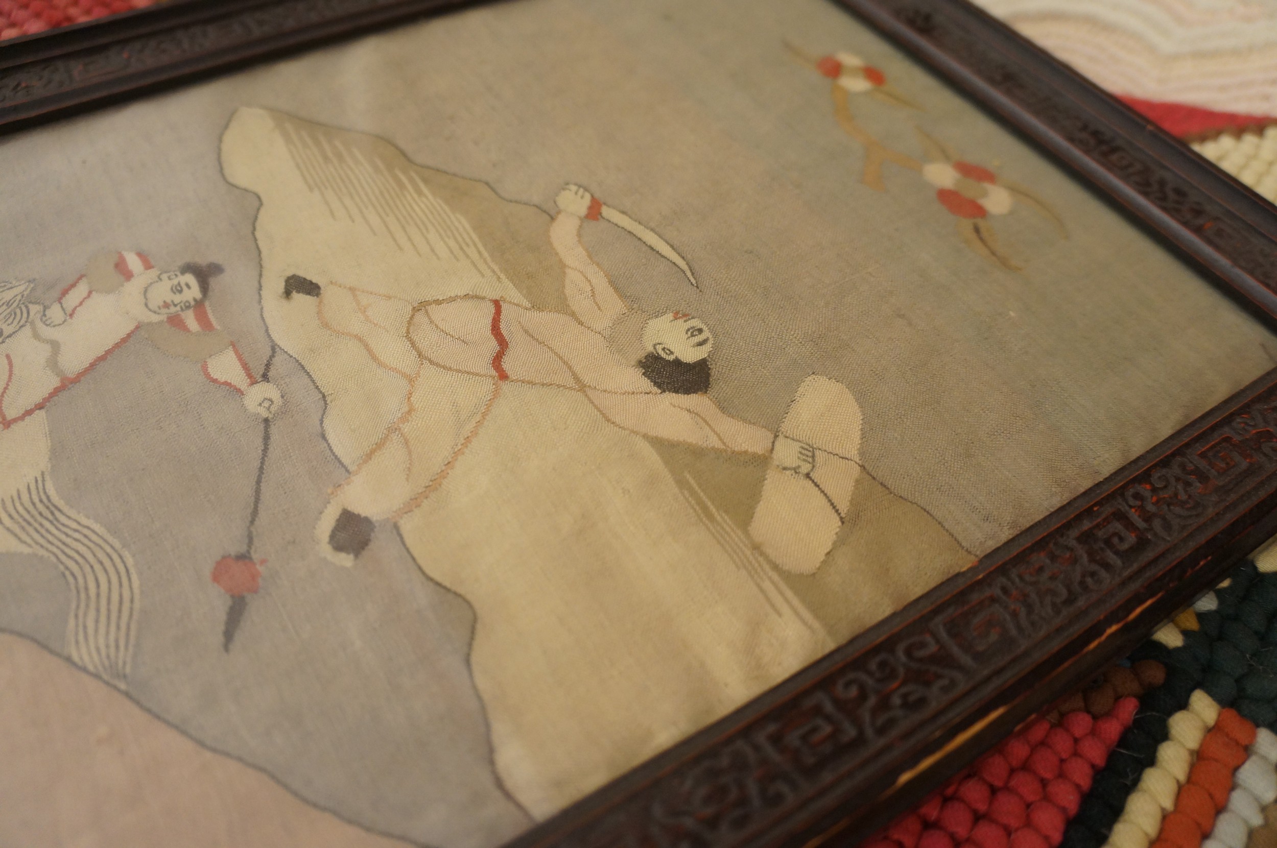 Antique Scenic Chinese Textile Framed Multi Panel Triptych