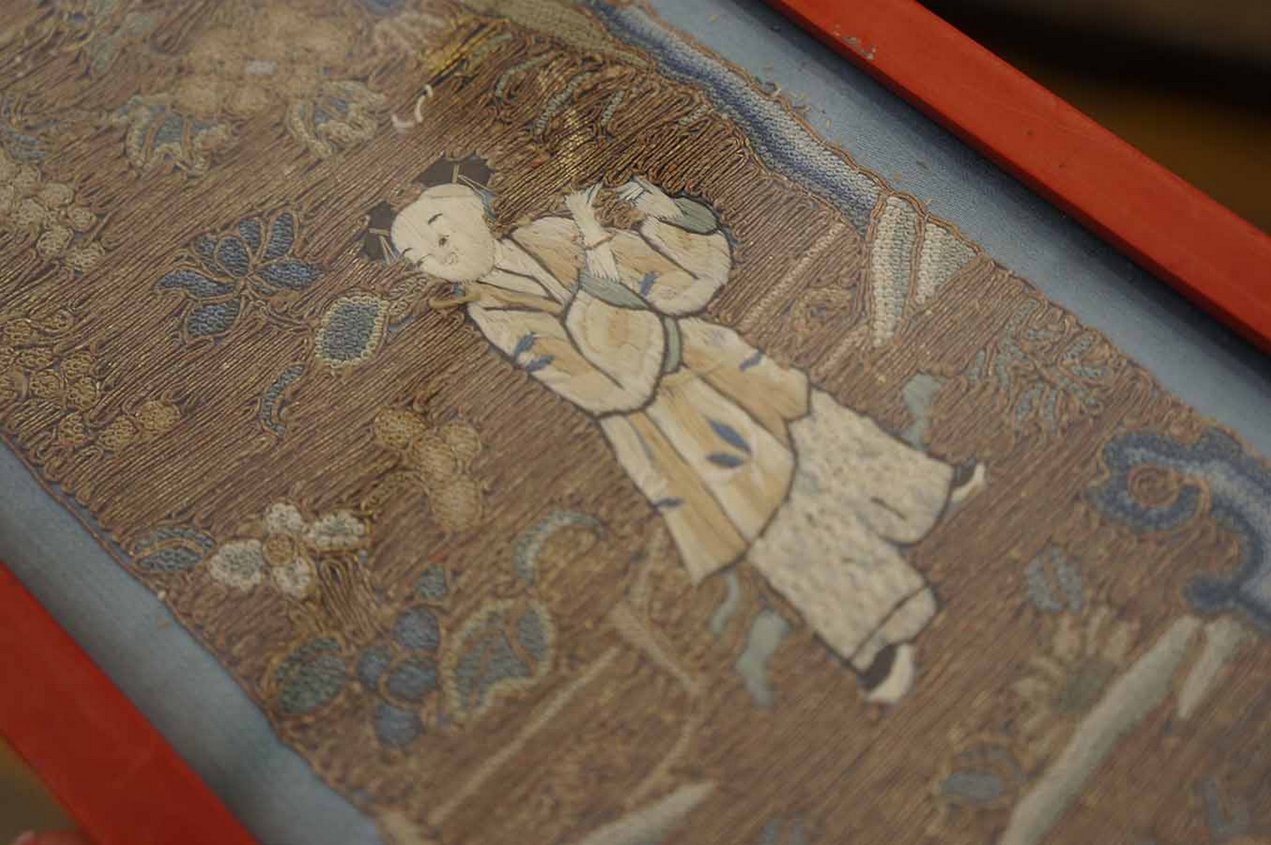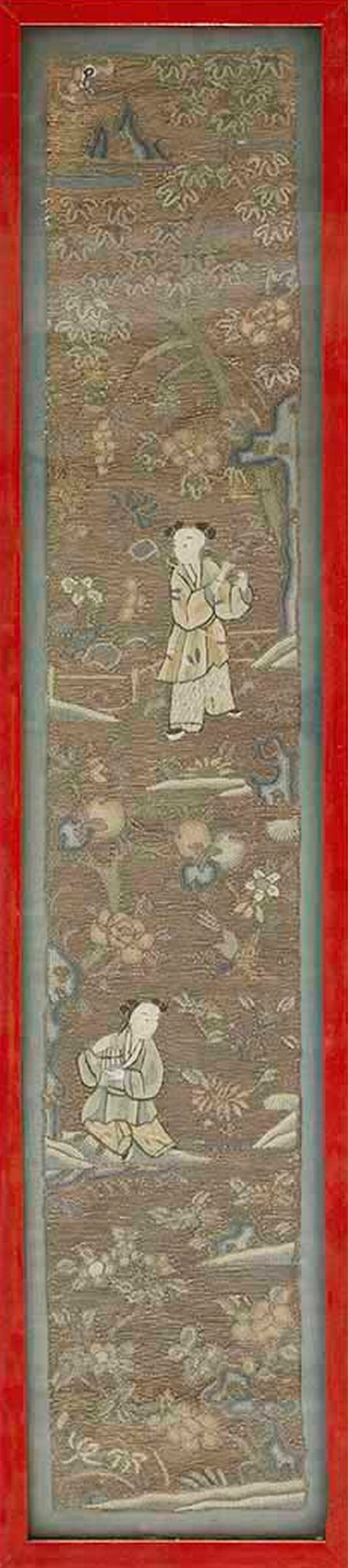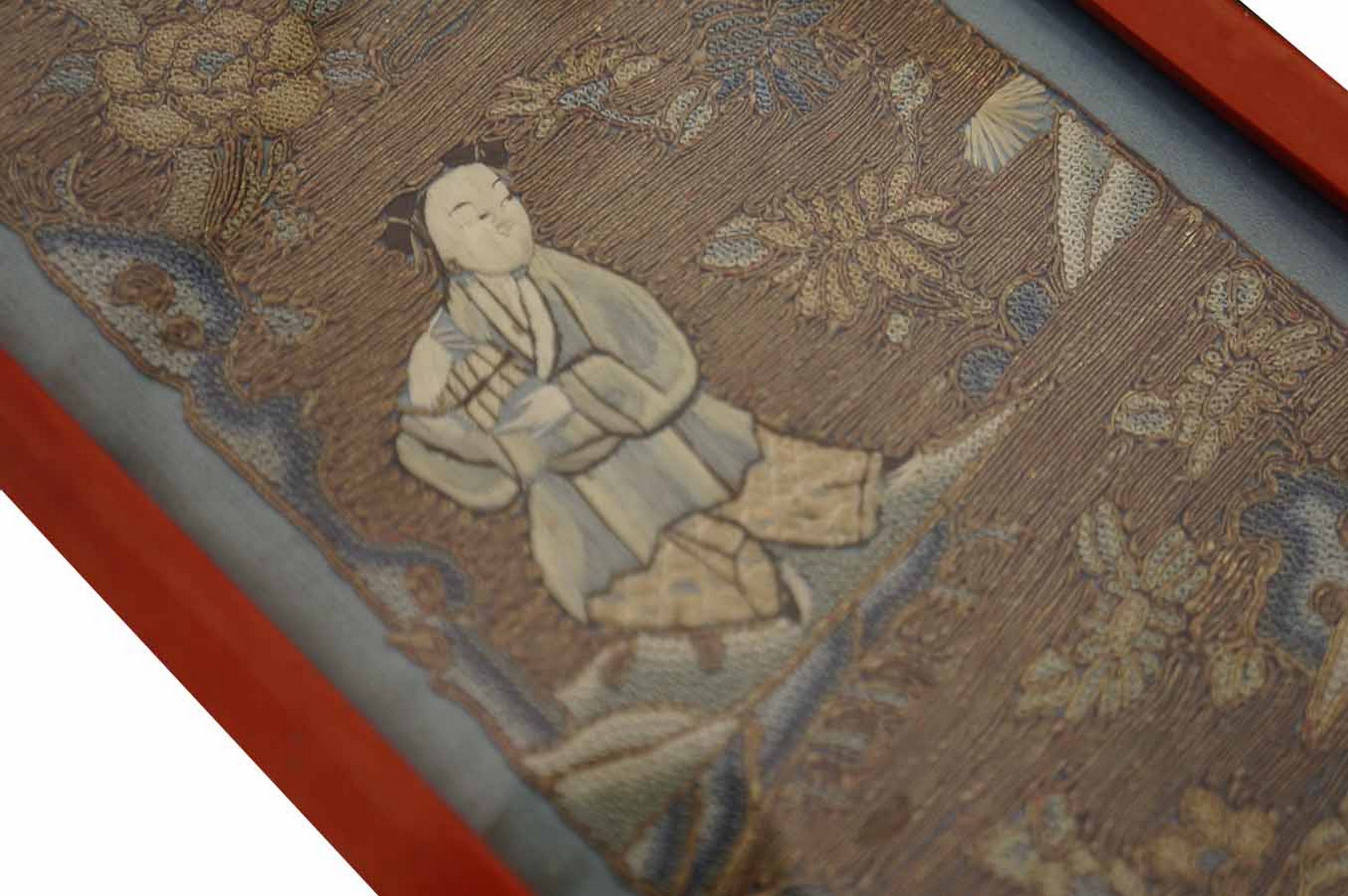 Antique Textile Small Scatter Size Silk & Metallic Thread Brown Earth Tone, Red Rug, Country of Origin: China, Circa Date: 1900s. This exquisite textile panel, framed in a vibrant red lacquer, showcases the exceptional artistry found in historical Chinese rugs and wall hangings at the turn of the century. Woven primarily with silk and accentuated by fine metallic threads, the piece captures a delicate, shimmering quality rarely achieved in traditional floor coverings.