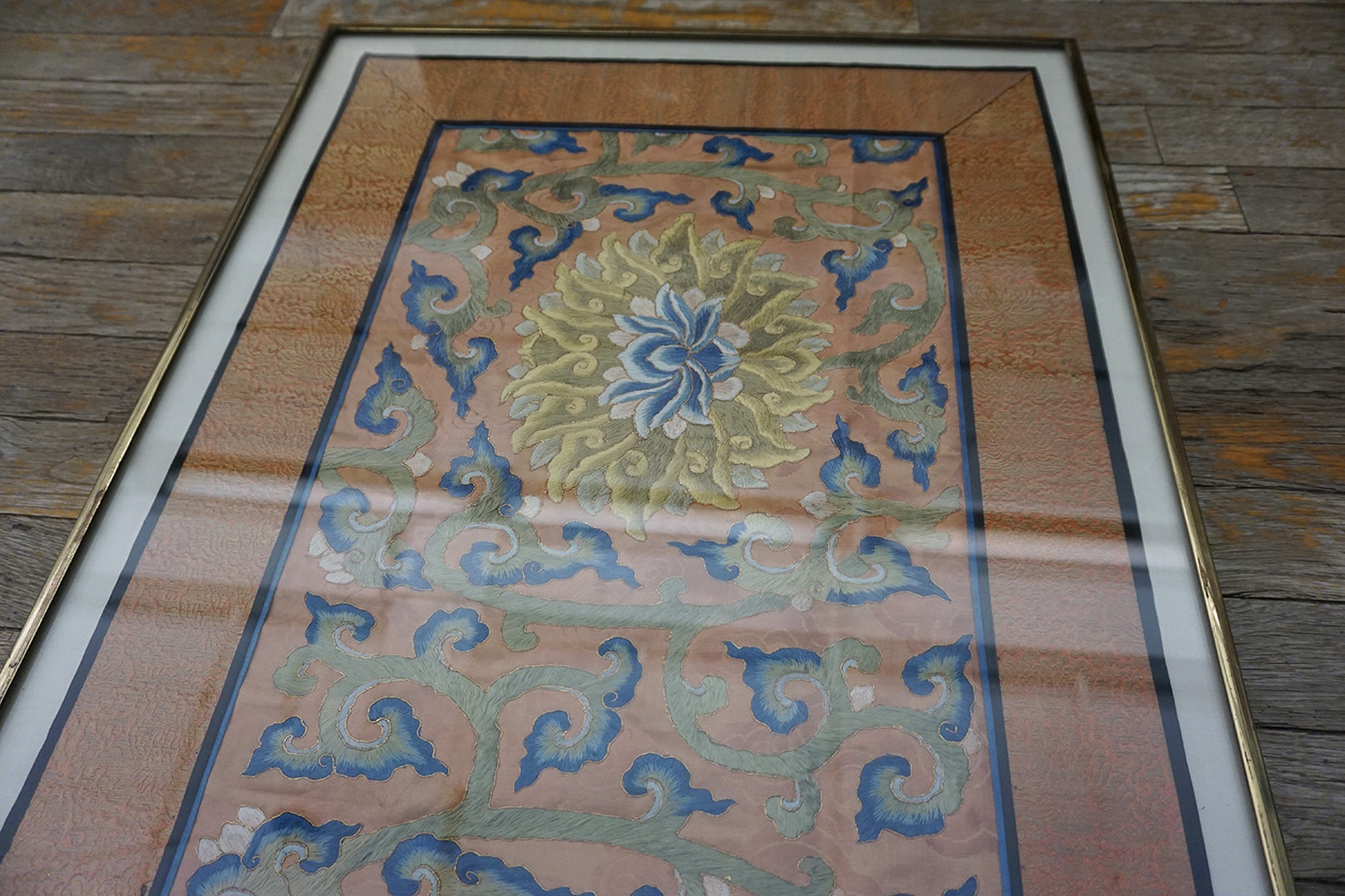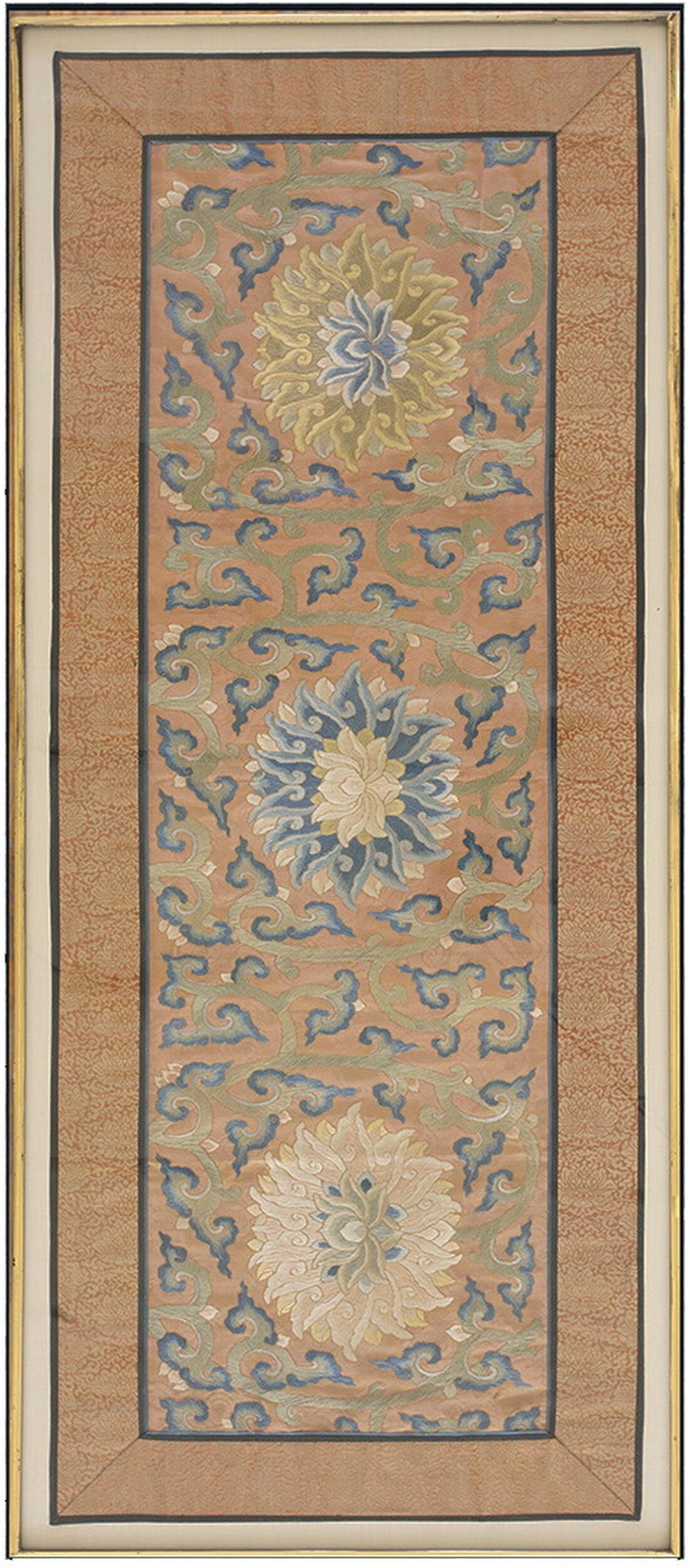 The field is dominated by a luminous peach color ground, providing a warm, subtle backdrop for the intricate needlework. The palette is characteristically late Qing Dynasty, employing soft blues, pale creams, and muted celadon greens to define the stylized floral and cloud motifs that scroll across the central axis.