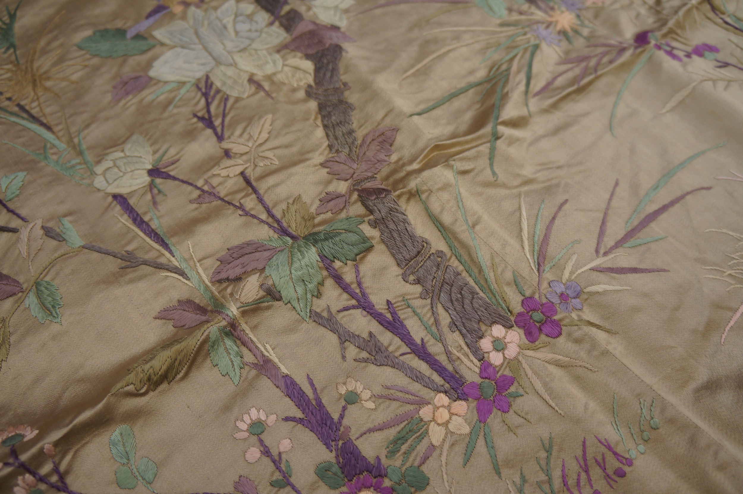 The textile’s overall aesthetic is one of serene elegance, capturing a moment of natural beauty typical of classic Chinese iconography. This piece is a rare find, offering both historical value and unmatched decorative potential for a discerning collector seeking subtle luxury.
