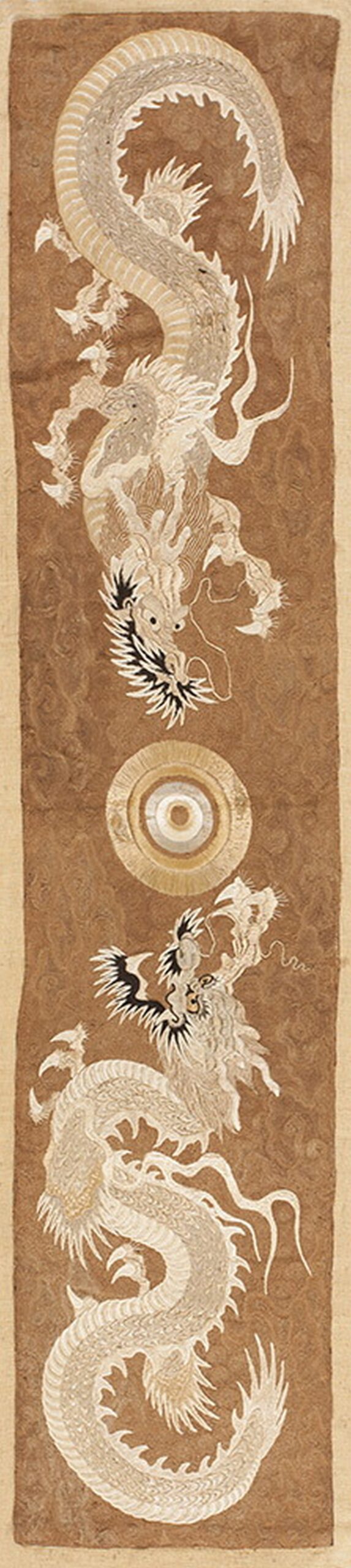 The central motif features two powerful, stylized celestial dragons, rendered in meticulous embroidery that emphasizes their scales, claws, and flowing manes. These mythical beasts flank a central flaming pearl or sun disk, a potent symbol of wisdom and imperial authority in Chinese culture. Such pieces are highly sought after by collectors of antique rugs and textiles.