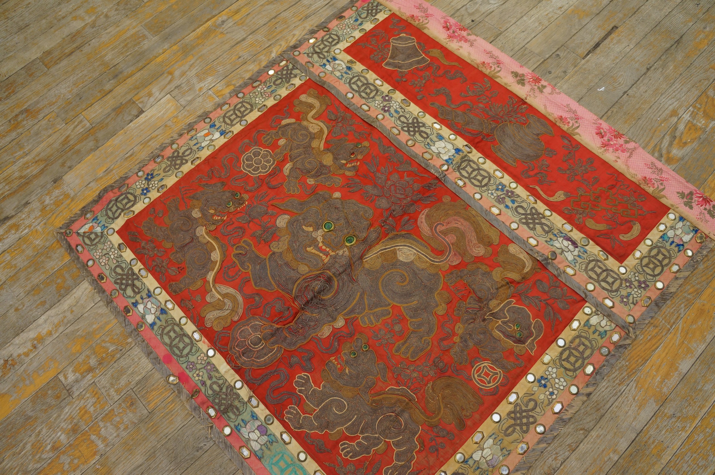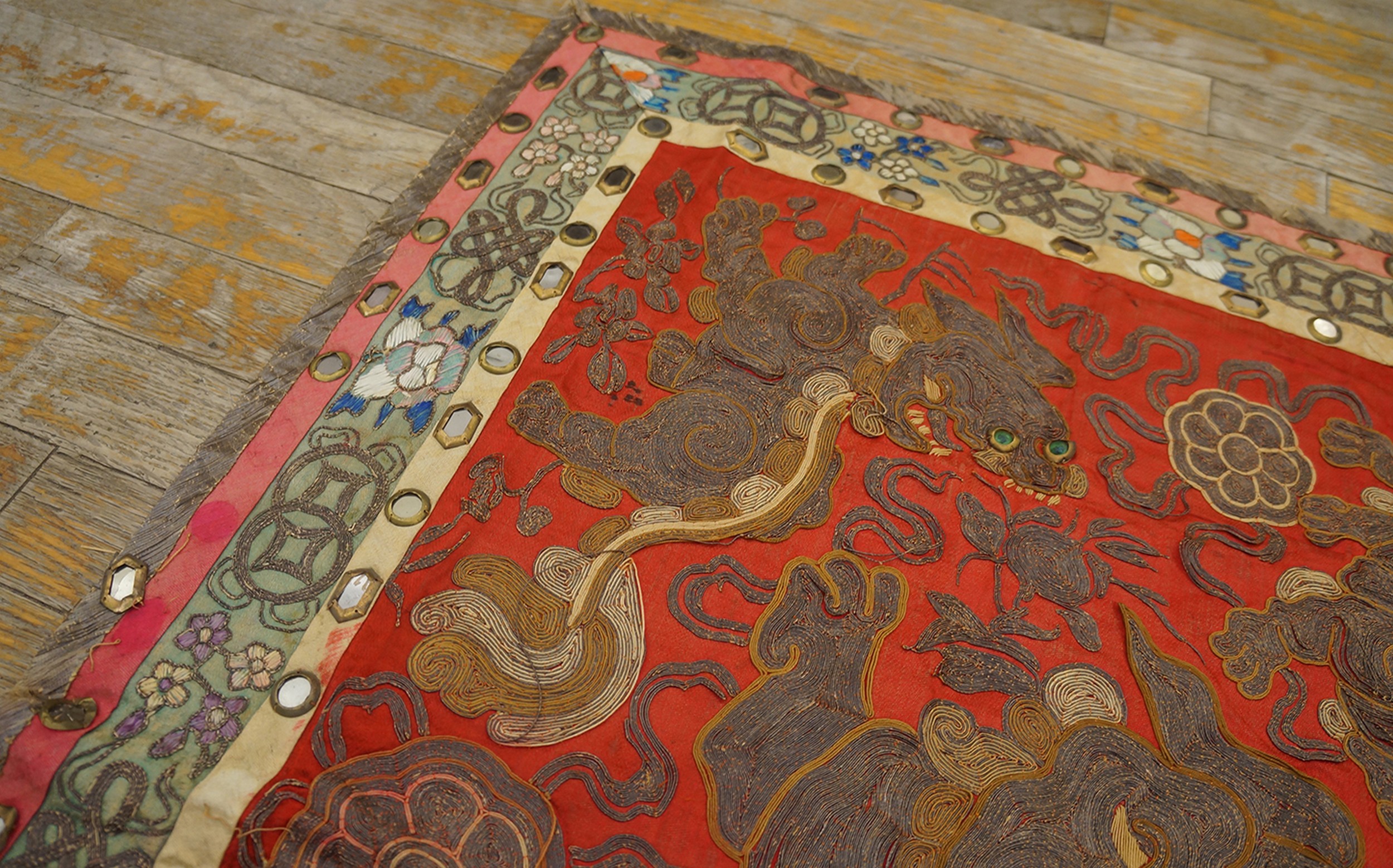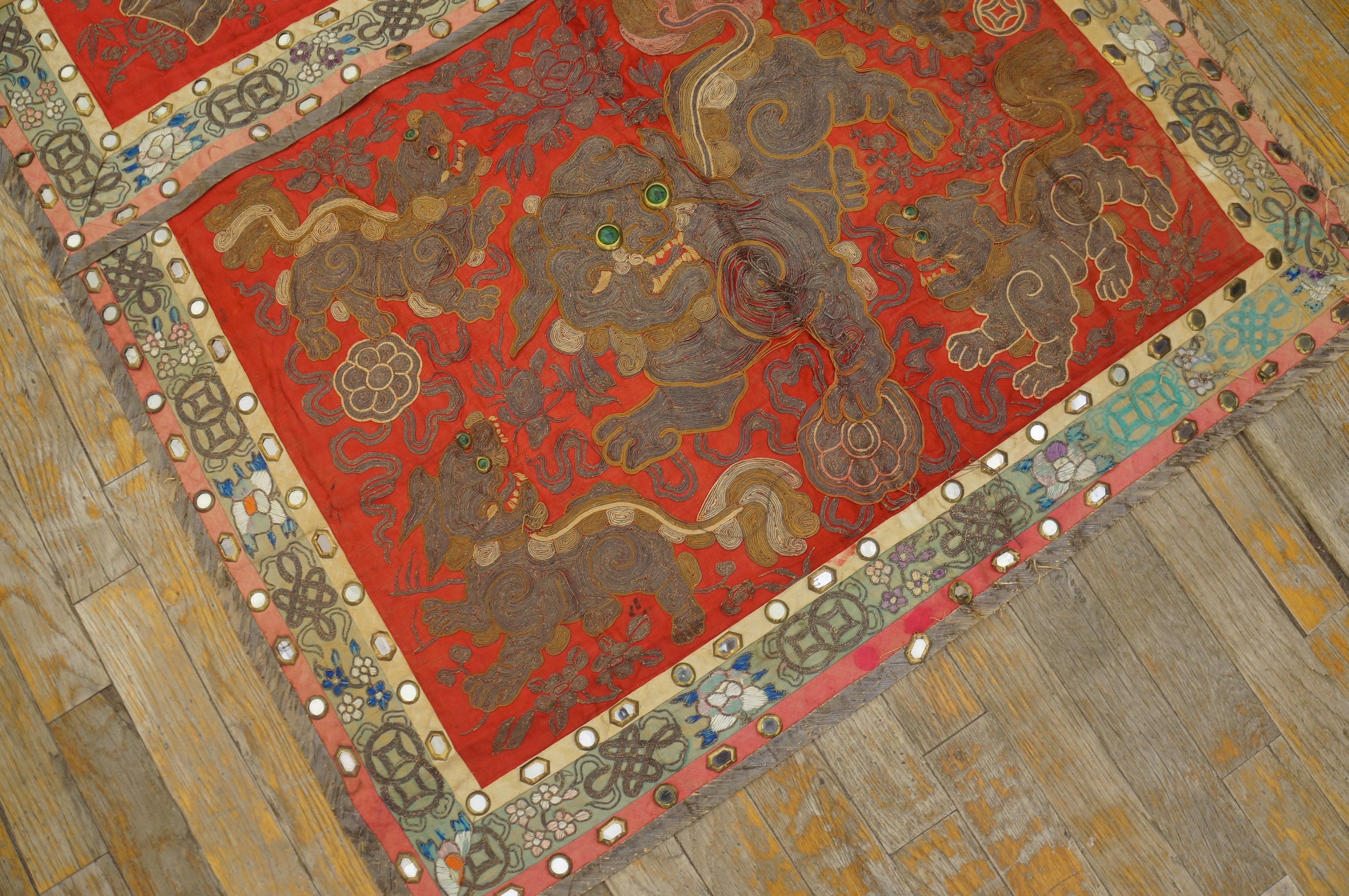 The central field is dominated by highly stylized guardian figures, rendered in dense, coiled metallic and silk threads, giving them a three-dimensional, sculptural quality. These figures, often referred to as Foo Dogs or temple lions, are traditional symbols of protection and prosperity, their eyes sometimes highlighted with small, luminous green cabochons.