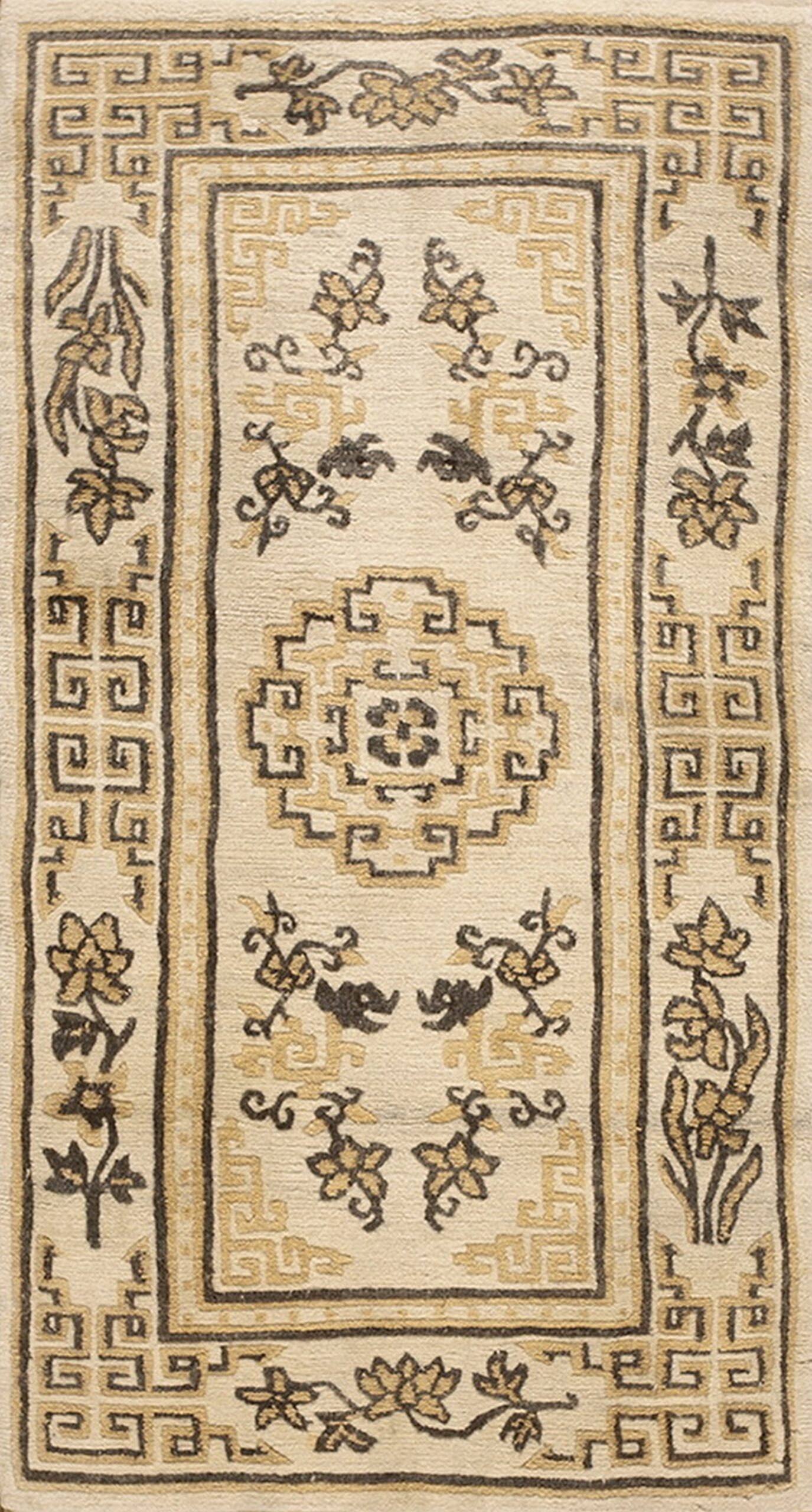 A complex, stepped geometric medallion anchors the center, framed by delicate, stylized floral sprays scattered across the field. The borders utilize the classic Chinese key pattern, providing a strong, continuous frame that contrasts sharply with the soft curves of the interior motifs, demonstrating a masterful control of positive and negative space inherent to Tibetan design.