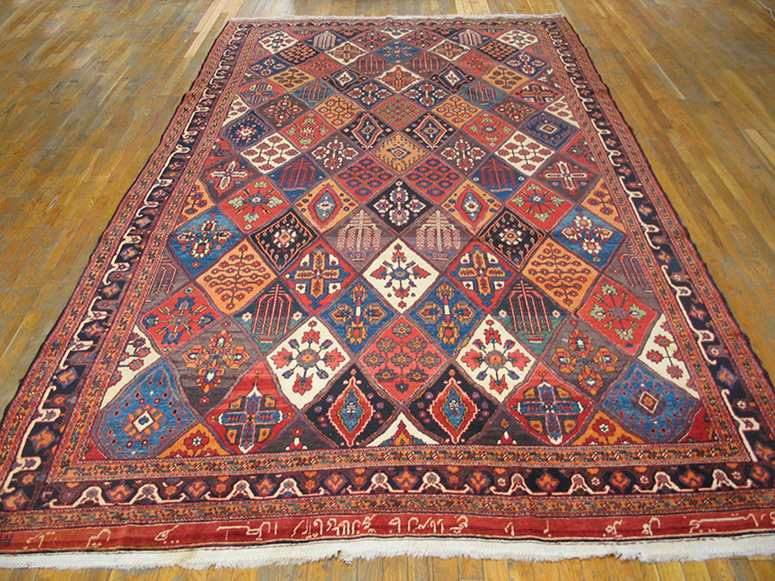 Antique Bakhtiari Persian 1890s Rug, Country of Origin: Persia, Circa Date: 1890s. This exceptional example of weaving from the Qajar era showcases the robust and highly detailed artistry typical of its origin. The Bakhtiari tribes, known for their durable construction and vivid palettes, created pieces that are cornerstones of the history of Persia.