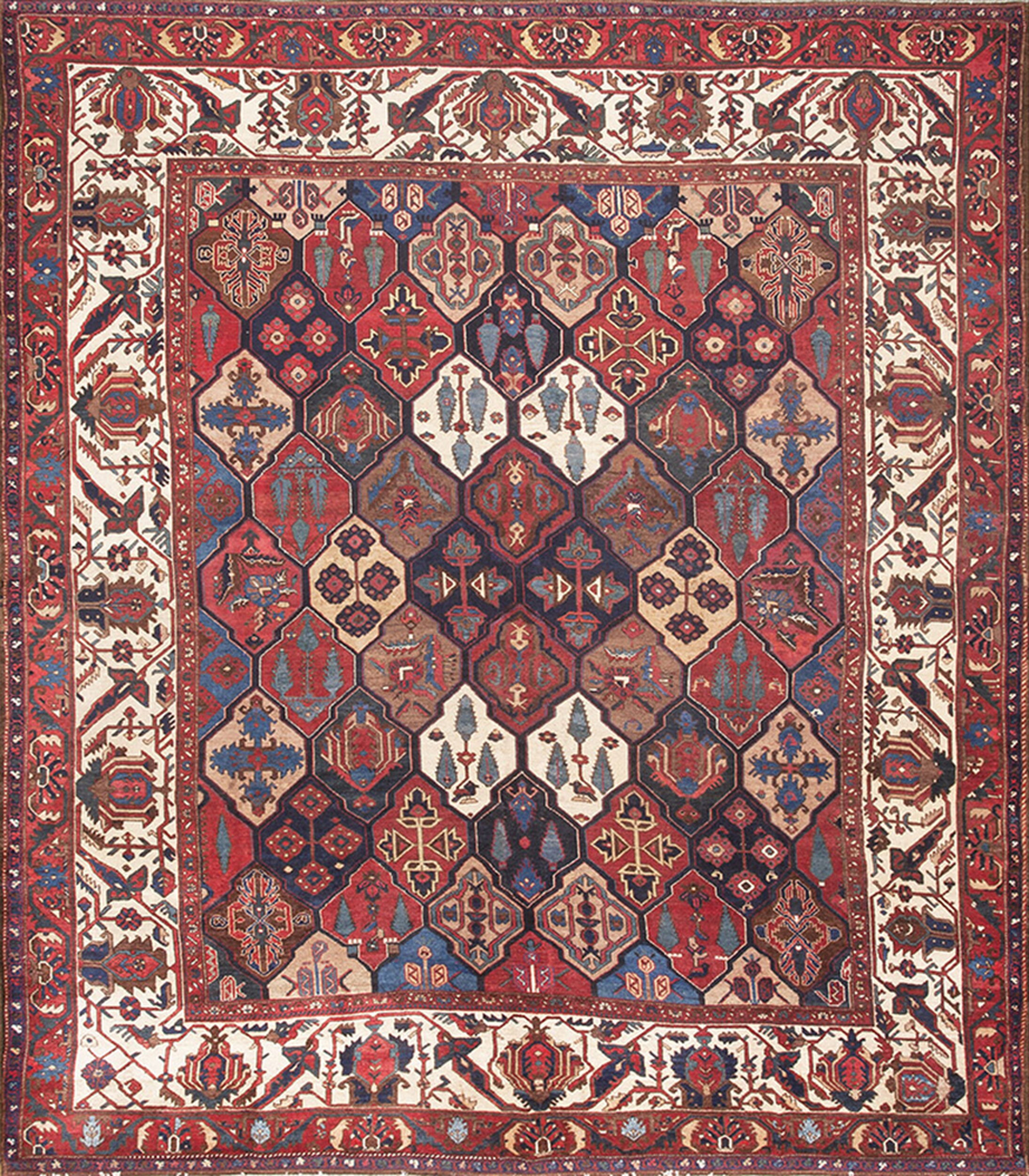 The field is dominated by a highly structured, dense geometric lattice, creating an allover design of interlocking, multi-sided medallions. Each compartment is filled with stylized tribal and floral motifs rendered in a rich, saturated palette of madder red, deep indigo, and warm ivory accents. This compartmentalization is a hallmark of the Bakhtiari weaving tradition.