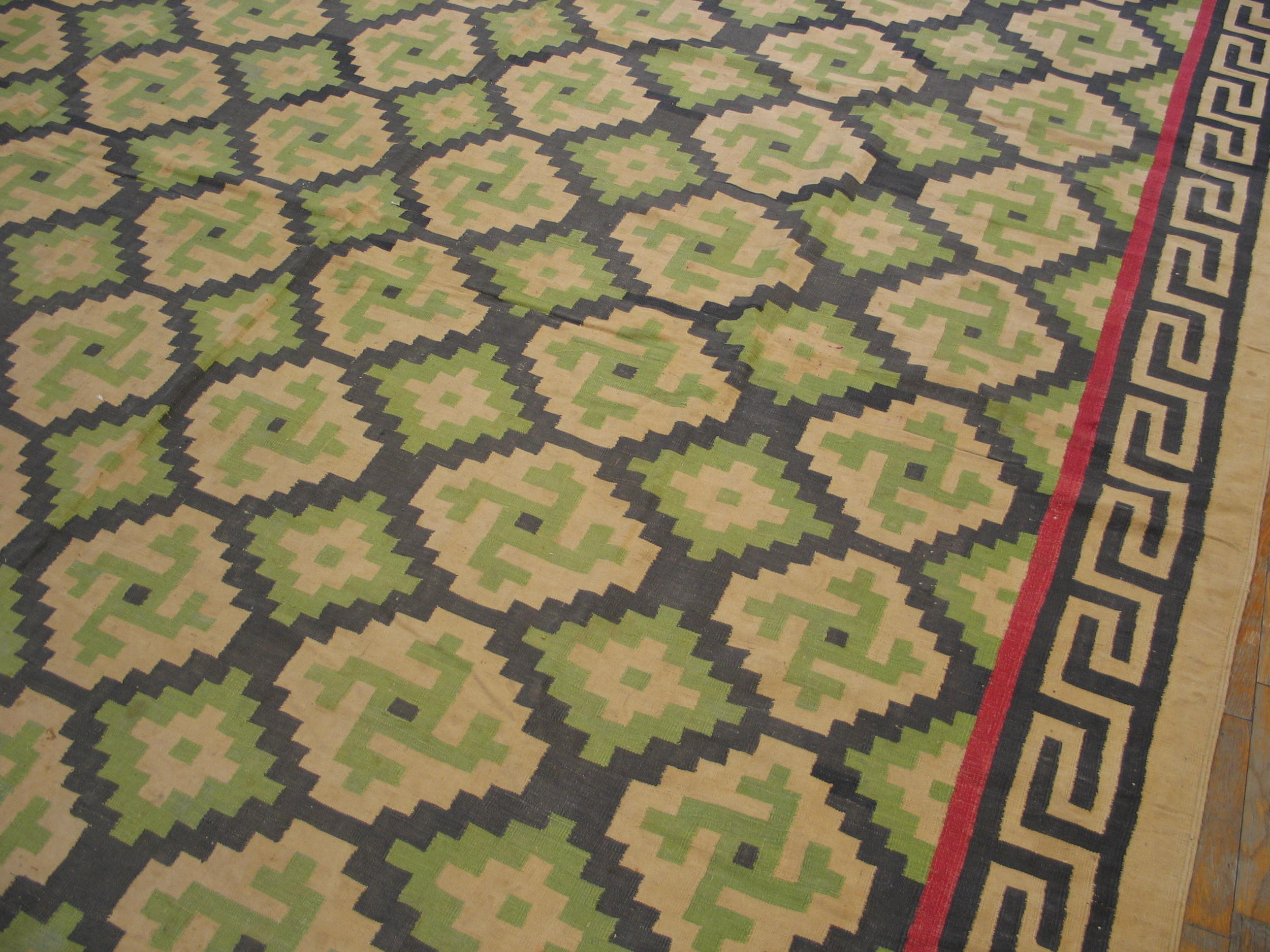 Antique Dhurrie Large Room Size Wool Ivory Rug, Country of Origin: India, Circa Date: 1920s. This exceptional piece from the 1920s showcases the sophisticated geometric weaving traditions characteristic of Indian rugs during the early 20th century. The graphic precision and restrained palette elevate this textile far beyond typical production pieces.