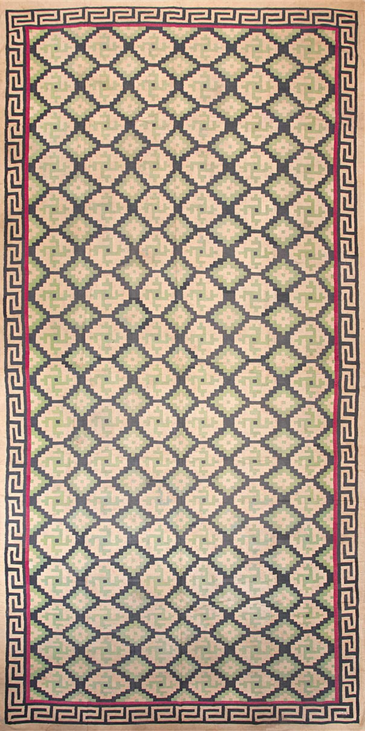 The palette is expertly controlled, relying on the expansive use of a soft, luminous ivory Rug ground to maximize light reflection. The striking Greek Key (Meander) border, accented by a thin line of saturated magenta, frames the composition and provides a crucial counterpoint to the central geometric complexity.