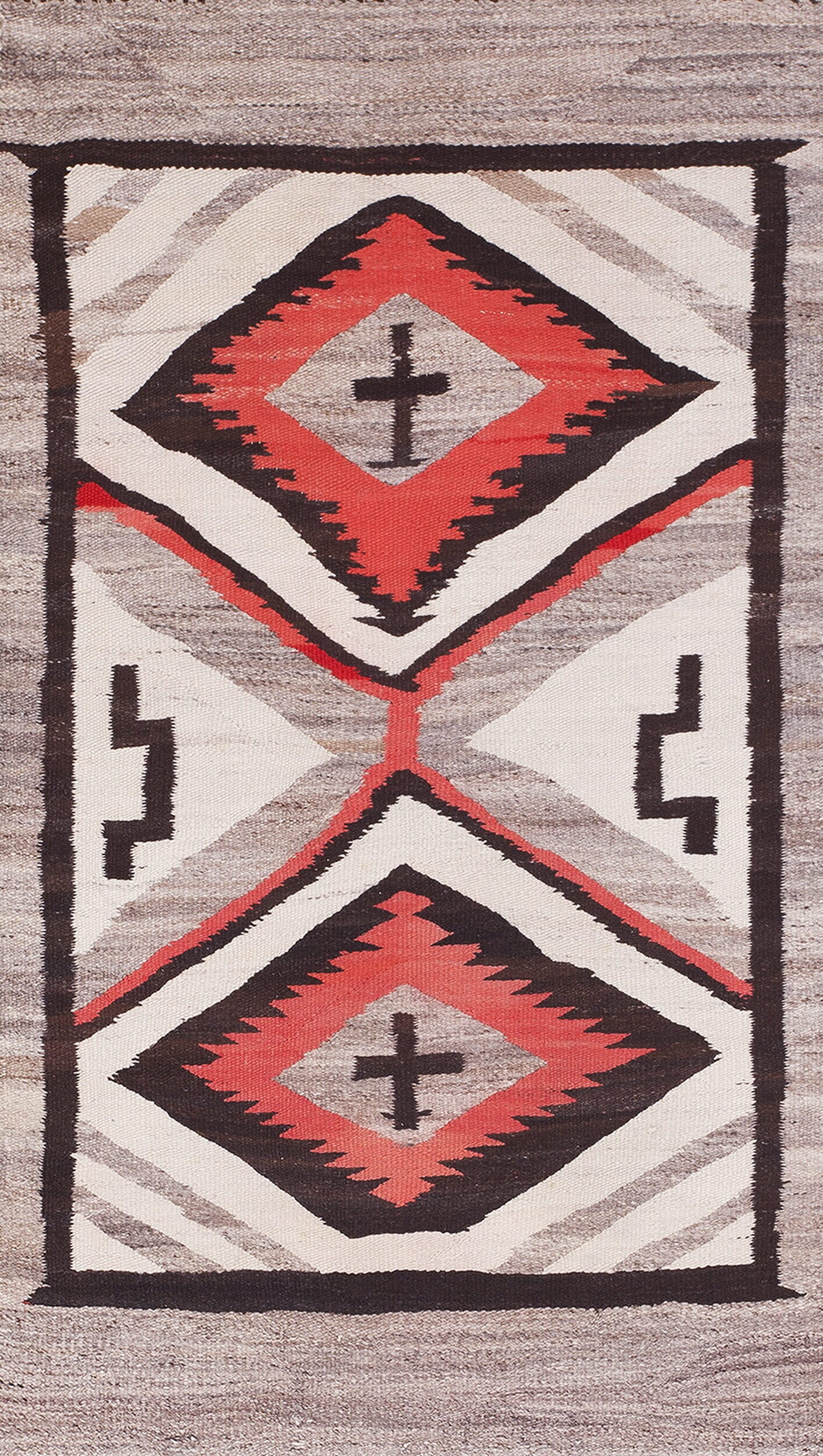 The composition is rigorously symmetrical, featuring a central axis flanked by bold, serrated diamonds and traditional stepped motifs. The design relies entirely on powerful, abstract geometric rugs forms, a hallmark of the finest Navajo textiles that prioritize structure over ornamentation.