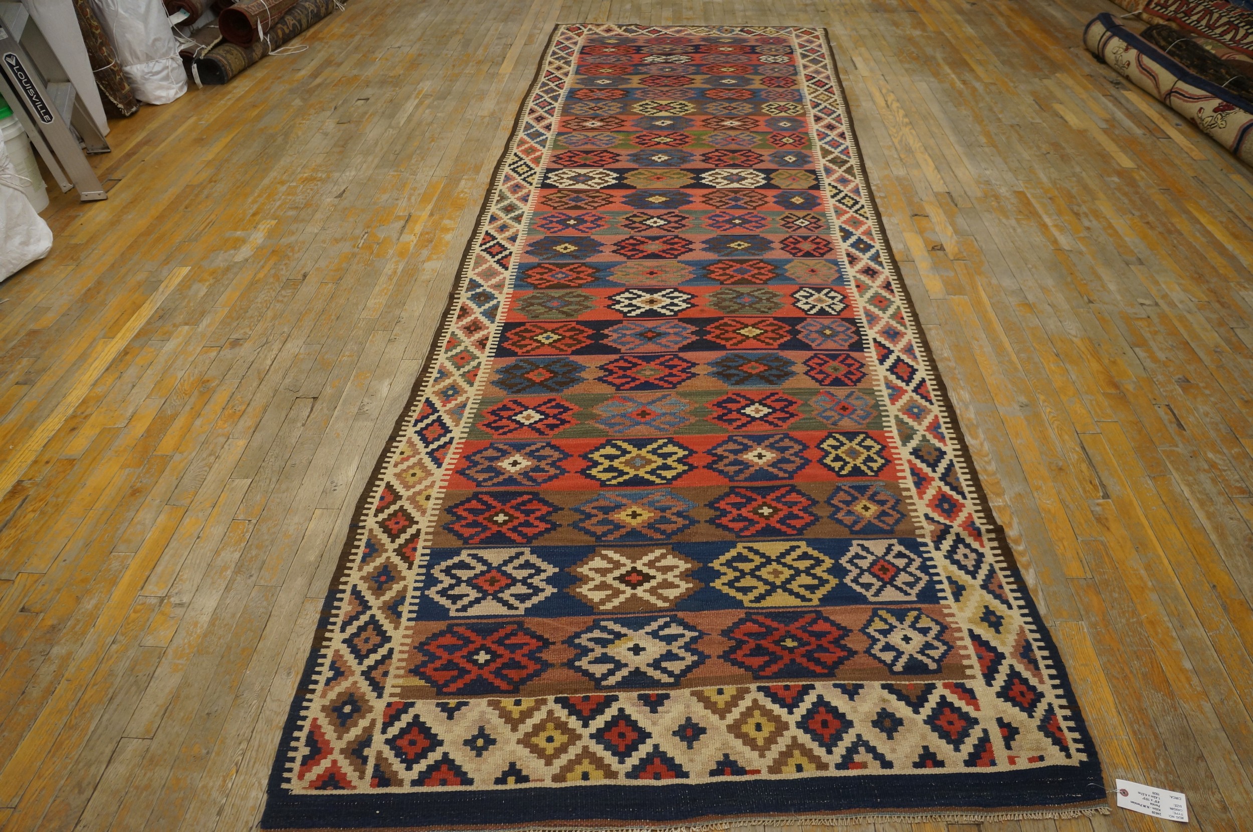 Given its extended dimensions, this large Kilim functions beautifully as a substantial runner, making it an ideal choice for grand entryways or long galleries—a rare format among hallway runner rugs of this age. As a significant example of early 20th-century textile art, it is a noteworthy addition to any collection of fine antique rugs.