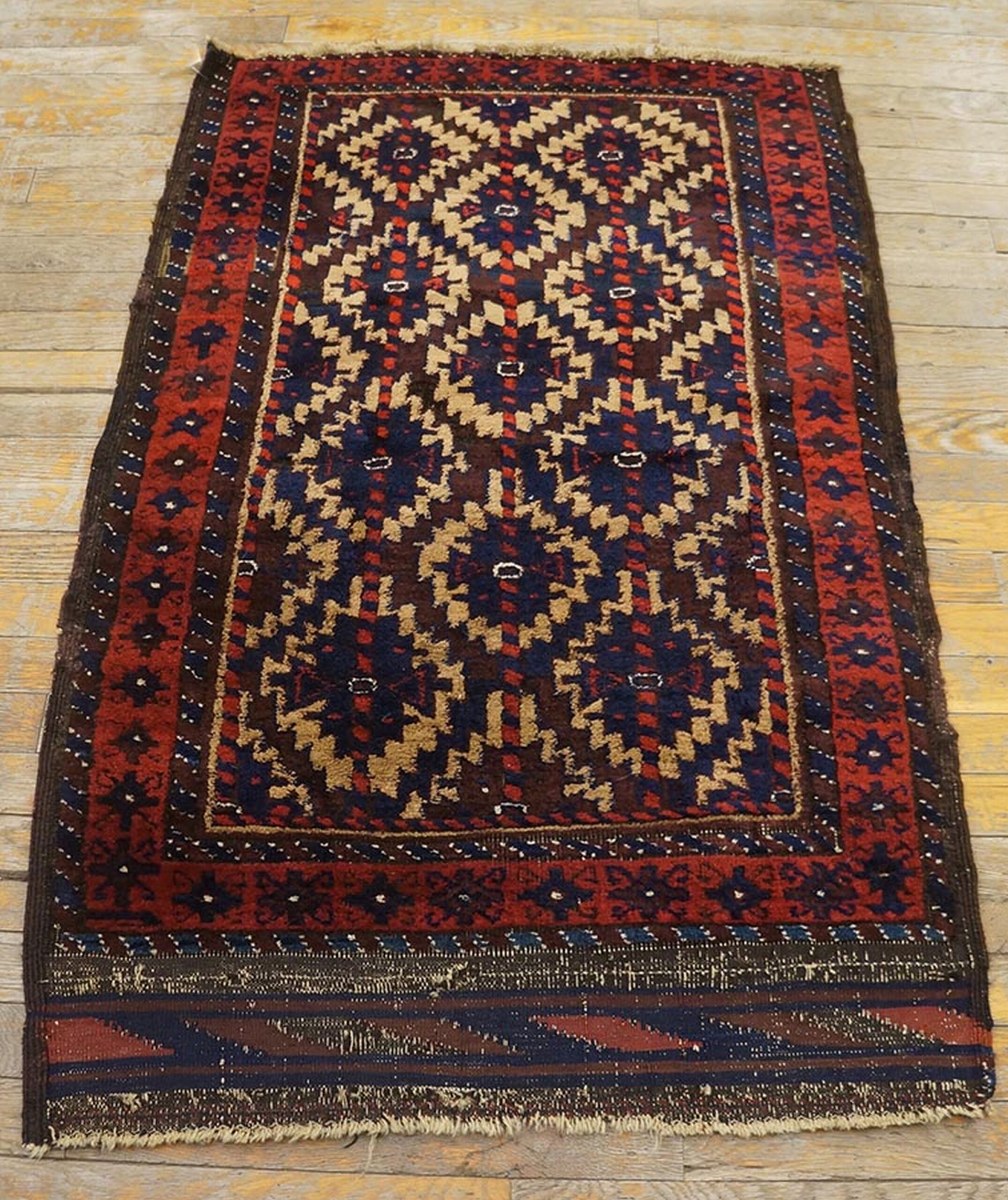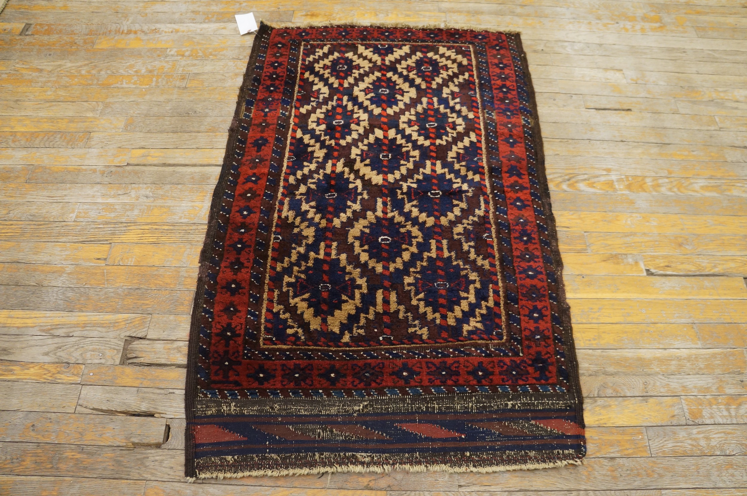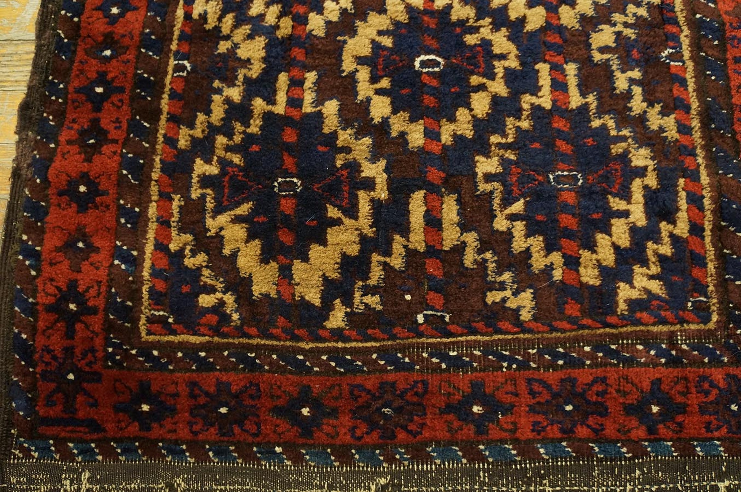 While often grouped geographically, the distinctive aesthetic of this piece speaks to a unique cultural heritage within the broader context of Weavings from Persia. The craftsmanship is evident in the finely detailed borders, which frame the main design with secondary geometric symbols typical of tribal iconography from the late 19th century.