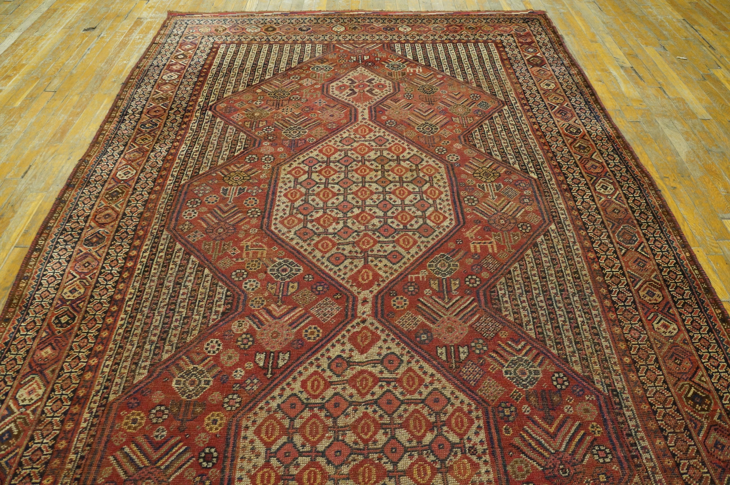 The primary field color is a vibrant, yet aged, rust-red that serves as a powerful backdrop for the central design, highlighted beautifully by accents of cream, indigo, and a distinctive salmon Pink color. This specific hue is crucial to the rug’s overall warmth, providing a sophisticated contrast against the earthier tones typical of nomadic weavings from this period.