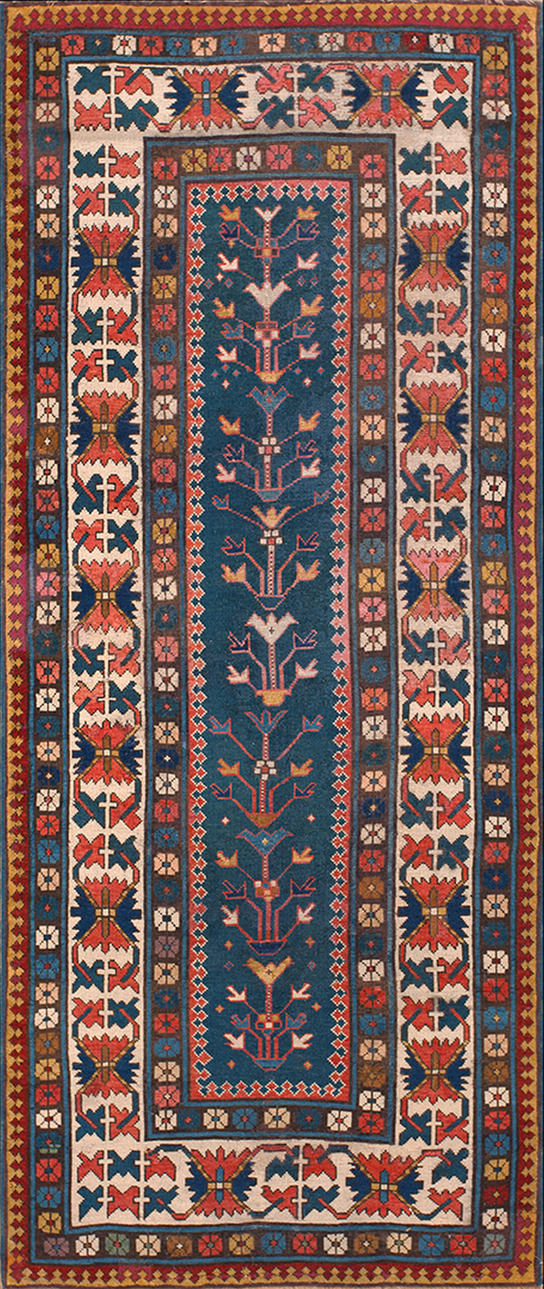 While the central panel is clearly defined, the surrounding multiple guard borders, featuring repeating geometric devices and stylized floral elements, create a contained yet visually busy composition. Unlike many contemporary designs, the structure here is highly centralized rather than employing allover rugs patterns.