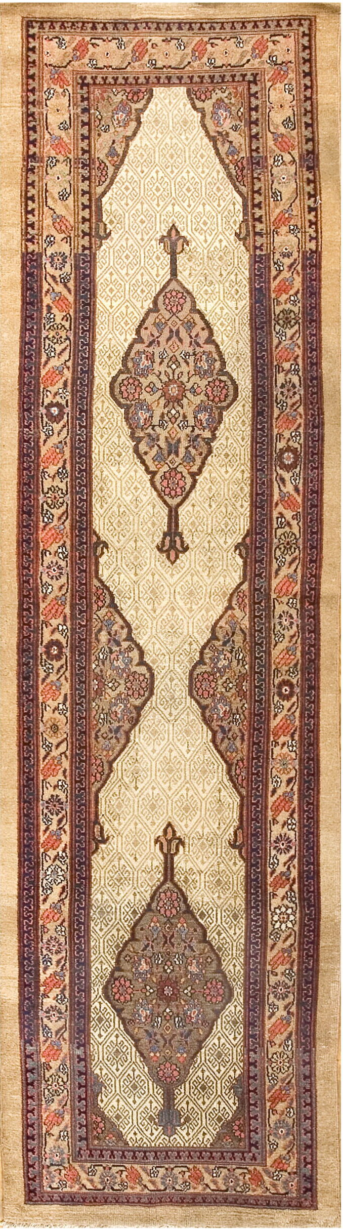 Three large, stylized medallions anchor the length of the runner, each filled with intricate boteh and delicate floral motifs. These stylized elements demonstrate the sophisticated weaving traditions of Northwest Persia, providing visual depth against the lighter ground.