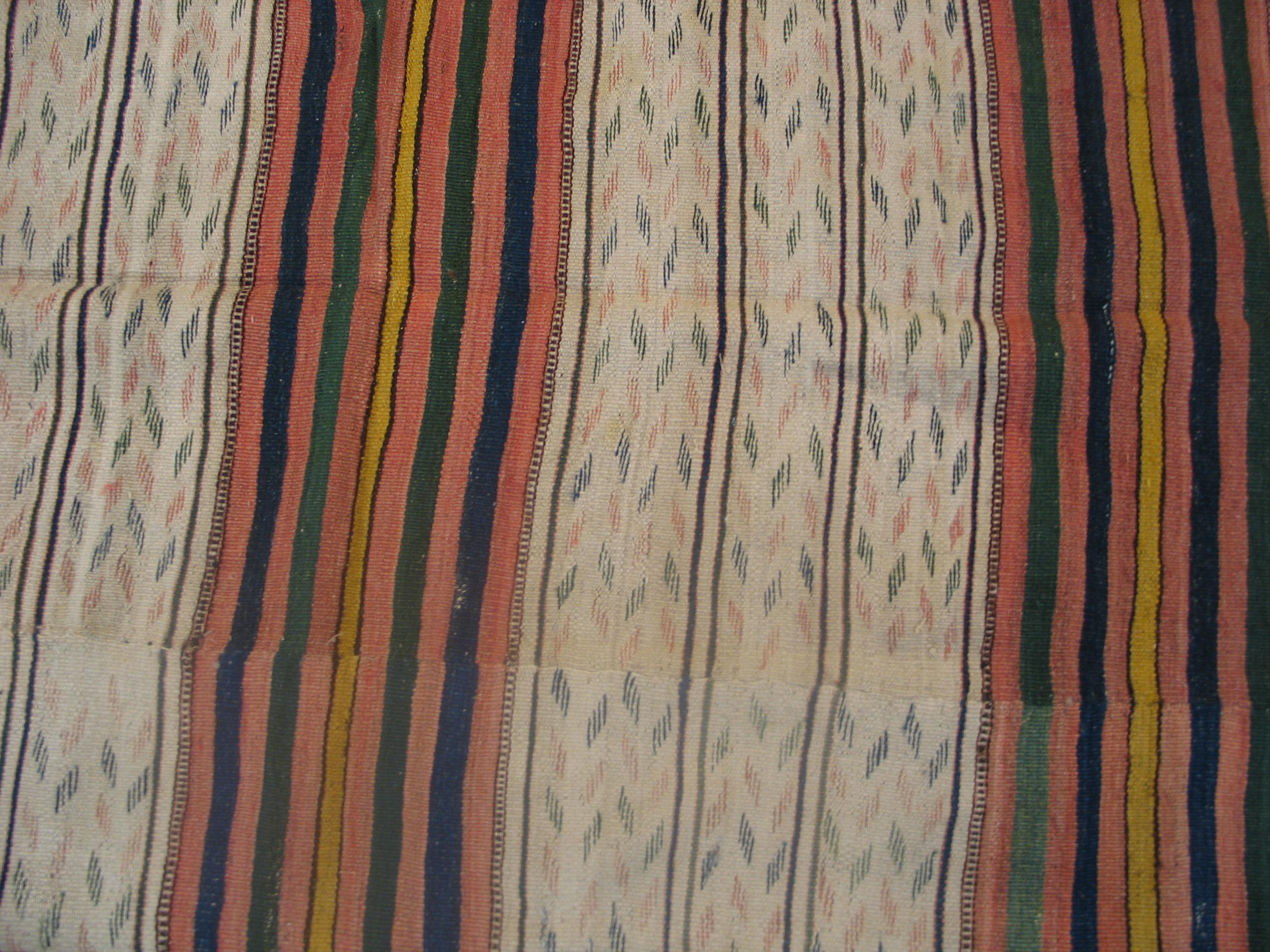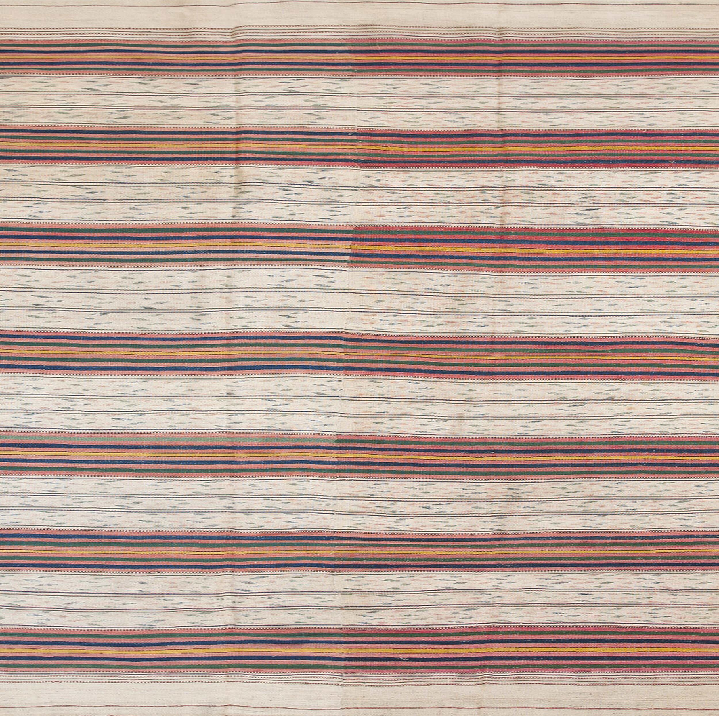 A refined palette centers on wide bands of soft, natural ivory beige cream wool, providing a luminous backdrop for the alternating narrow stripes of saturated color. These accent lines—featuring deep indigo, muted rose, and touches of saffron—are derived from natural dyes, lending the piece an authentic, aged patina that cannot be replicated.