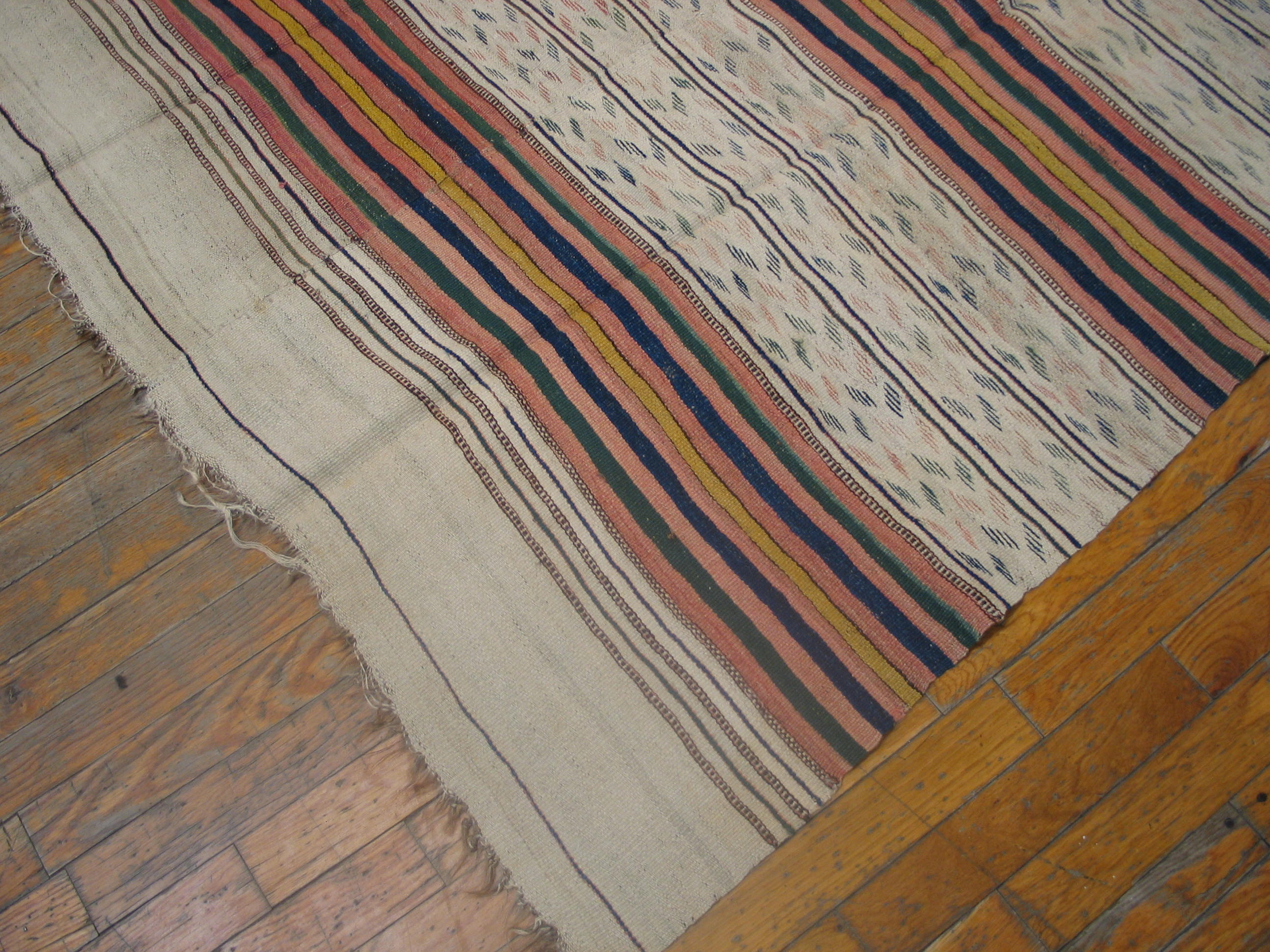 Antique Kilim Hallway Runner Wool Ivory Rug, Country of Origin: Turkey, Circa Date: 1900s. This striking flatweave exemplifies the enduring weaving traditions of Turkish rugs, showcasing a sophisticated simplicity achieved through masterful use of color and structure. The wool construction ensures durability while providing a soft, matte texture characteristic of high-quality village production.