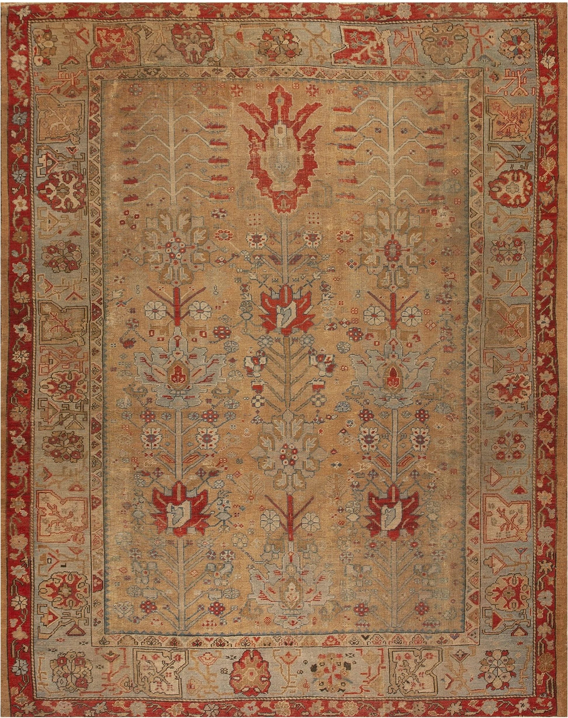 The central design is highly stylized, presenting an abstracted Tree of Life with large palmettes and delicate blossoms that reflect the classical Persian influence adapted by Oushak weavers. The generous scale of the motifs is characteristic of the period, allowing the design to breathe across the open field, framed by a robust main border featuring continuous floral vines.