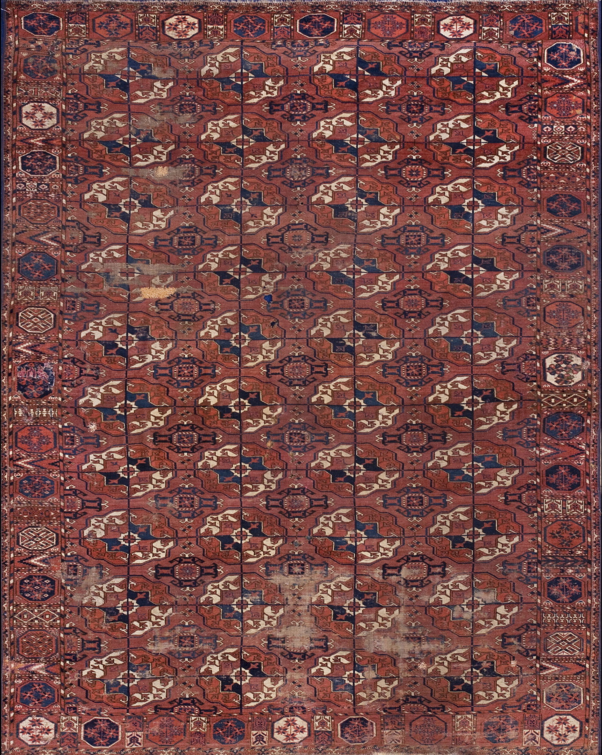 Antique Tekke Allover Geometric Hand Knotted Pile Rug, Circa Date: 1890s. This exceptional example of tekke weaving showcases the precise geometric language for which the Central Asian tribes are renowned. The field is dominated by a repeated gul structure, forming a powerful allover rugs design that extends seamlessly across the entire plane.
