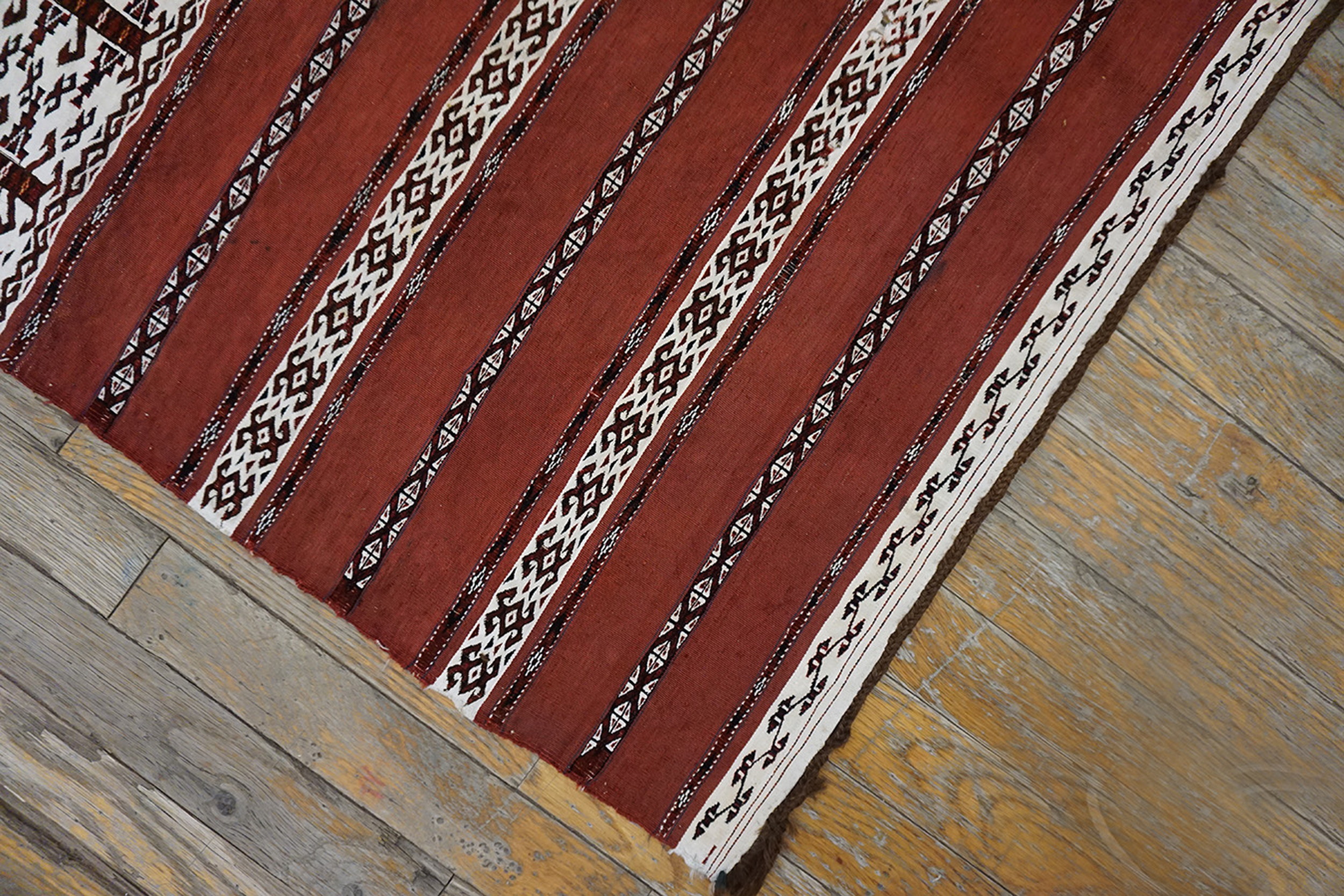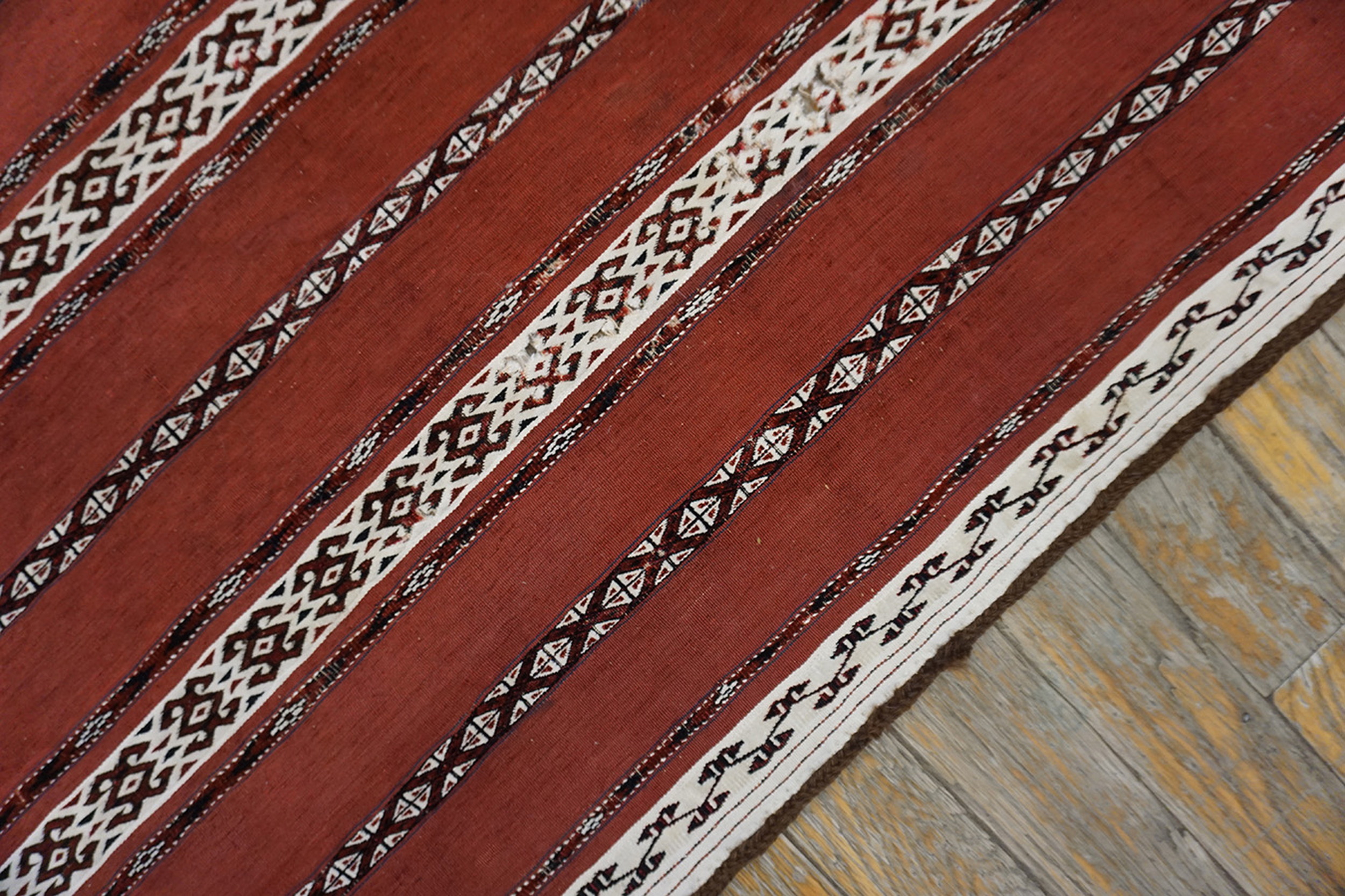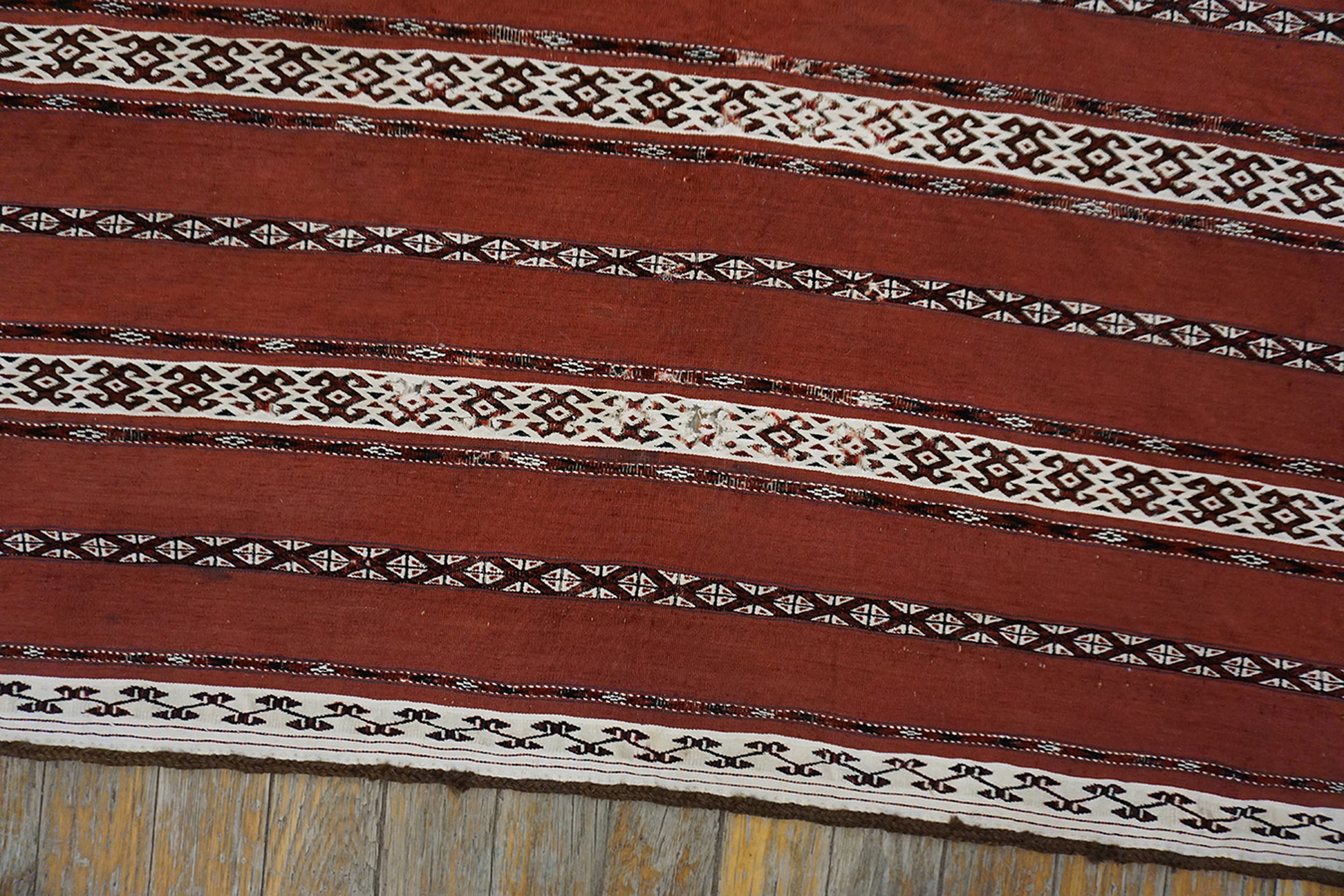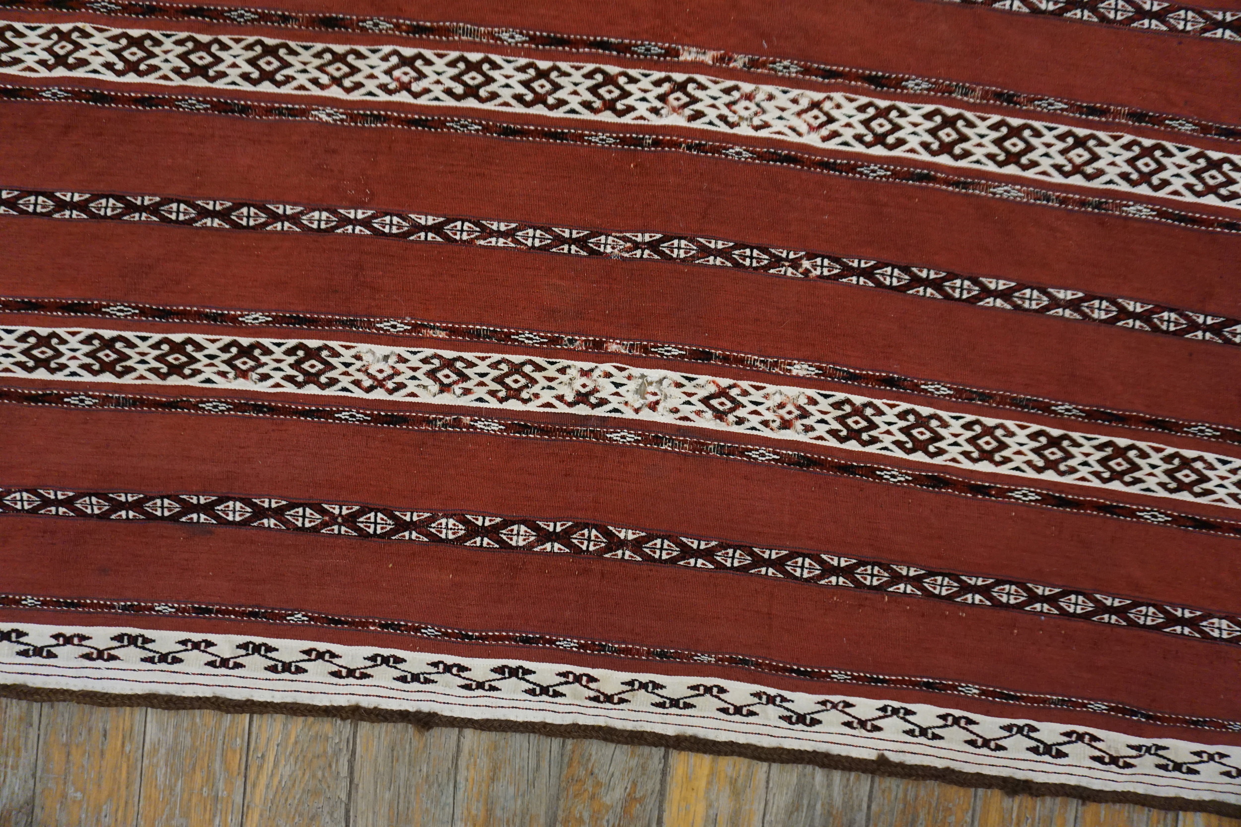 Antique Turkmaan – Tekke Turkmenistan Flat Weave Rug, Circa Date: 1880s. This exceptional example of nomadic artistry represents the finest traditions of the Tekke tribe, renowned for their mastery of both piled and flat-woven textiles. This piece, dating to the late 19th century, is a vital artifact among antique rugs and showcases the durable, practical beauty required for Central Asian tent life.
