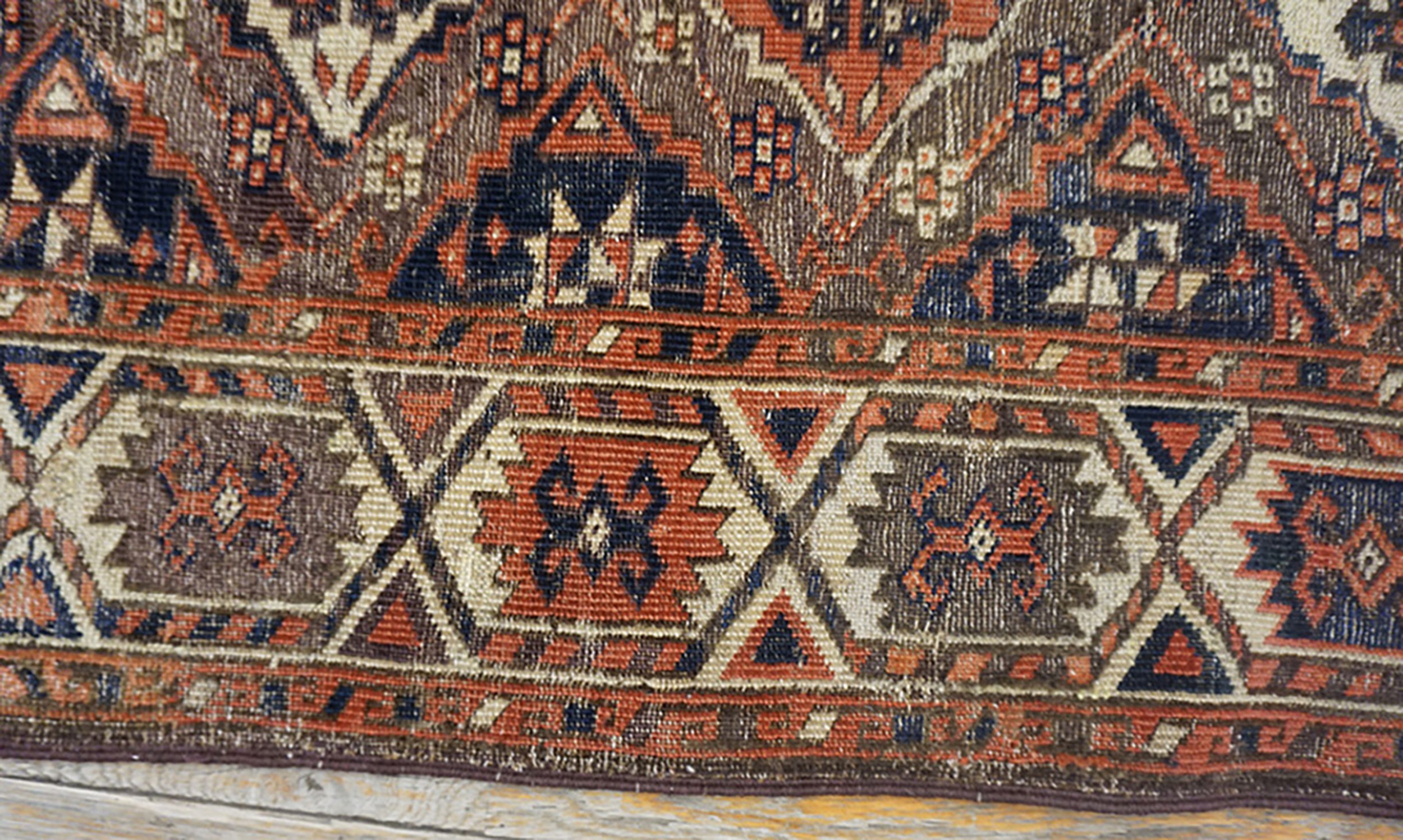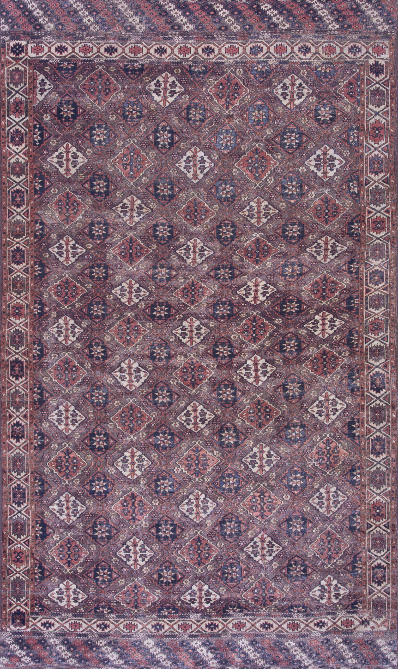 The palette is rich and complex, moving beyond the typical madder reds often associated with Turkmen work. Here, deep reds are beautifully offset by accents of midnight blue and subtle, oxidized highlights of purple and mauve tones. This unique color variation, combined with the soft patina achieved over 150 years, lends the rug a profound depth and sophistication suitable for discerning collectors.