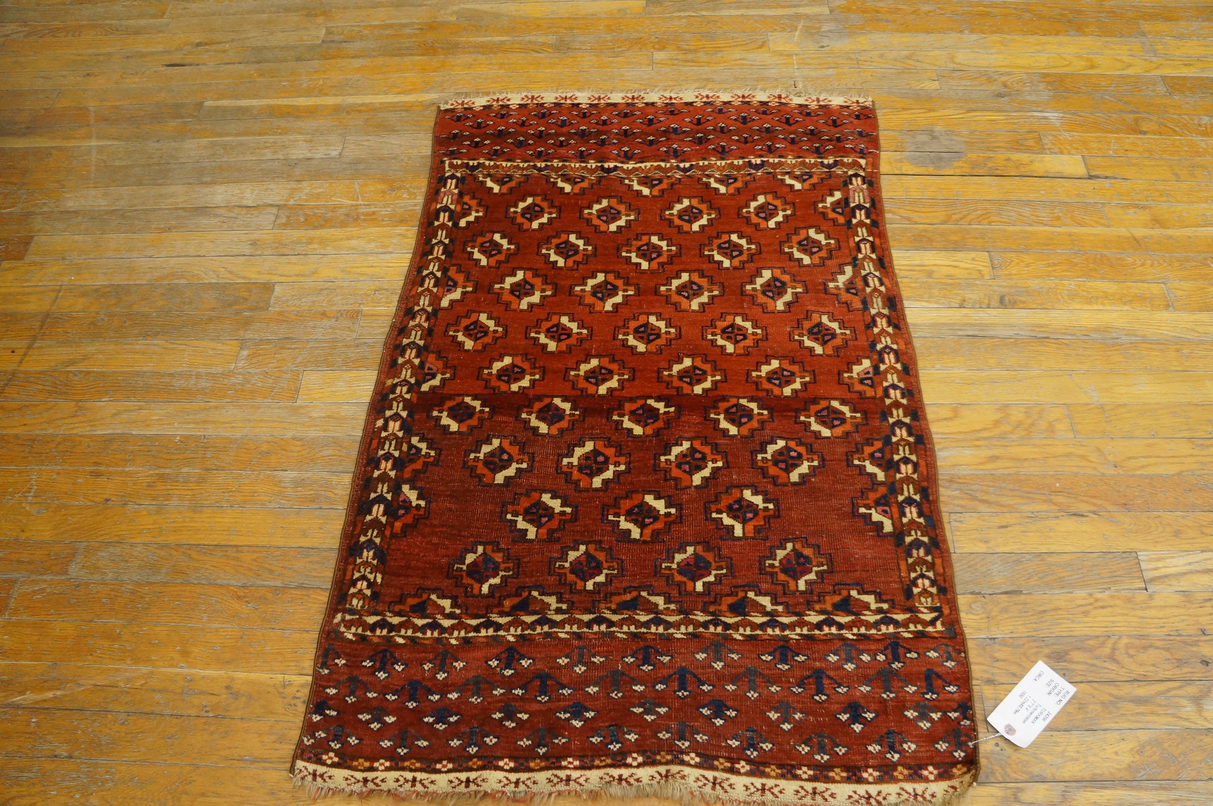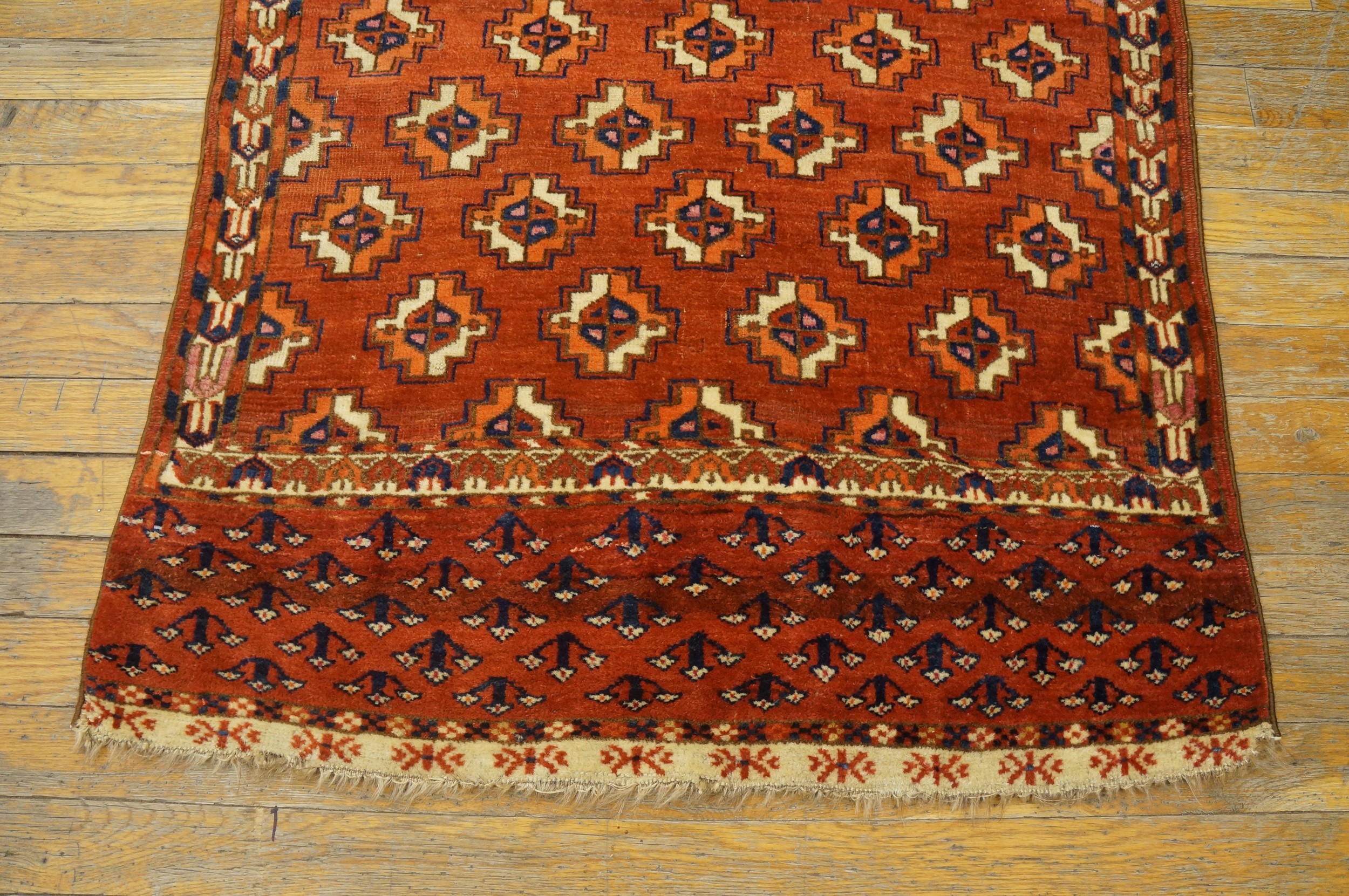 Antique Turkmen Turkmenistan Geometric Knotted Rug, Circa Date: 1880s. This exceptional example of nomadic weaving hails from the late 19th century, embodying the powerful, disciplined aesthetic of Central Asian tribal art. The dense, durable knotting and rich wool quality are hallmarks of the finest antique rugs produced during this era.