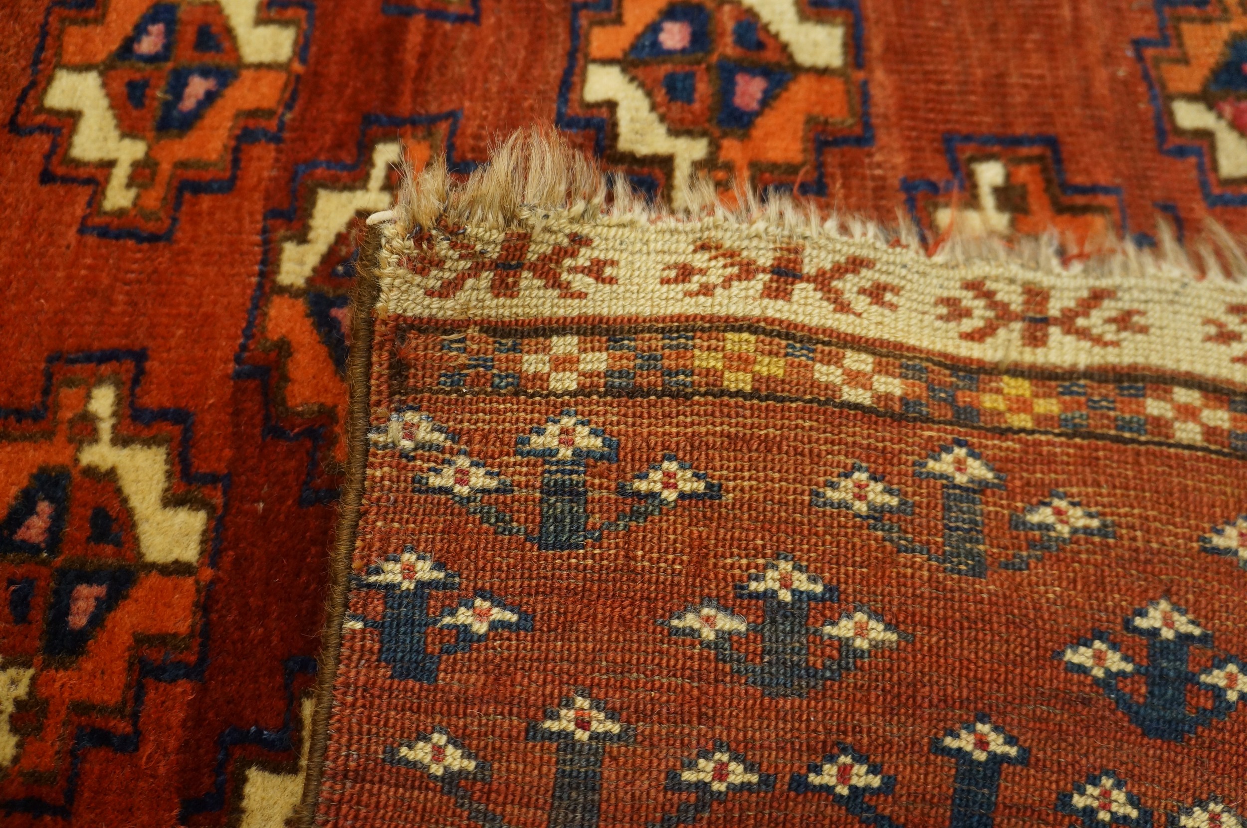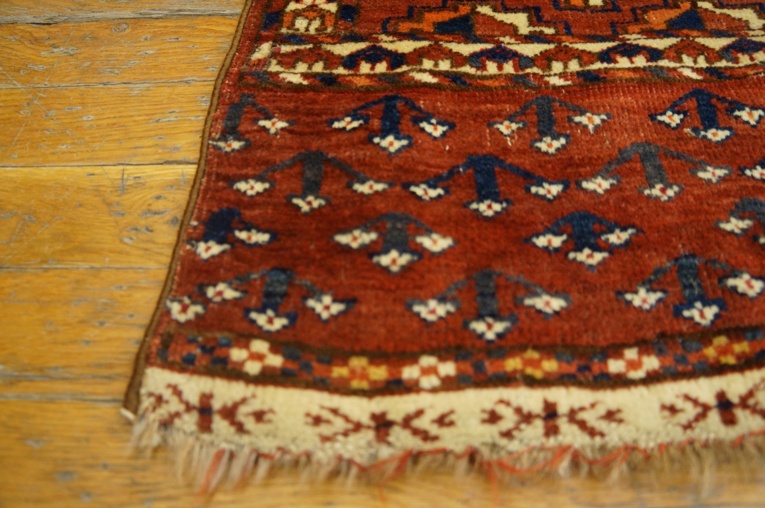 Characteristic of Turkmen weaving, the structure is tightly executed, resulting in a low pile and a remarkably crisp delineation of the complex geometric forms. The multiple minor borders frame the central design effectively, utilizing small, repeating elements that reinforce the rug’s overall rhythm and symmetry.