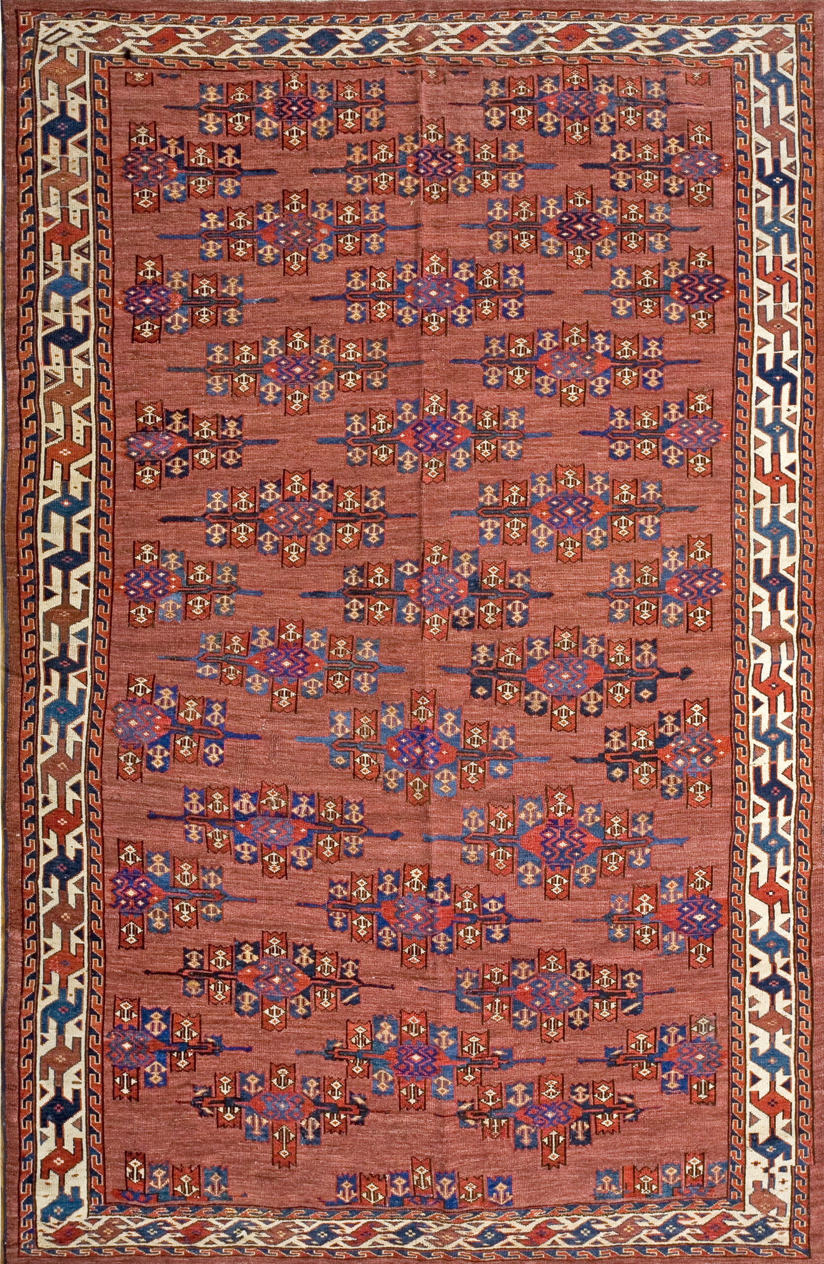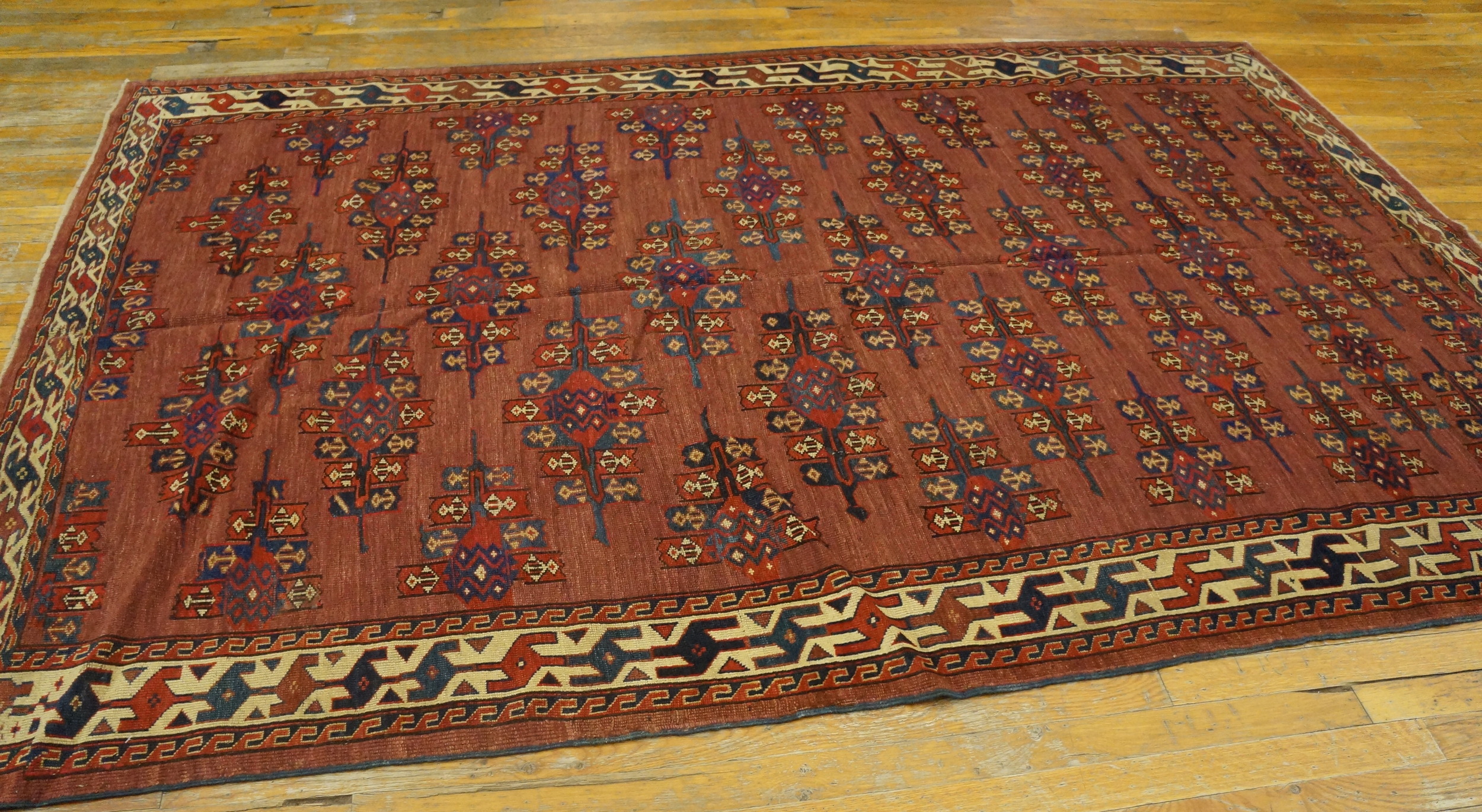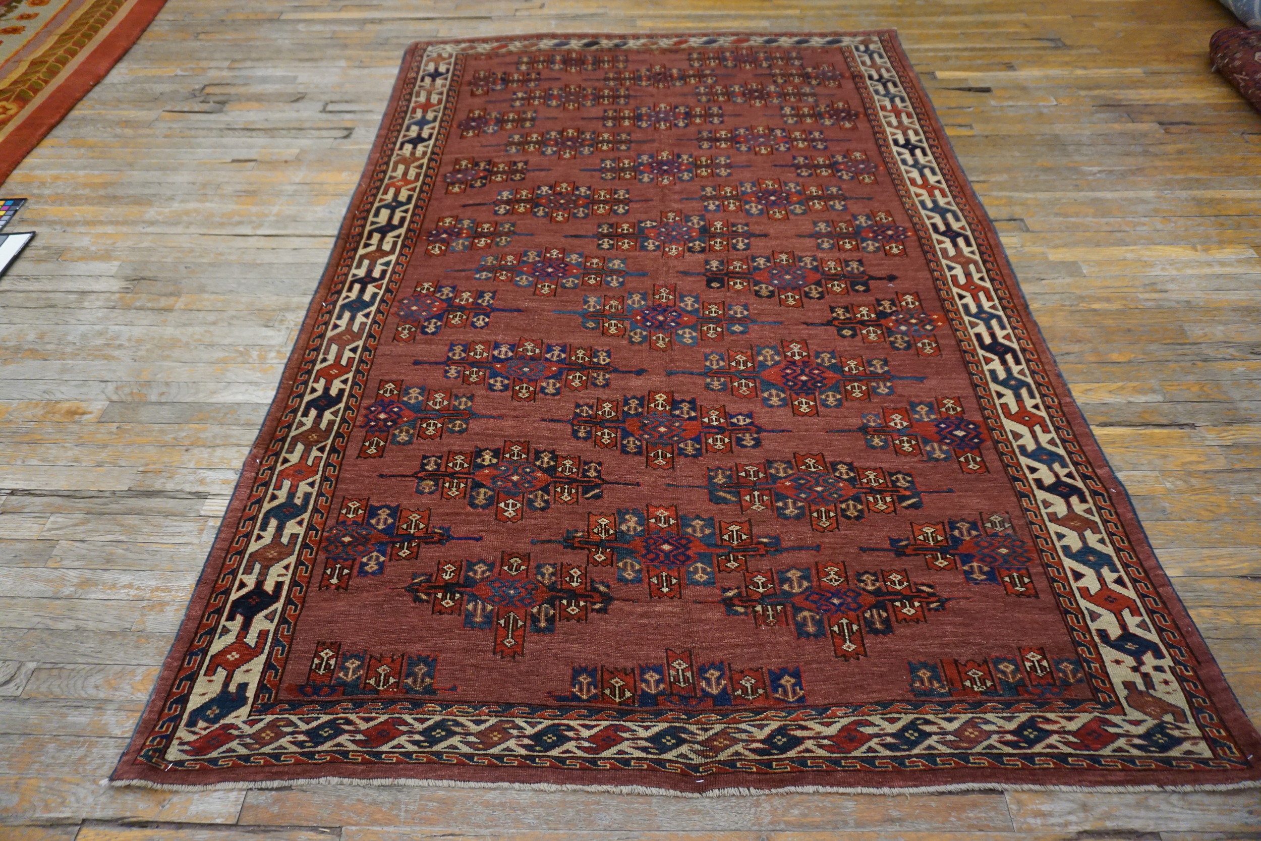 Antique Turkmen – Yamoud Turkmenistan Knotted Rug, Circa Date: 1870s. This exceptional example of nomadic weaving originates from the Yamoud tribe, highly regarded for their meticulous knotting techniques and powerful geometric artistry found across many antique rugs. The dense wool pile and rich, saturated dyes speak to the enduring quality of 19th-century tribal production.
