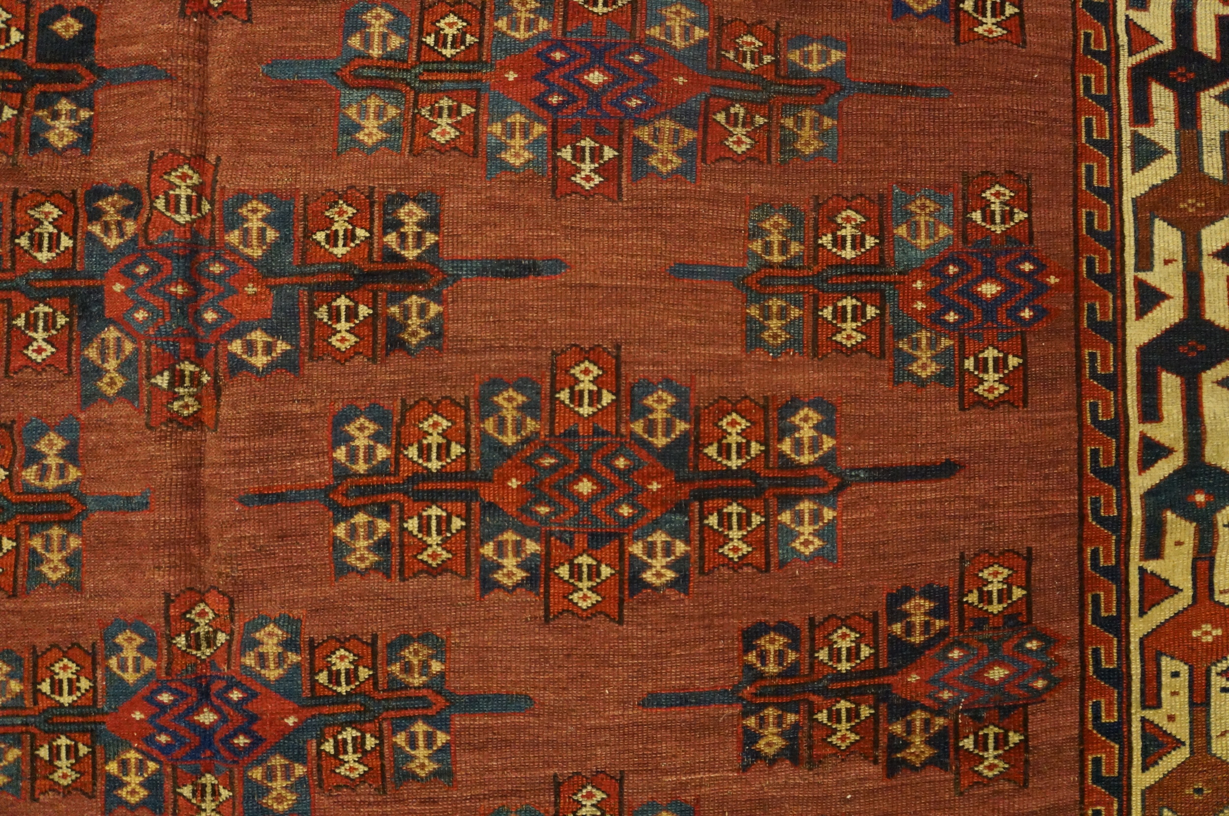 Characteristic of the Yamoud tradition, the design employs a highly structured, repeating gul pattern, creating an impressive visual rhythm. These stylized, shield-like motifs are distributed evenly across the surface in an allover pattern, reflecting the weaver’s mastery of complex, repeating symmetry within a confined space.