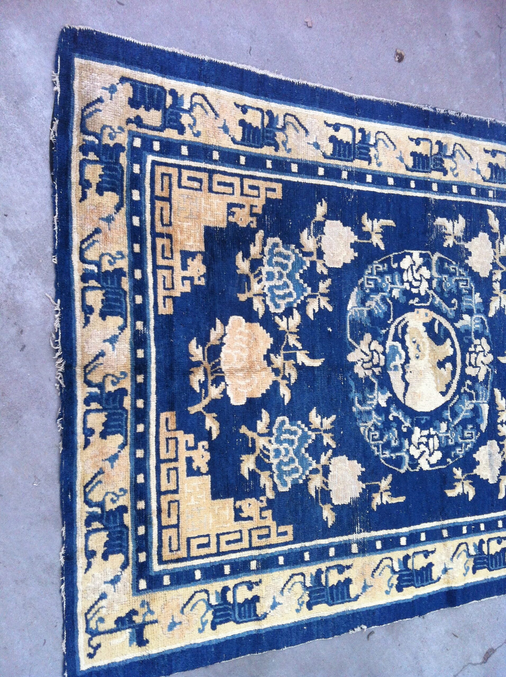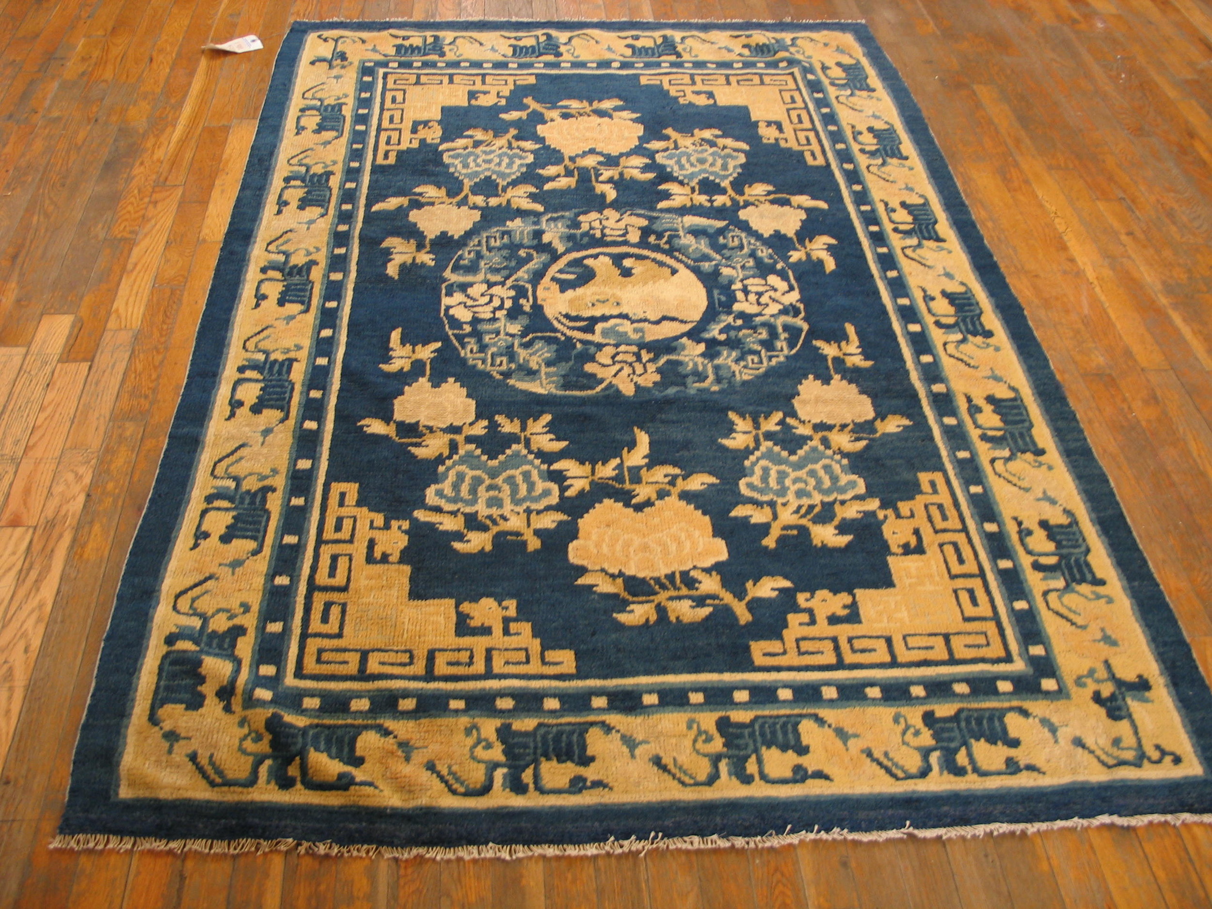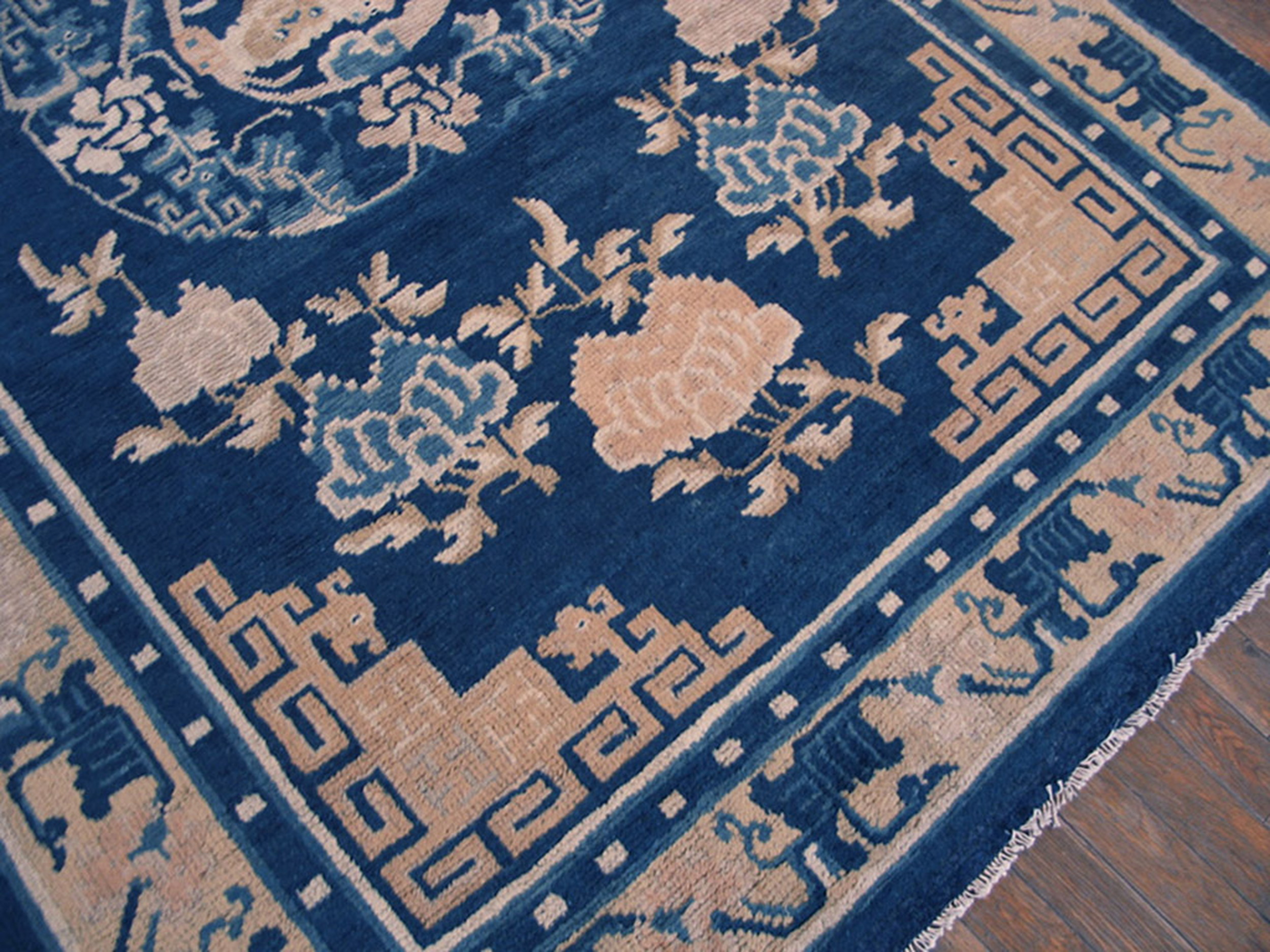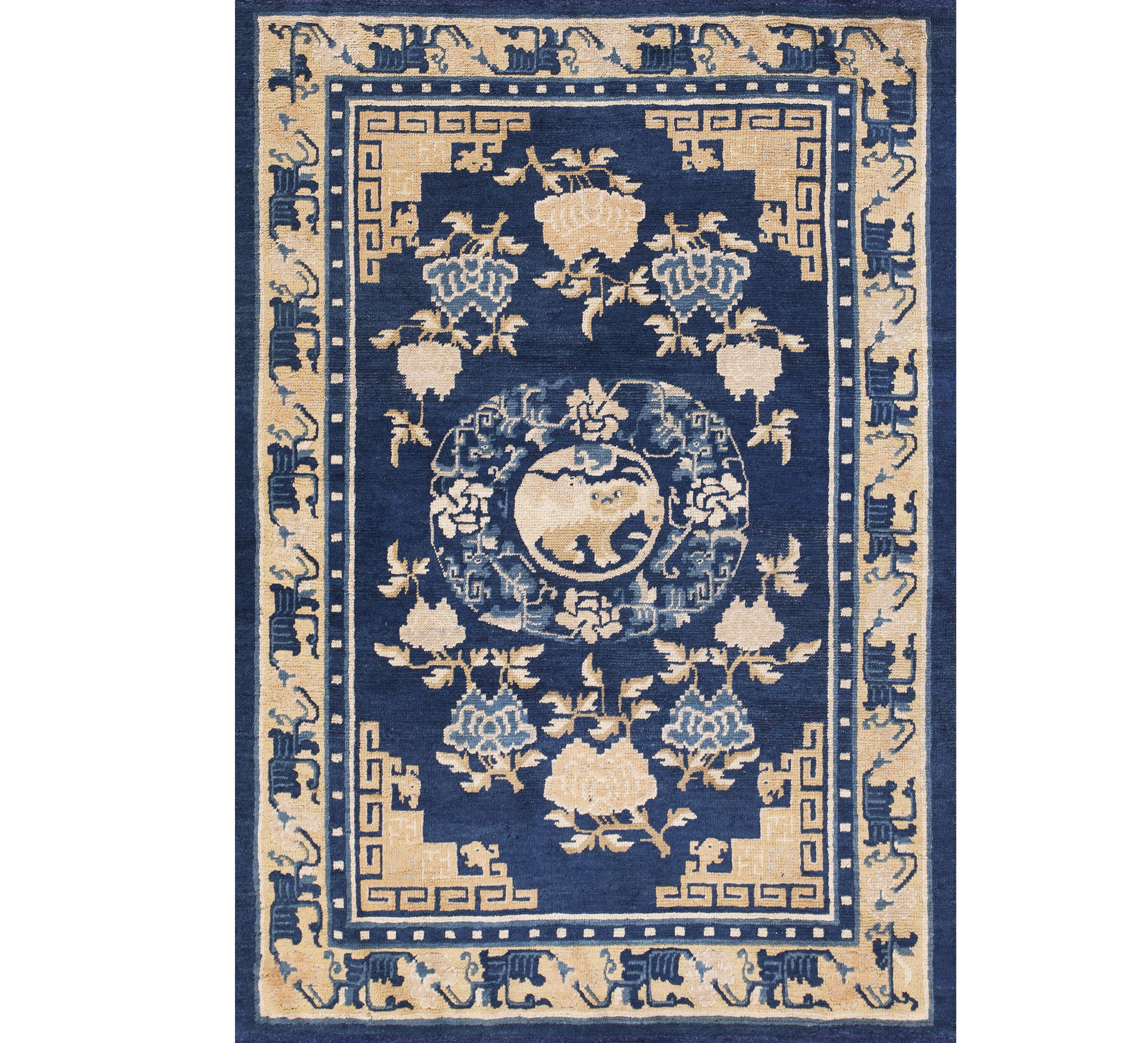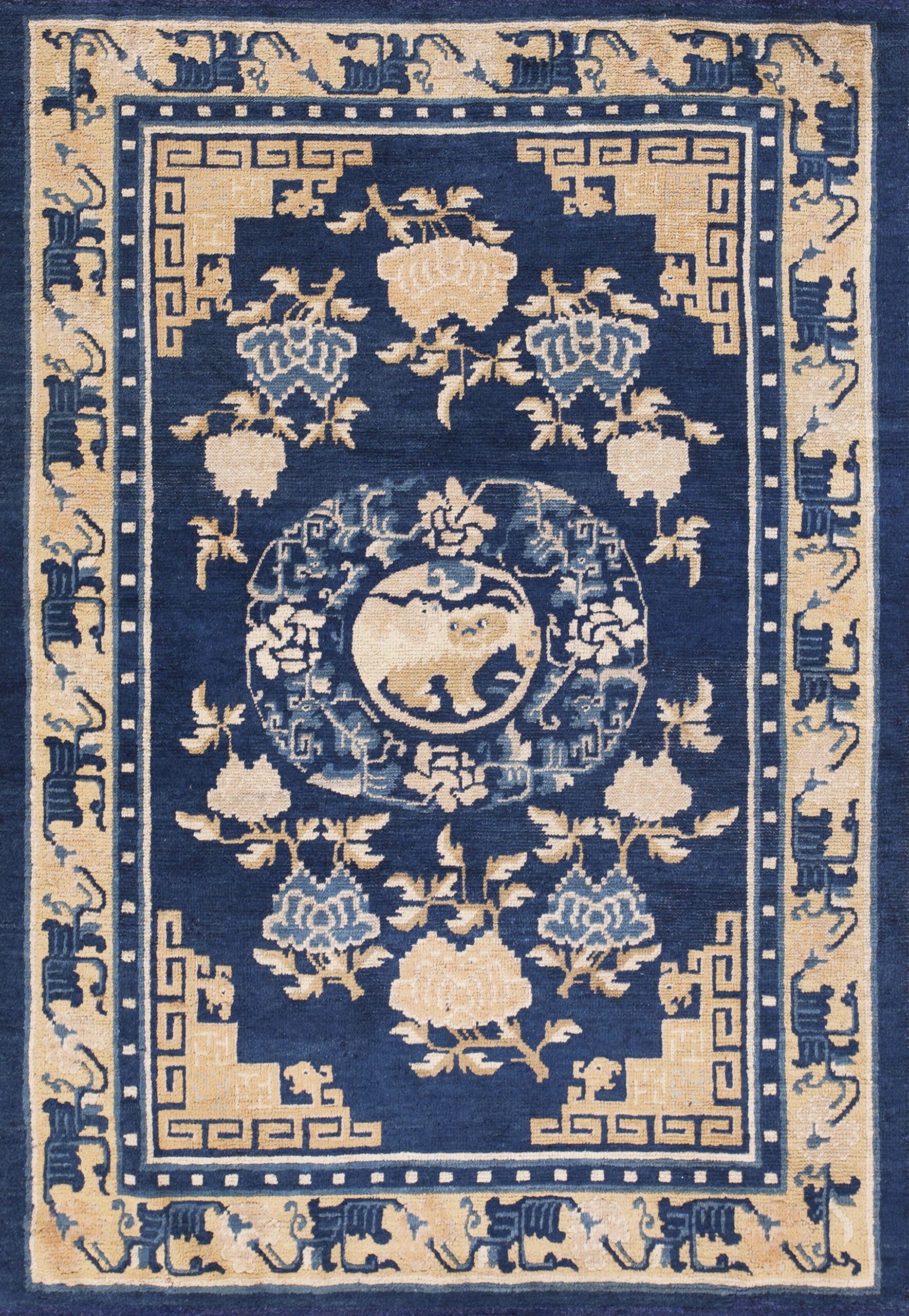 The field is saturated with a rich, natural indigo, a hallmark of fine 19th-century Chinese production. This deep, almost midnight blue color rugs foundation provides a dramatic backdrop for the contrasting camel and ivory motifs, creating an immediate visual impact that transcends typical decorative pieces.