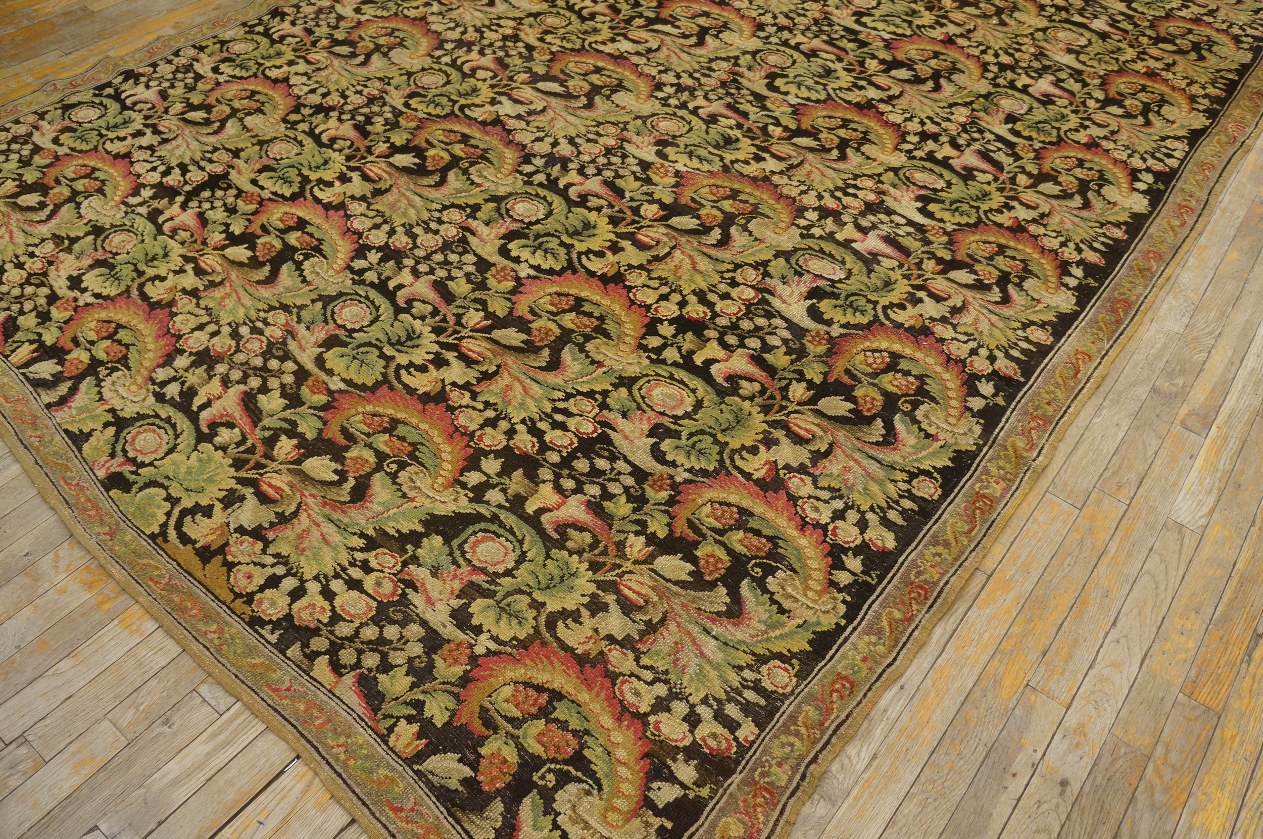 The field is dominated by a dense, continuous allover design featuring lush scrolling acanthus leaves and tightly clustered floral sprays. This intricate composition avoids a central medallion, allowing the eye to wander across the entire surface, creating a sense of boundless natural growth. The execution suggests a European court influence, likely drawing inspiration from French Savonnerie styles.