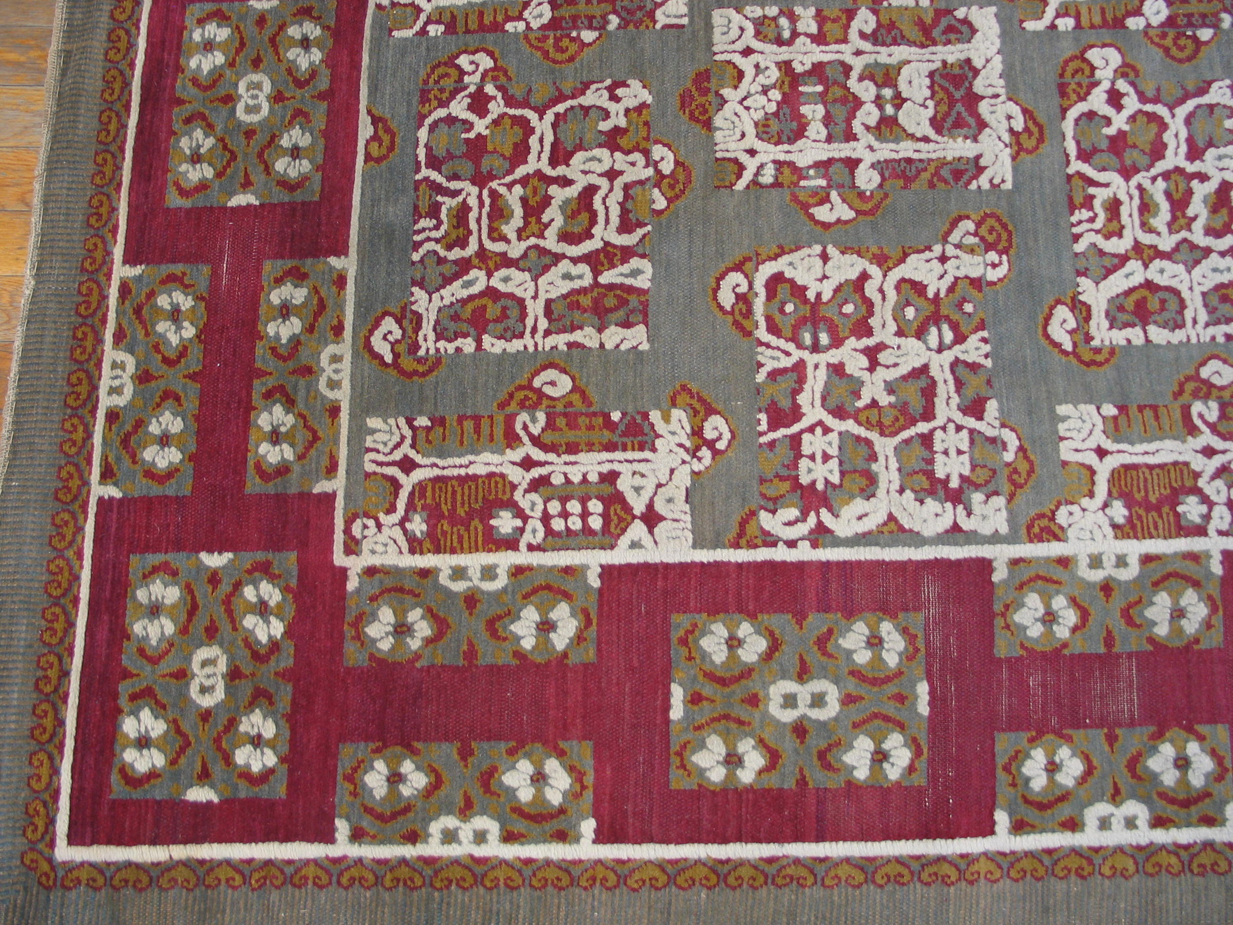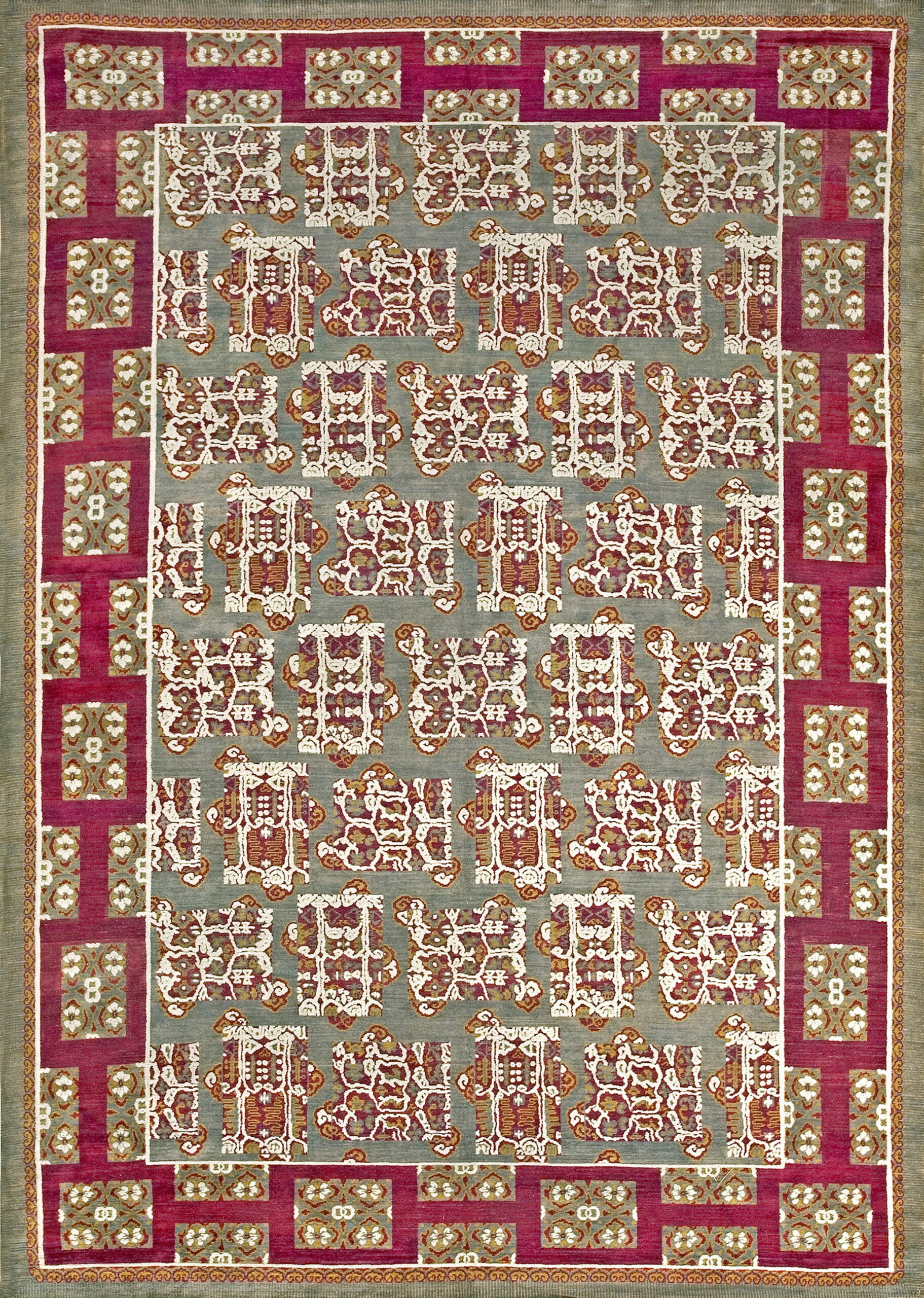 The palette is dramatically rendered, featuring a field dominated by a sophisticated, muted blue-gray color that provides a cool, grounding base. This subtle tone is powerfully contrasted by the use of deep magenta and cranberry hues in the wide border and stylized internal motifs, creating a visual tension that is both modern and historically authentic.