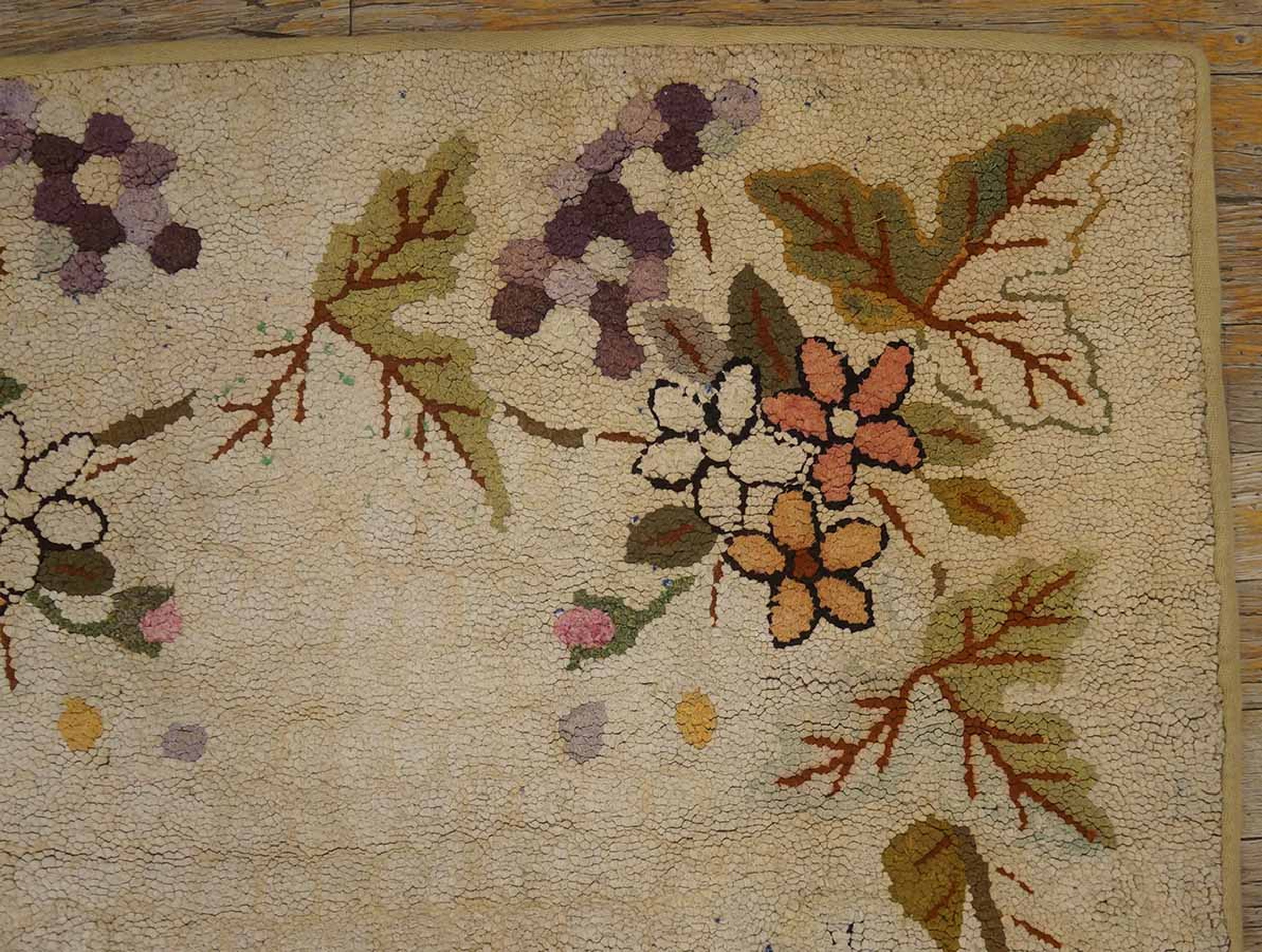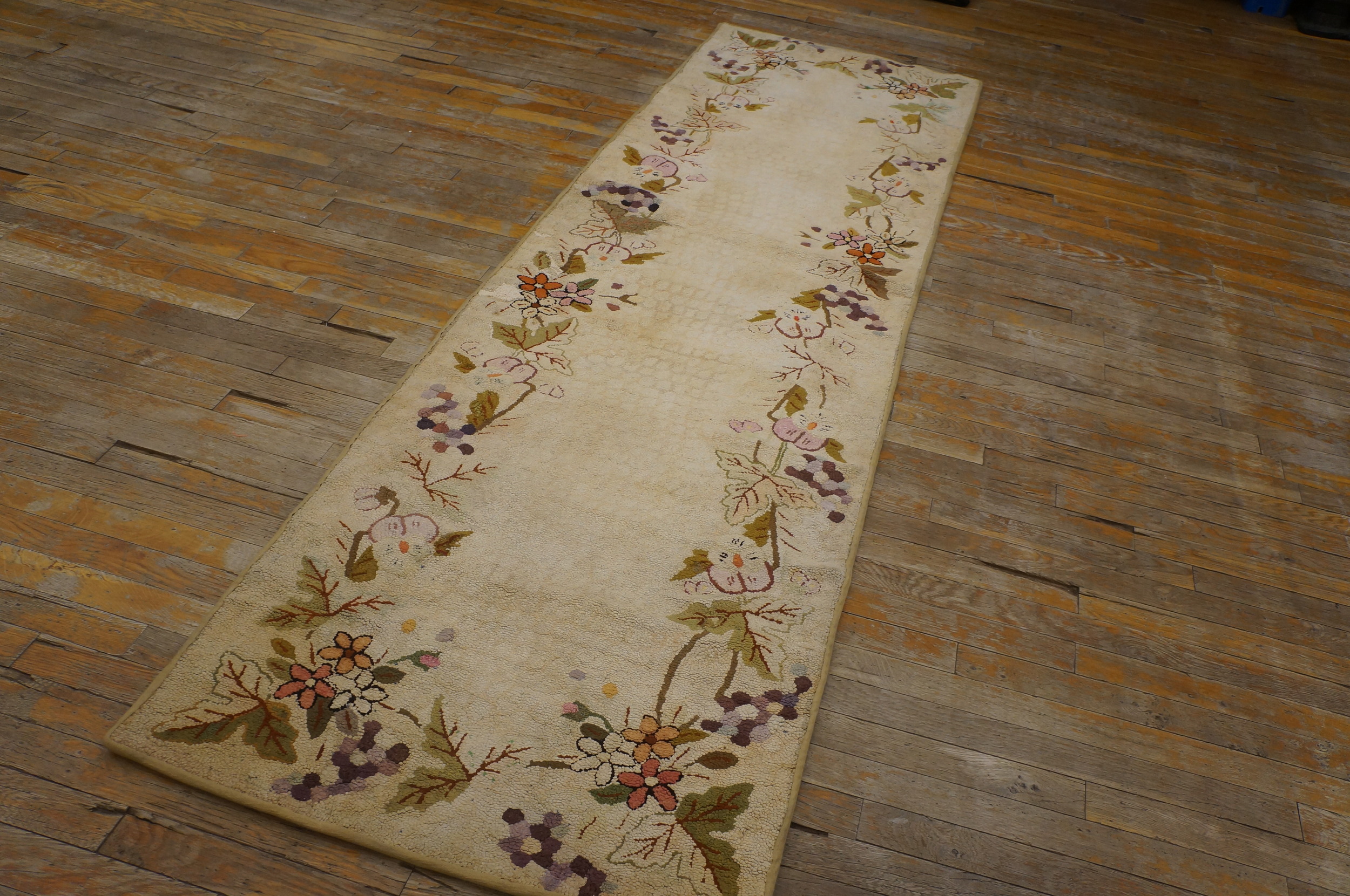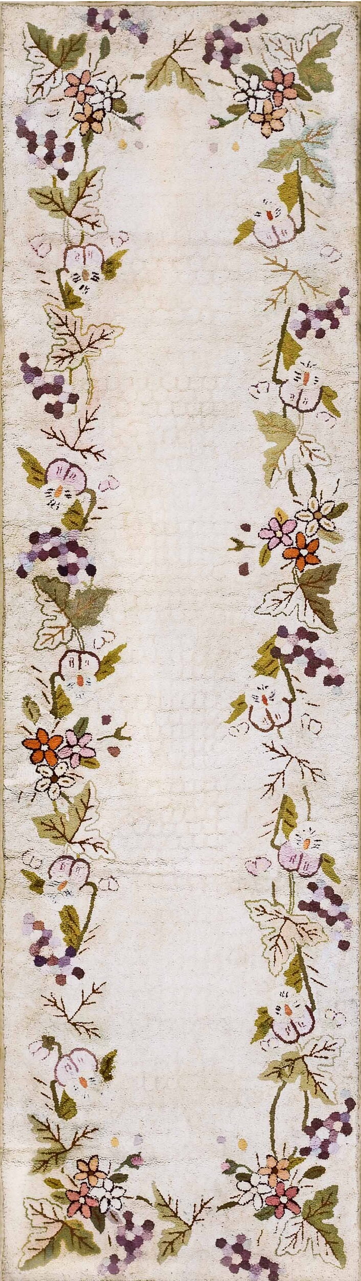 Hallway Runner Rugs (2.06ft x 9ft), Circa Date: 1930s. This exceptional American Hooked Rug exemplifies the domestic textile artistry prevalent during the Depression era, offering a charming and textural interpretation of traditional design. The foundation is a soft, luminous field of ivory wool, characteristic of the era's preference for light, airy interiors.