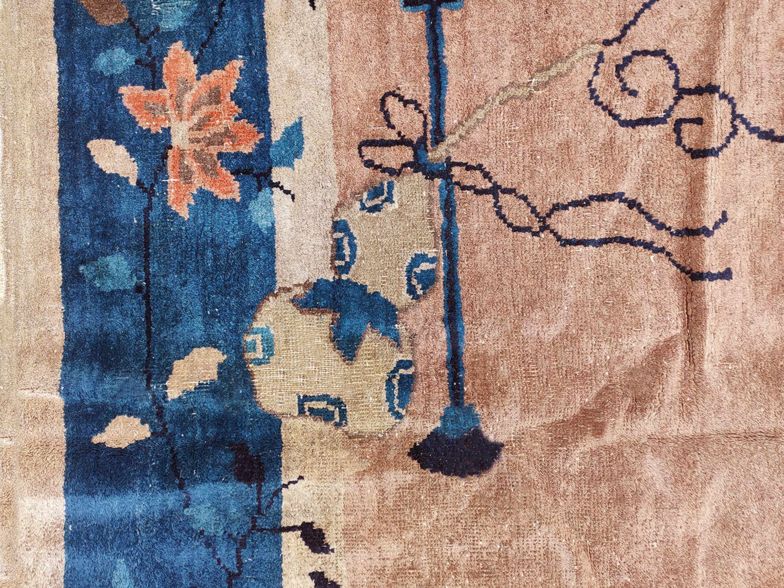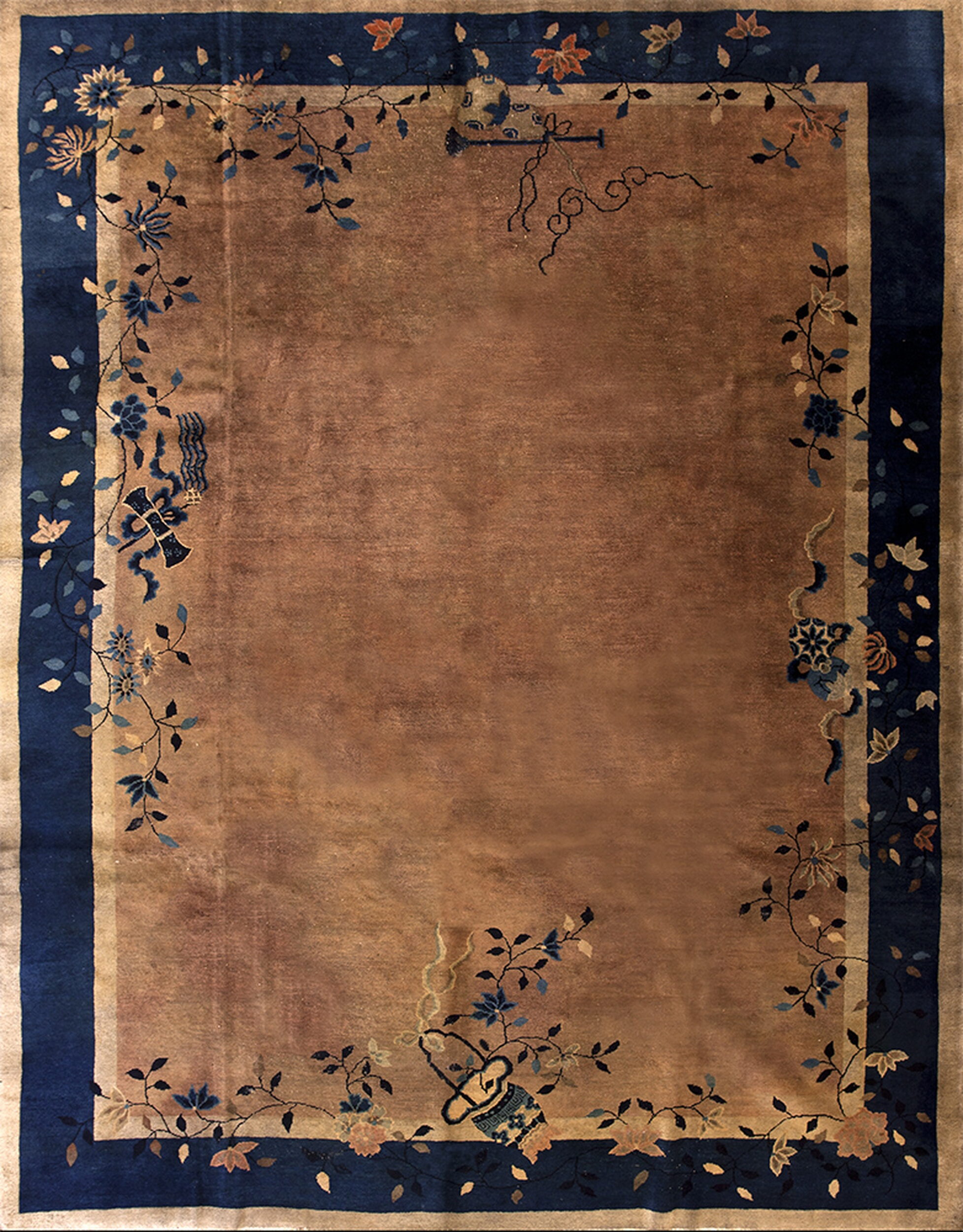 Instead of dense, repetitive patterns, the design utilizes sparse, trailing vines and stylized blossoms that gracefully enter the central field from the borders. These delicate floral rugs motifs include chrysanthemums and plum blossoms, rendered with an artistic freedom characteristic of the Art Deco movement, providing visual interest without cluttering the expansive central plane.