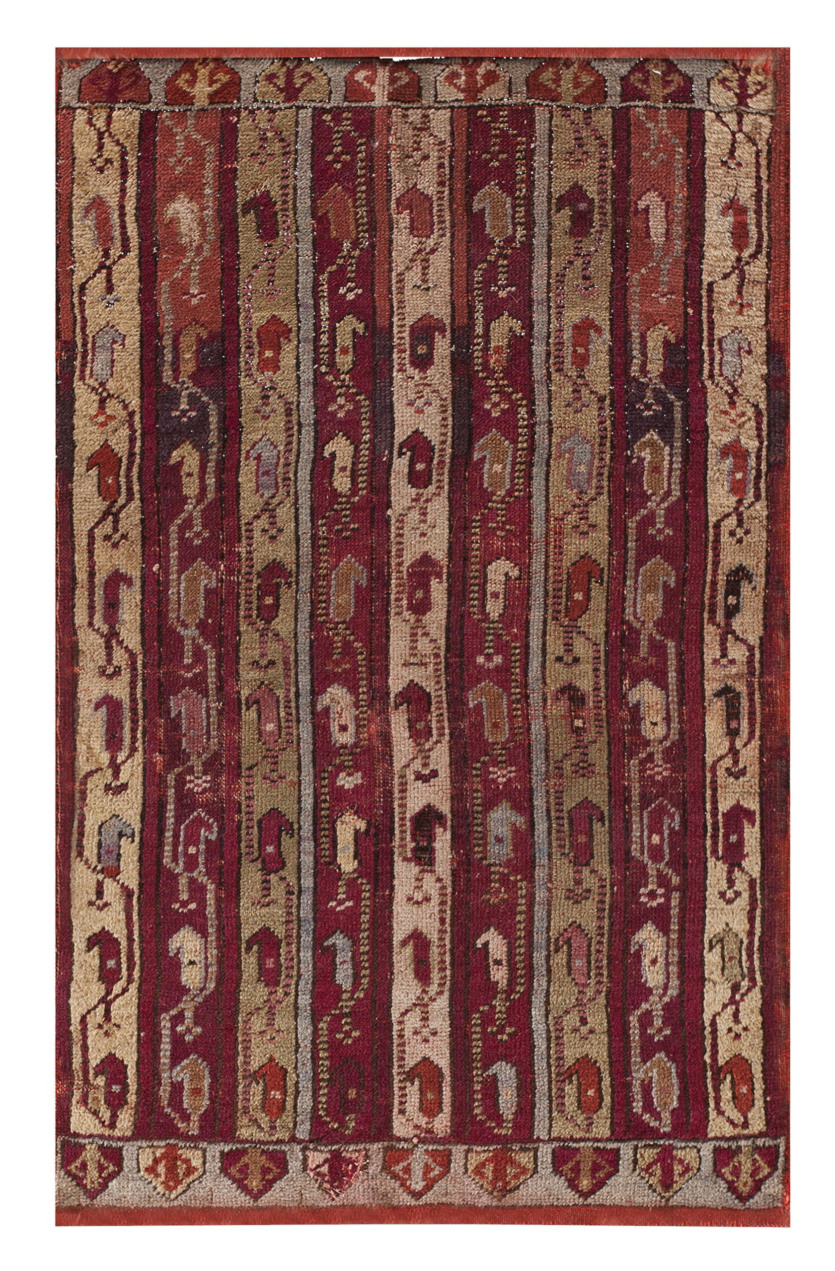 The palette is rich and saturated, dominated by deep madder reds and contrasting ivory stripes, punctuated by smaller, jewel-toned elements. This striking vertical design creates a powerful visual rhythm, utilizing an allover rugs structure that maximizes the impact of the narrow format. The use of natural dyes results in a mesmerizing array of multicolor jewel tone rugs that shifts subtly depending on the light.