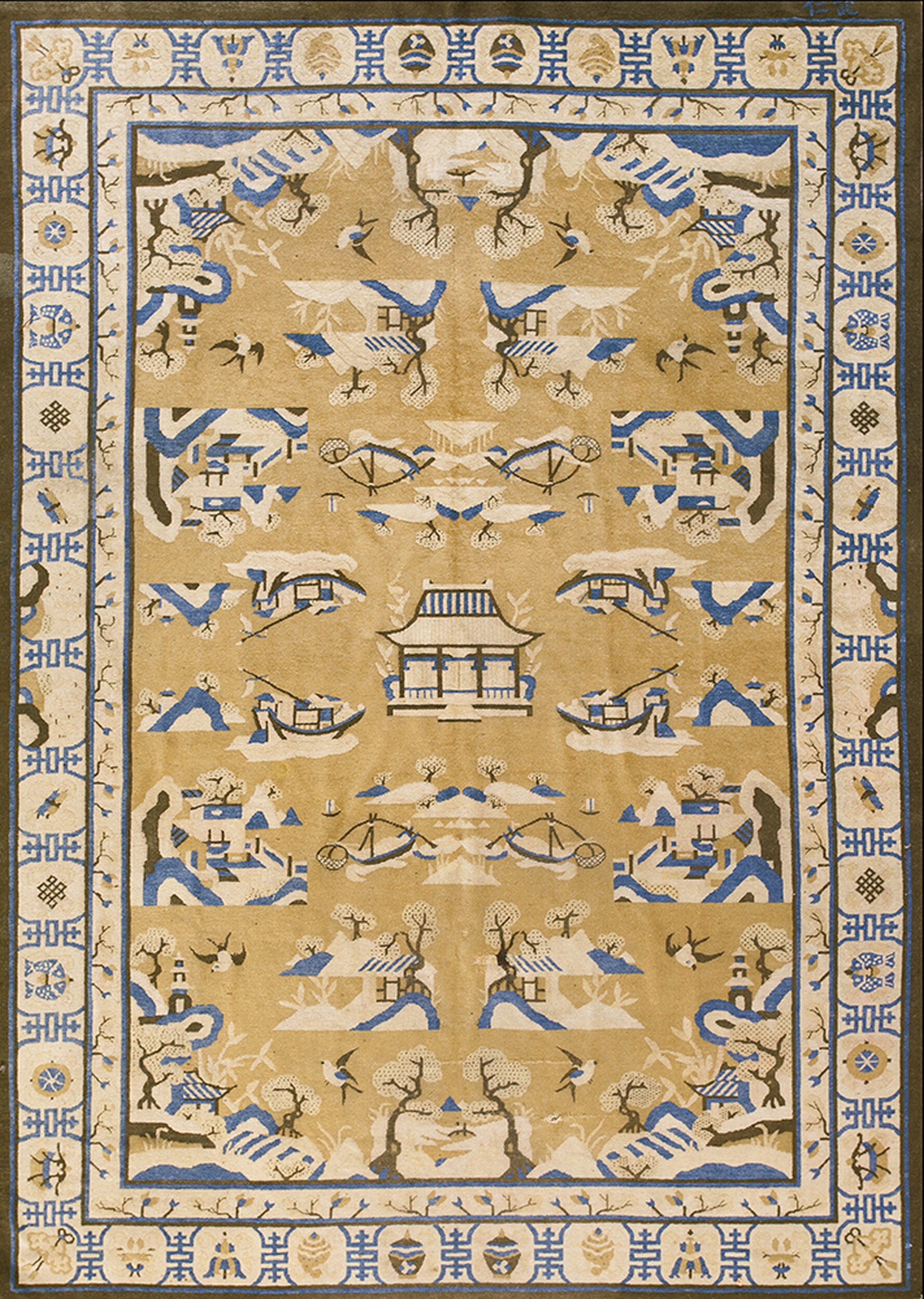 The central field is saturated with a remarkable, aged yellow hue, placing it among the most desirable gold yellow orange color rugs of the period. This luminous ground provides a striking canvas for the pictorial elements rendered in crisp indigo and ivory. The design is rich with traditional symbolism, including stylized pagodas and bows and arrows, interspersed with delicate flowering trees and flying swallows.