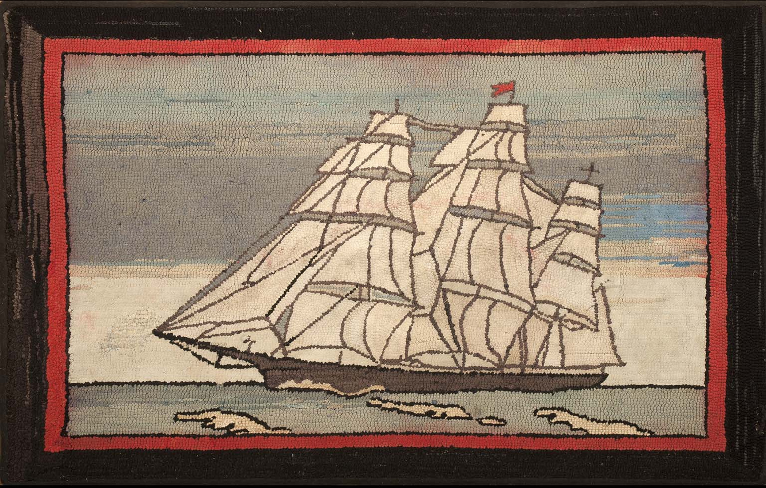While primarily pictorial, the underlying structure of the design, particularly the stark framing and the linear delineation of the sails and rigging, exhibits strong geometric rugs characteristics. This balance between narrative imagery and structured form elevates the textile beyond simple craft, offering a sophisticated piece of Americana that remains highly collectible today.