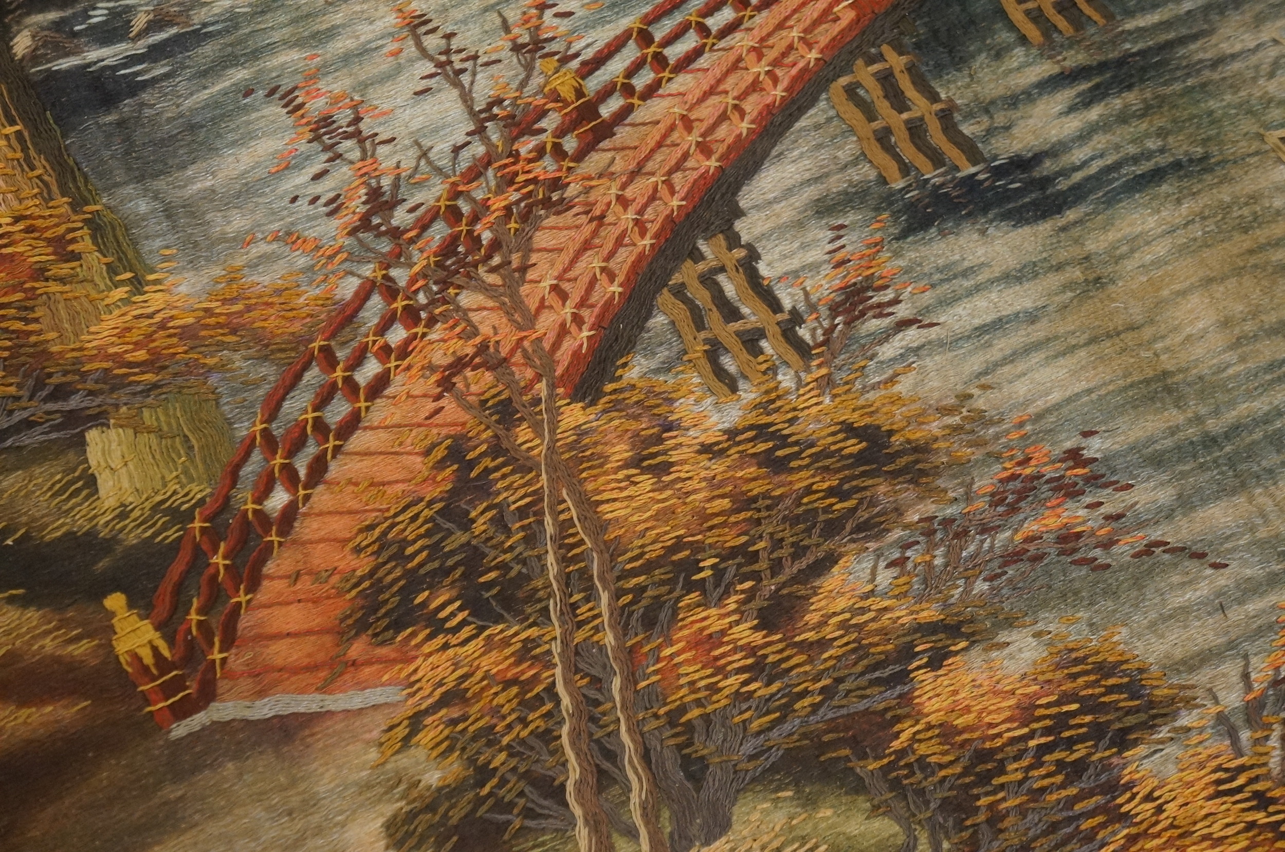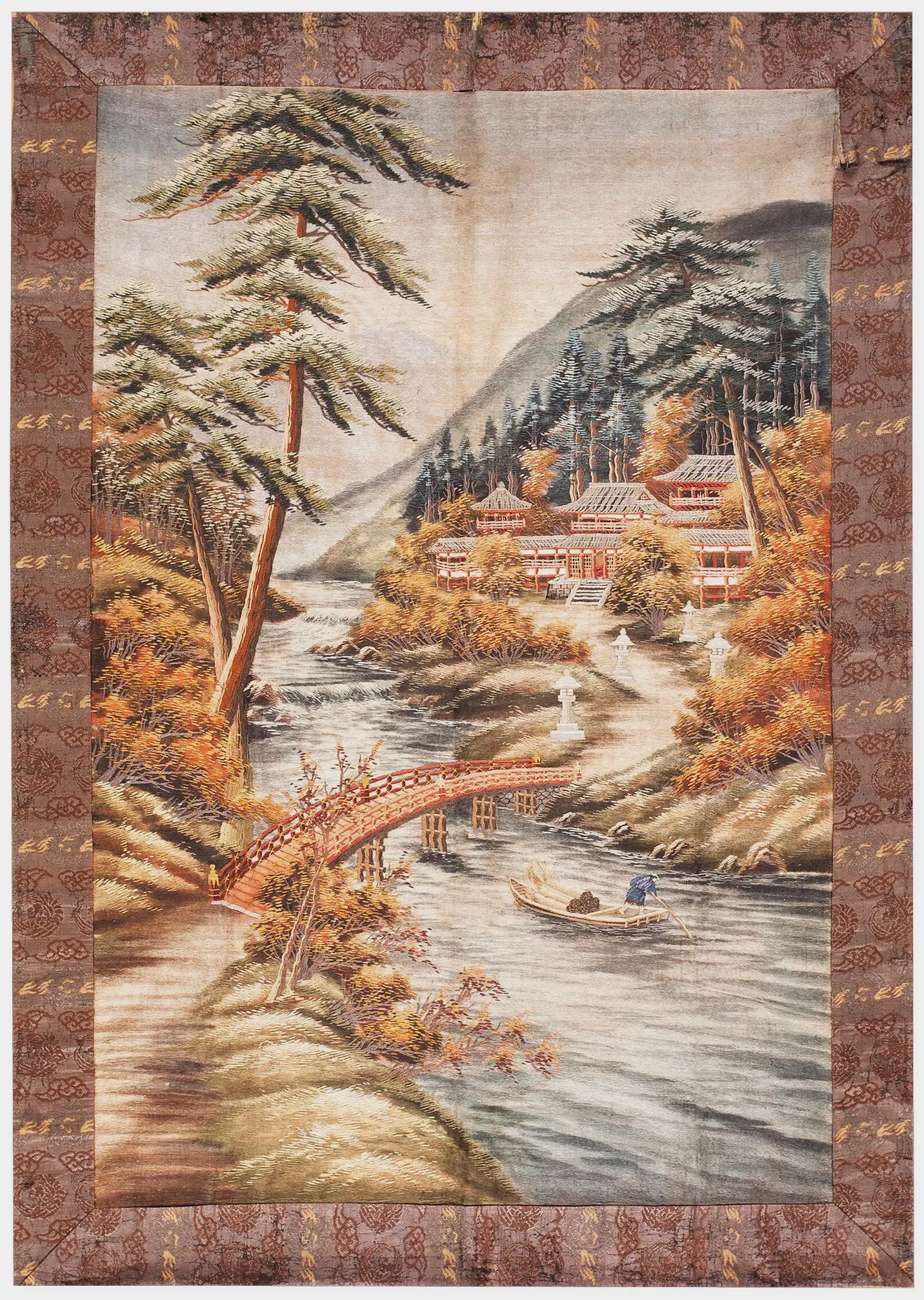 The central field presents a sublime, naturalistic landscape, characteristic of traditional Chinese painting. A rushing river flows beneath a delicate arched bridge, leading the eye toward a cluster of traditional red-roofed buildings nestled into the misty hillside. The palette is complex and rich, utilizing a sophisticated range of blues, greens, and autumnal ochres, resulting in a stunning multicolor jewel tone effect that shifts depending on the light.