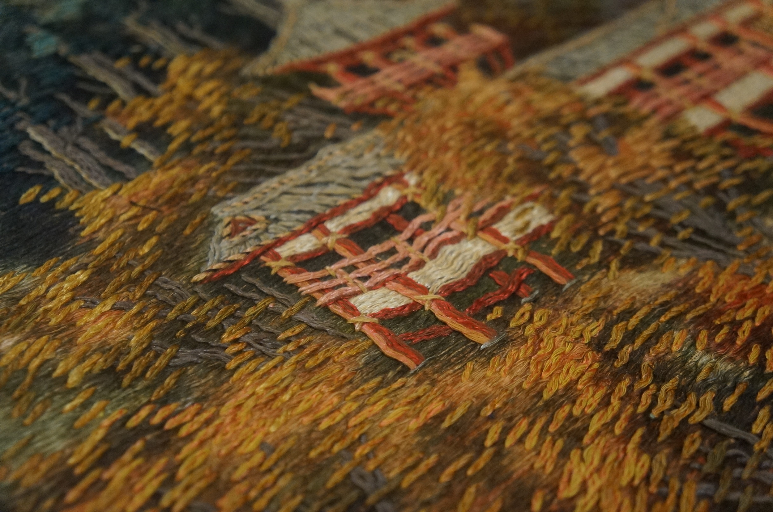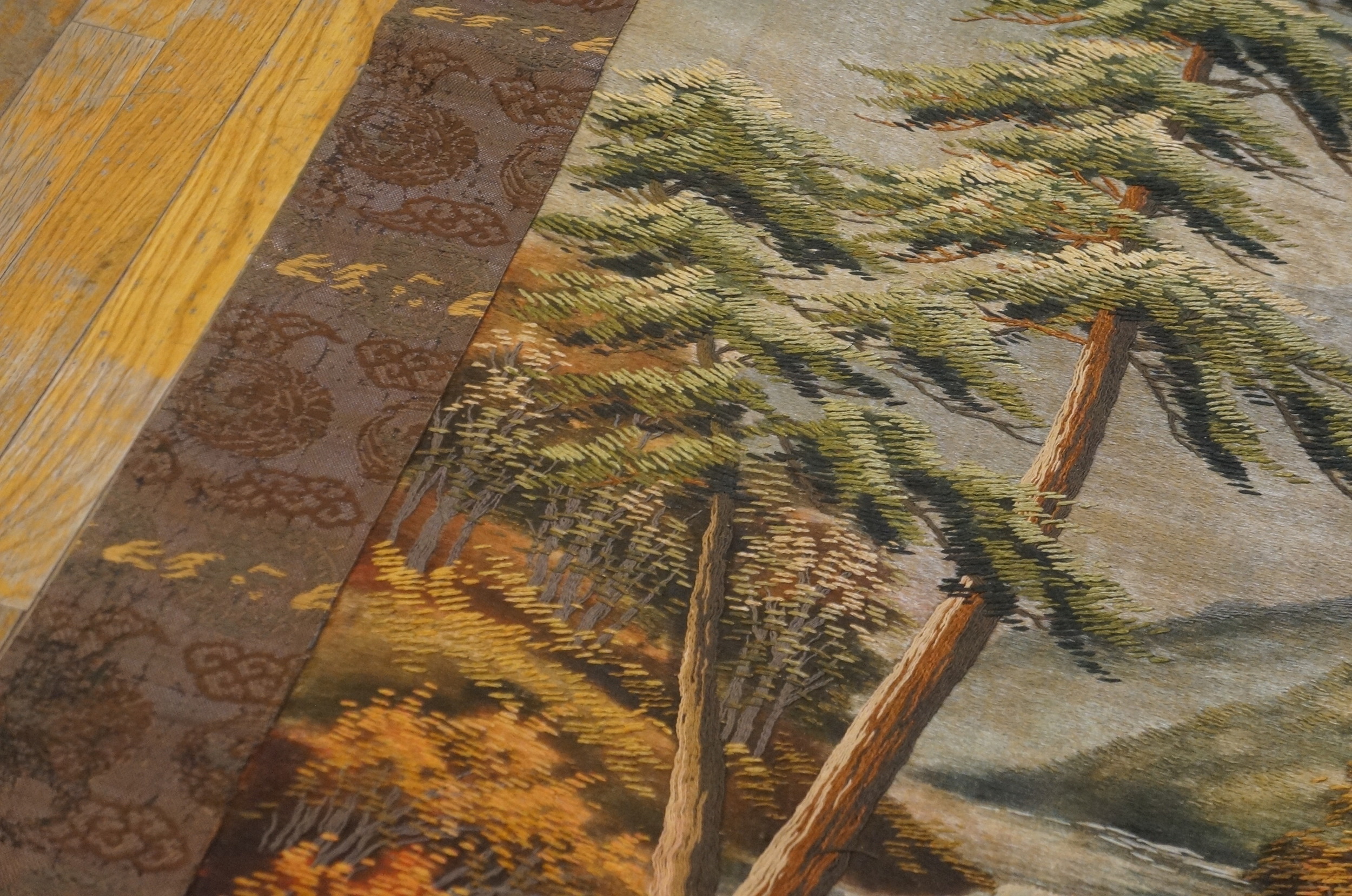 Unlike many contemporaneous designs that relied on geometric abstractions, this composition is entirely devoted to realistic representation, though it still incorporates traditional symbolic elements. The presence of mature pine trees and stylized cloud bands in the border subtly references longevity and good fortune. While the main scene is a landscape, the surrounding elements incorporate subtle floral rugs motifs and scrolling vines often found in Chinese decorative arts.