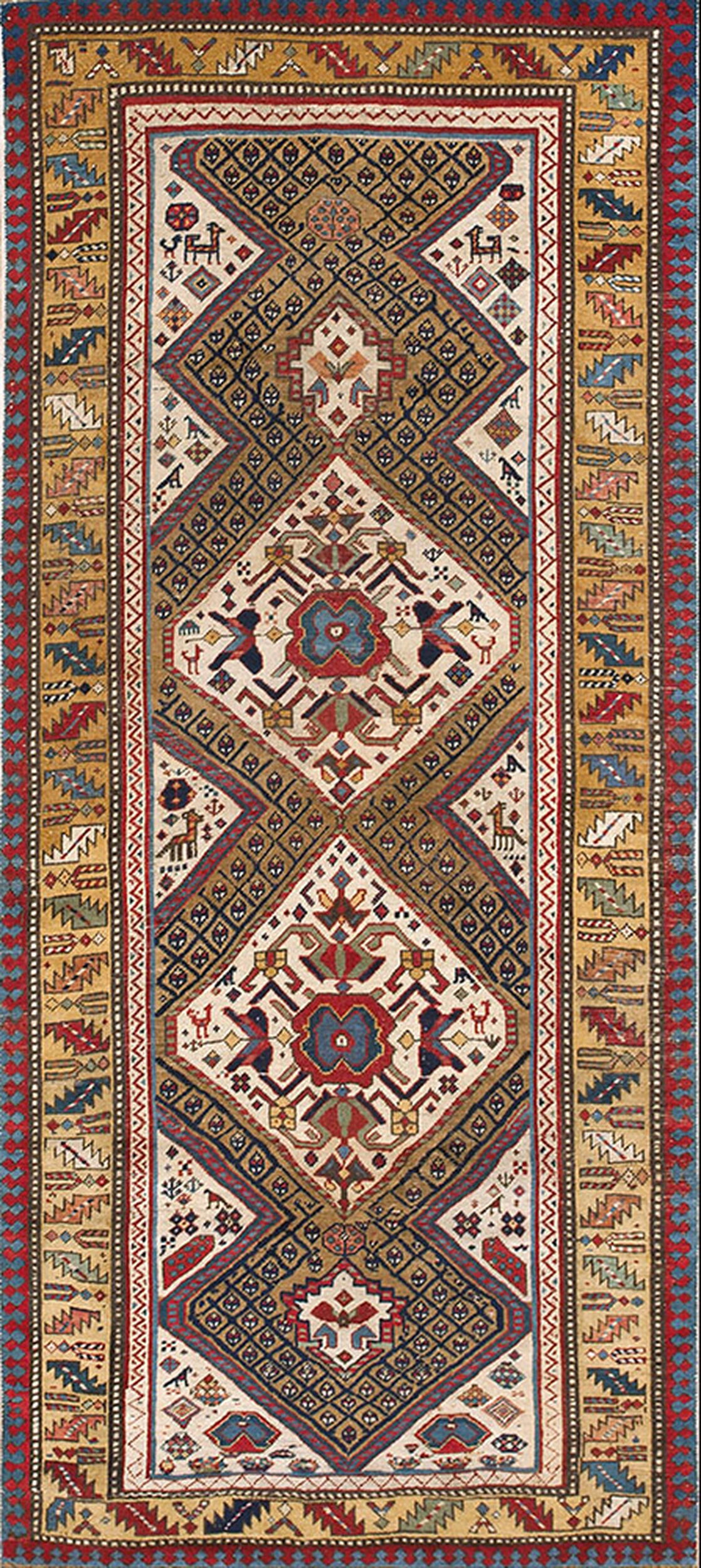 The design is characterized by stacked, stepped diamond medallions set against a light ivory ground. These primary motifs are filled with intricate, stylized animal and human figures, creating a dynamic visual narrative. The overall composition achieves a powerful density, moving beyond a singular central focus toward an allover design sensibility typical of the best 19th-century village weavings.