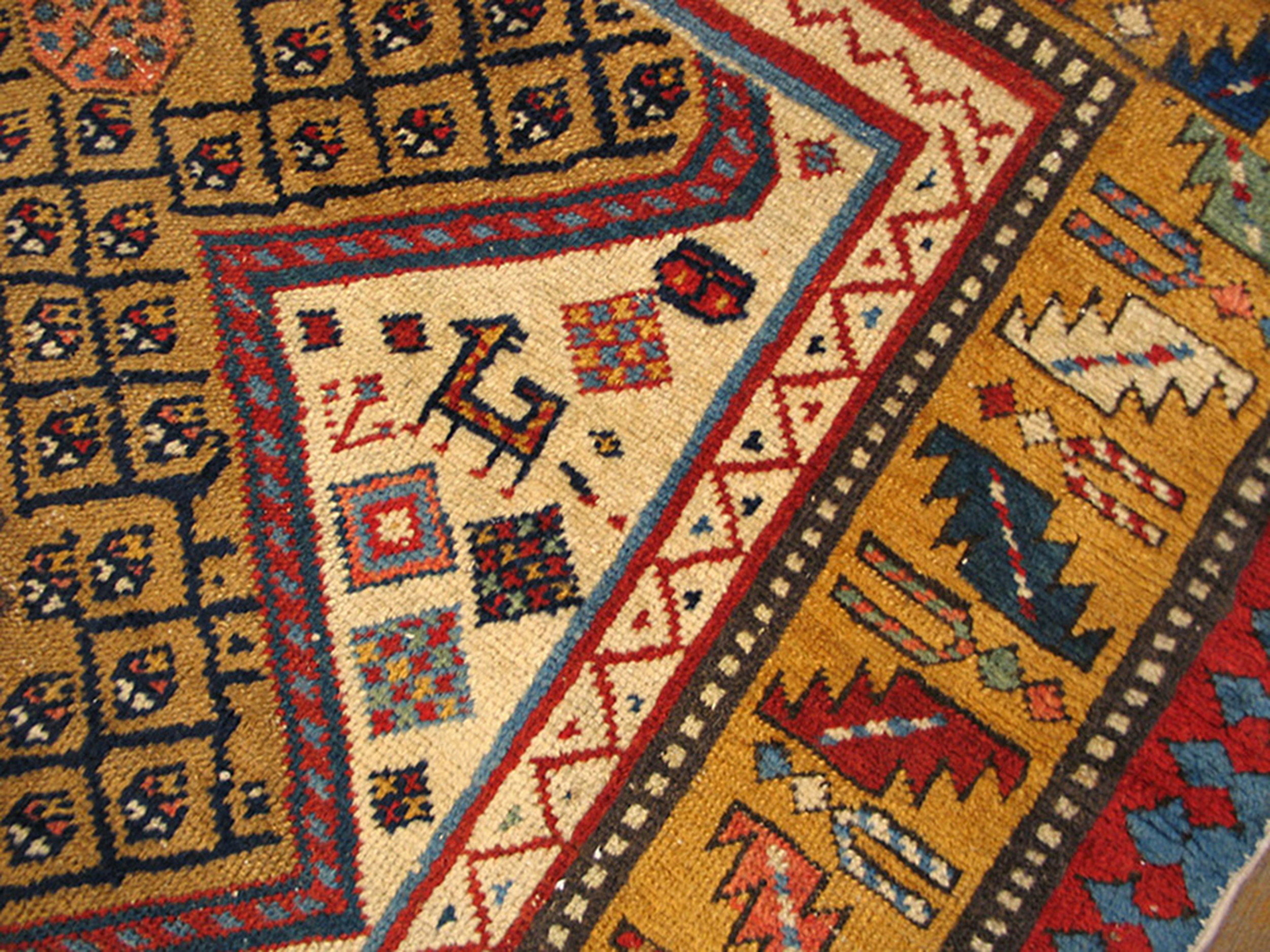 Antique Caucasian Caucasian Multicolor 1870s Rug, Circa Date: 1870s. This exceptional piece exemplifies the finest tribal weaving traditions of the Caucasus region. Its powerful geometric structure and saturated palette define the classic aesthetic of Caucasian rugs, showcasing the raw artistry inherent in nomadic production.